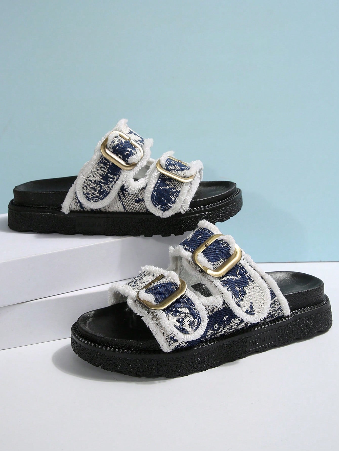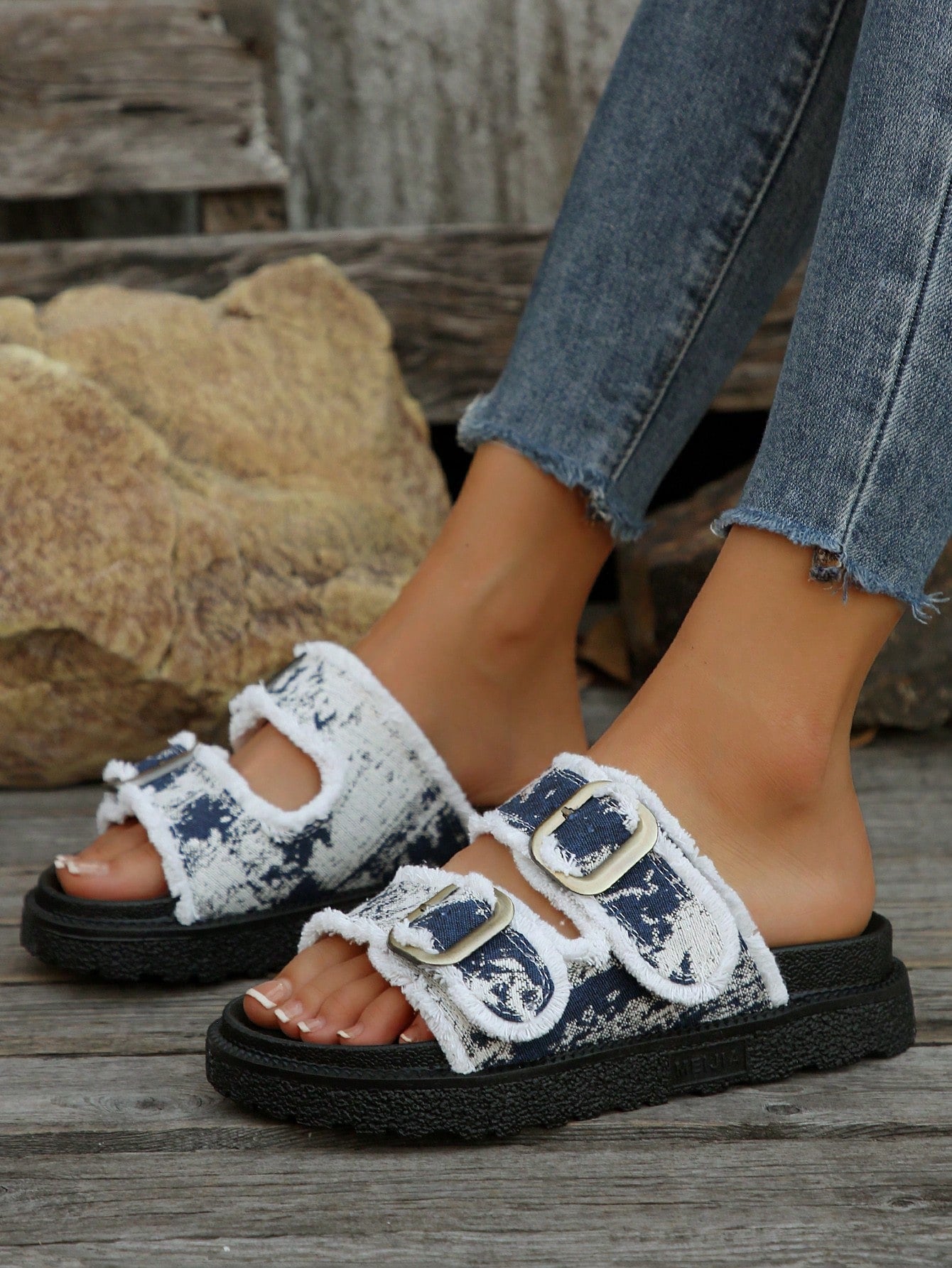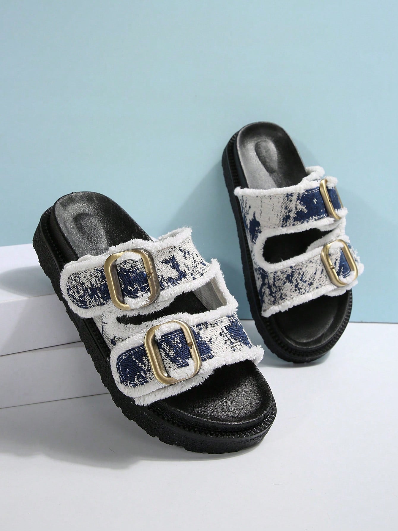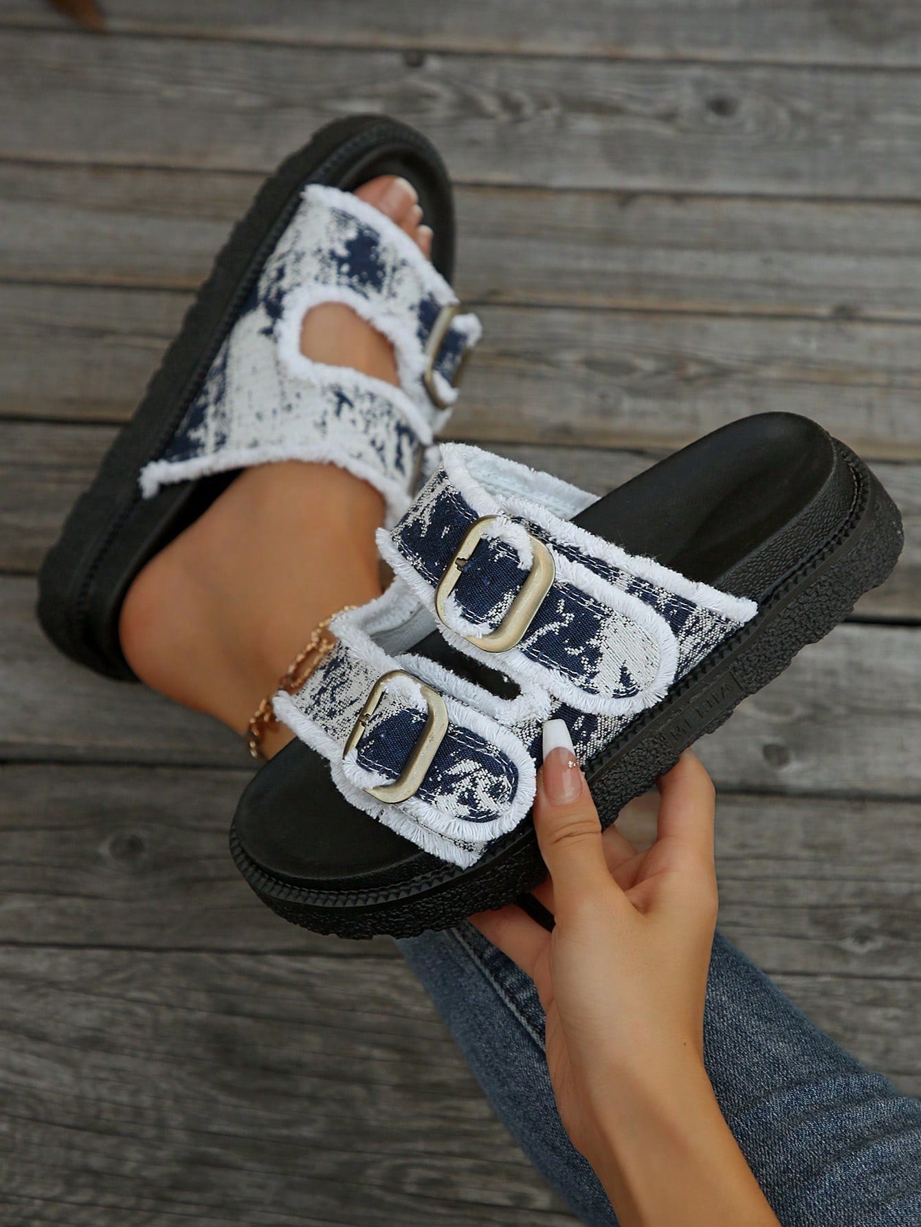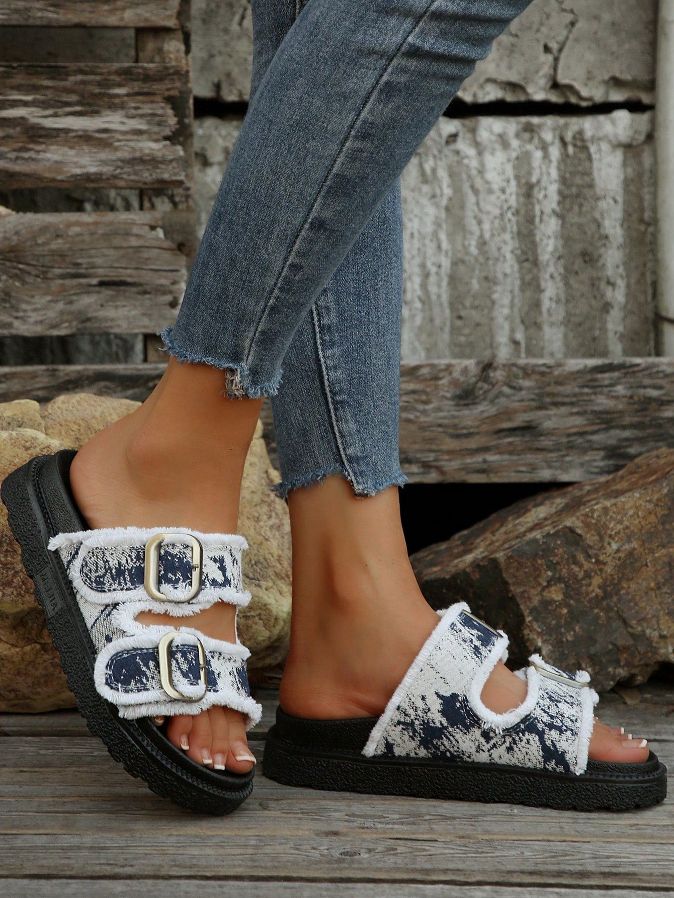 women Women's Fashion Versatile Tie Dye Blue & White Tassel Decor Vacation Style Buckle Wedge Platform Slide Sandals