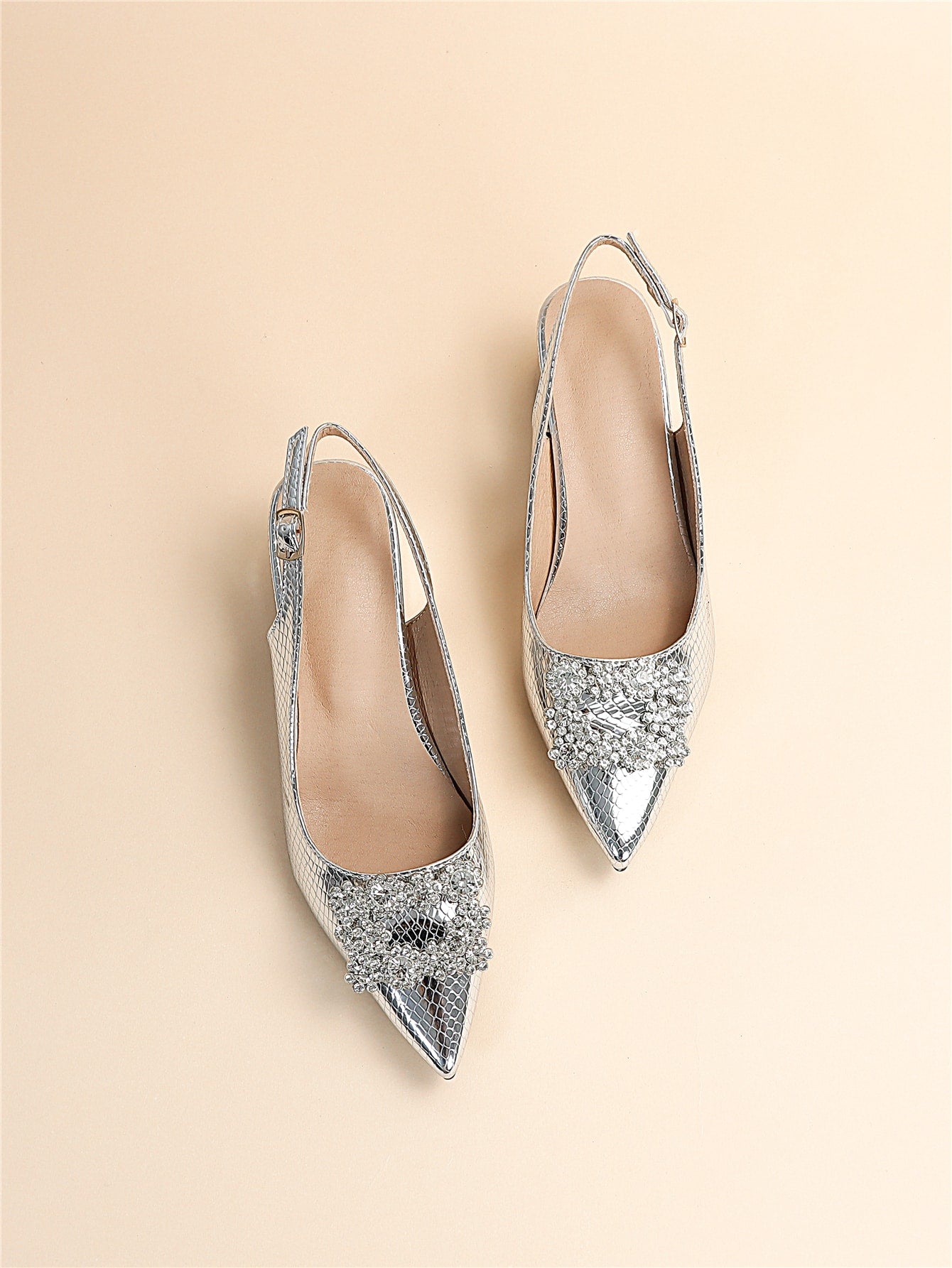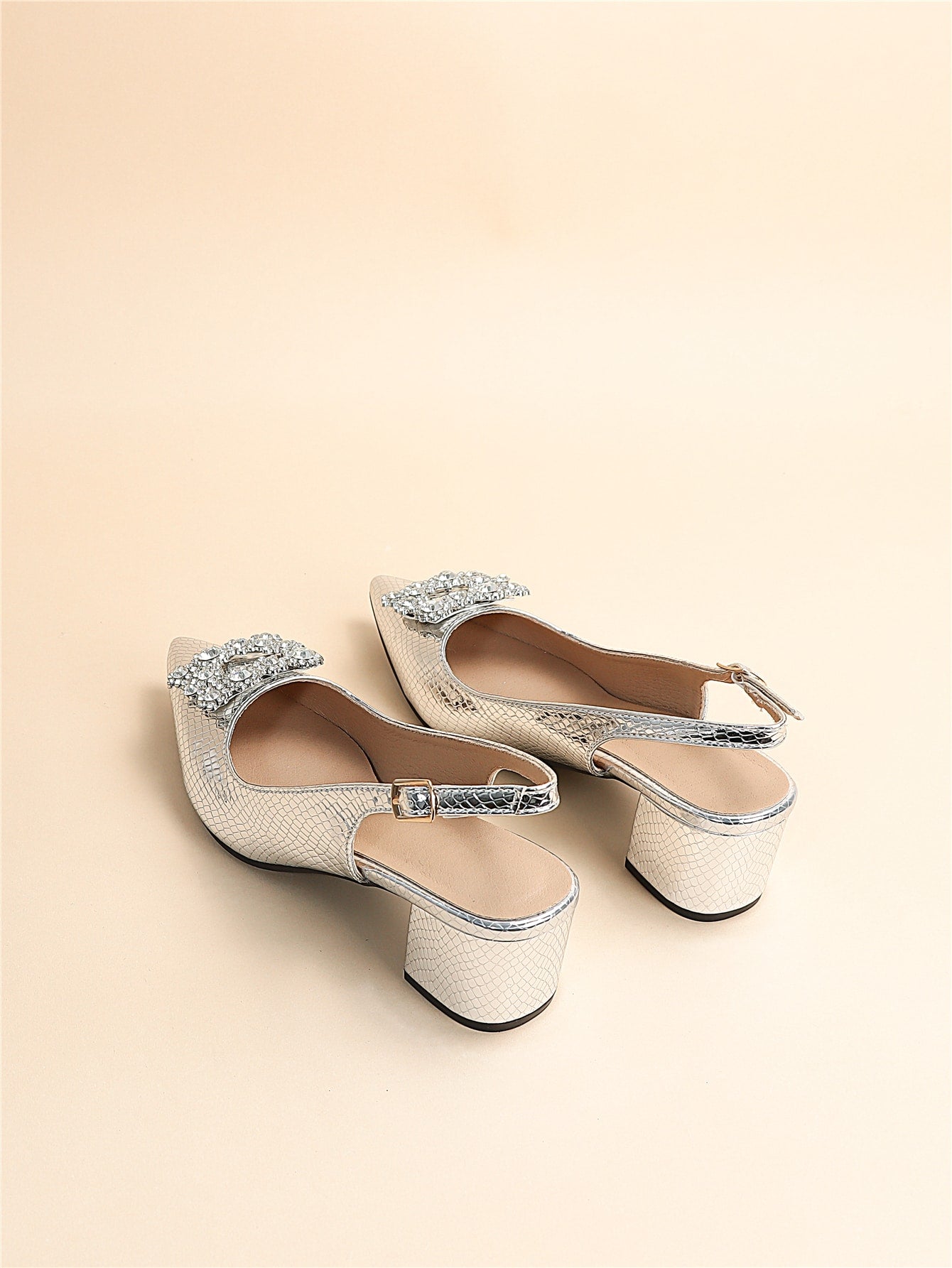 Metallic Snakeskin Embossed Rhinestone Decor Slingback Pumps