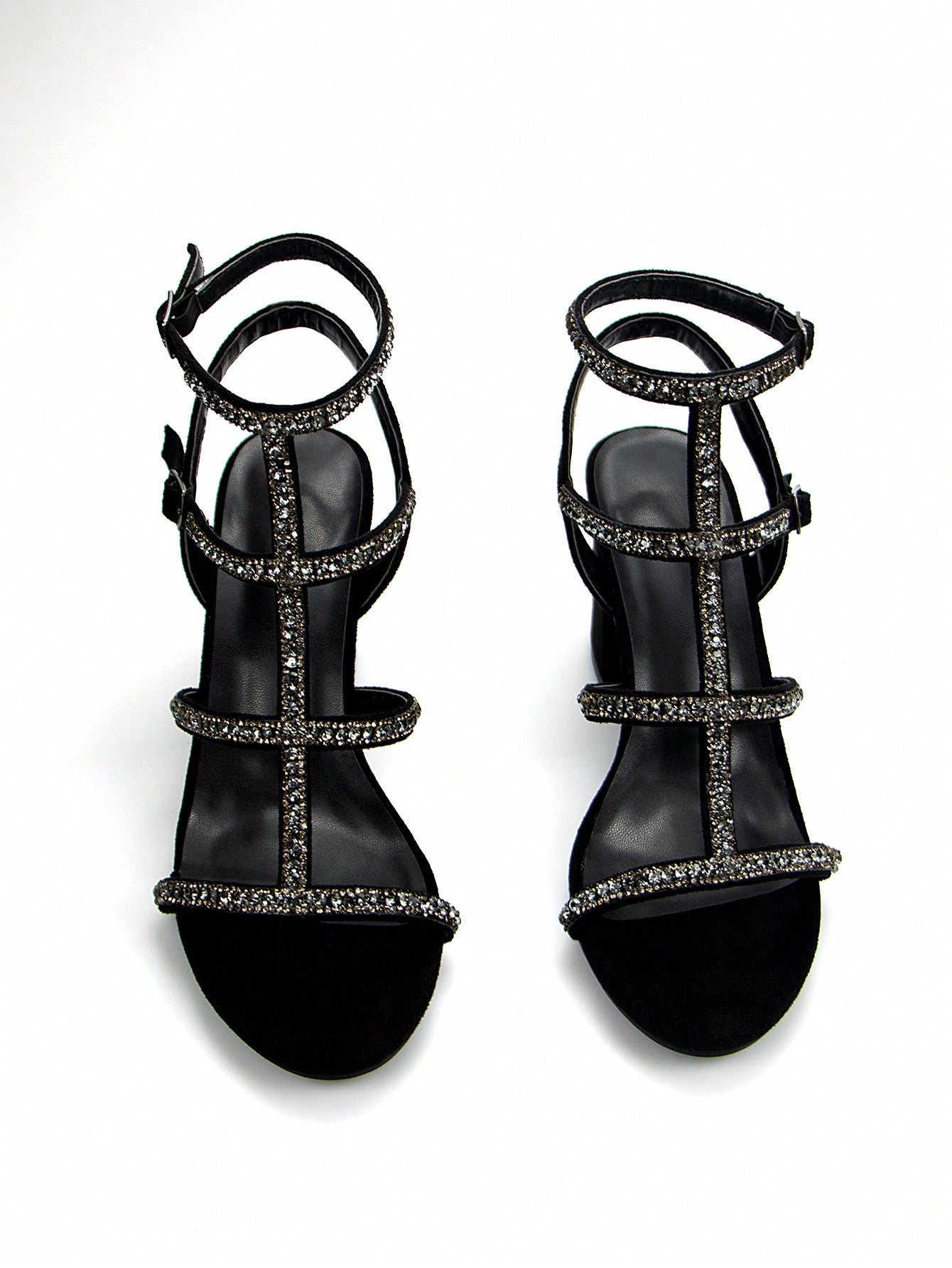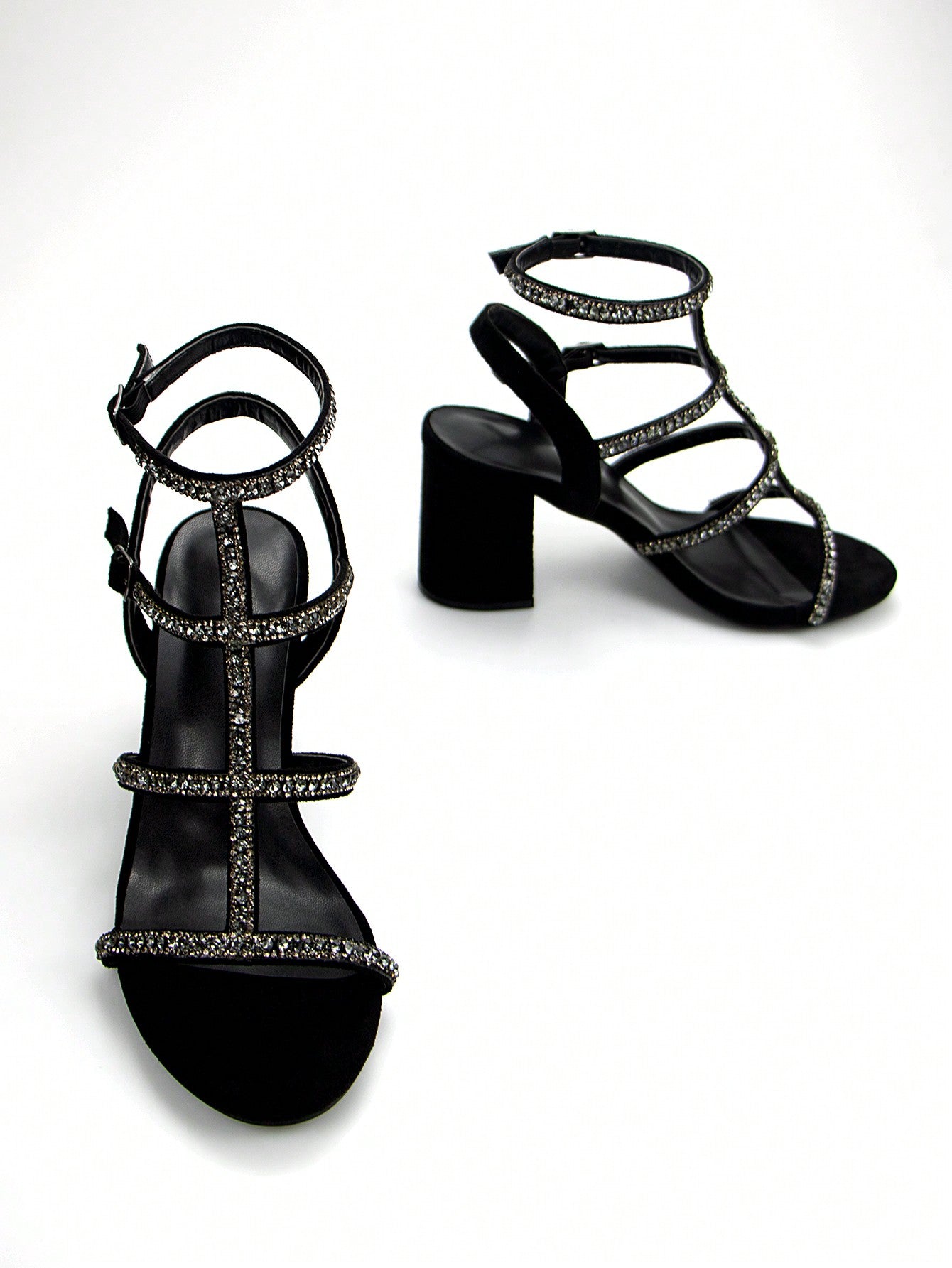 women Women Classic Elegant Rhinestone Thin Strap Black Velvet Fashion Chunky Heels With Round Toe
