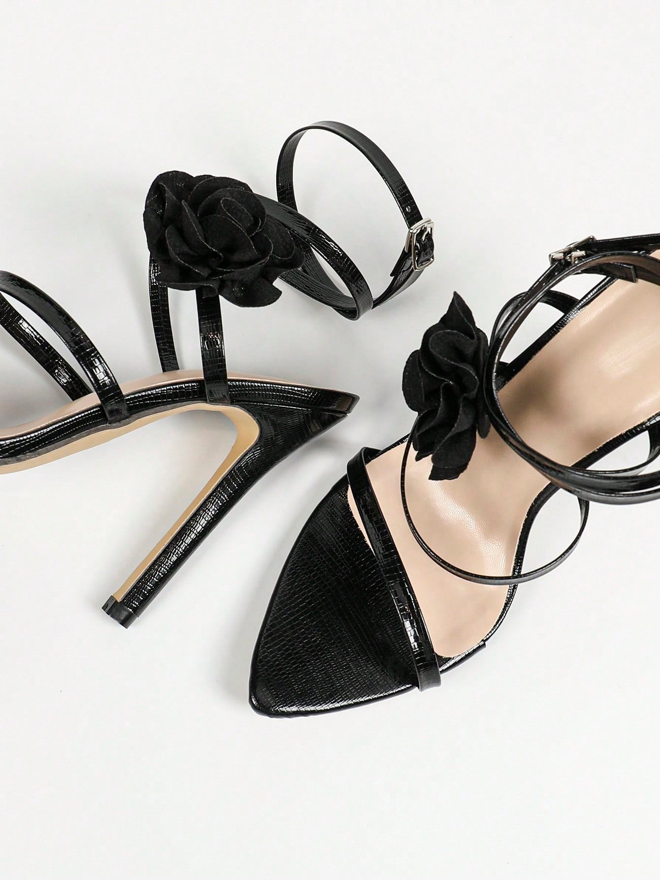 Women's 3D Floral Criss-Cross Strap Buckle Open Toe Sexy Glamorous Romantic Wedding Party Fashion Black High Heel Sandals