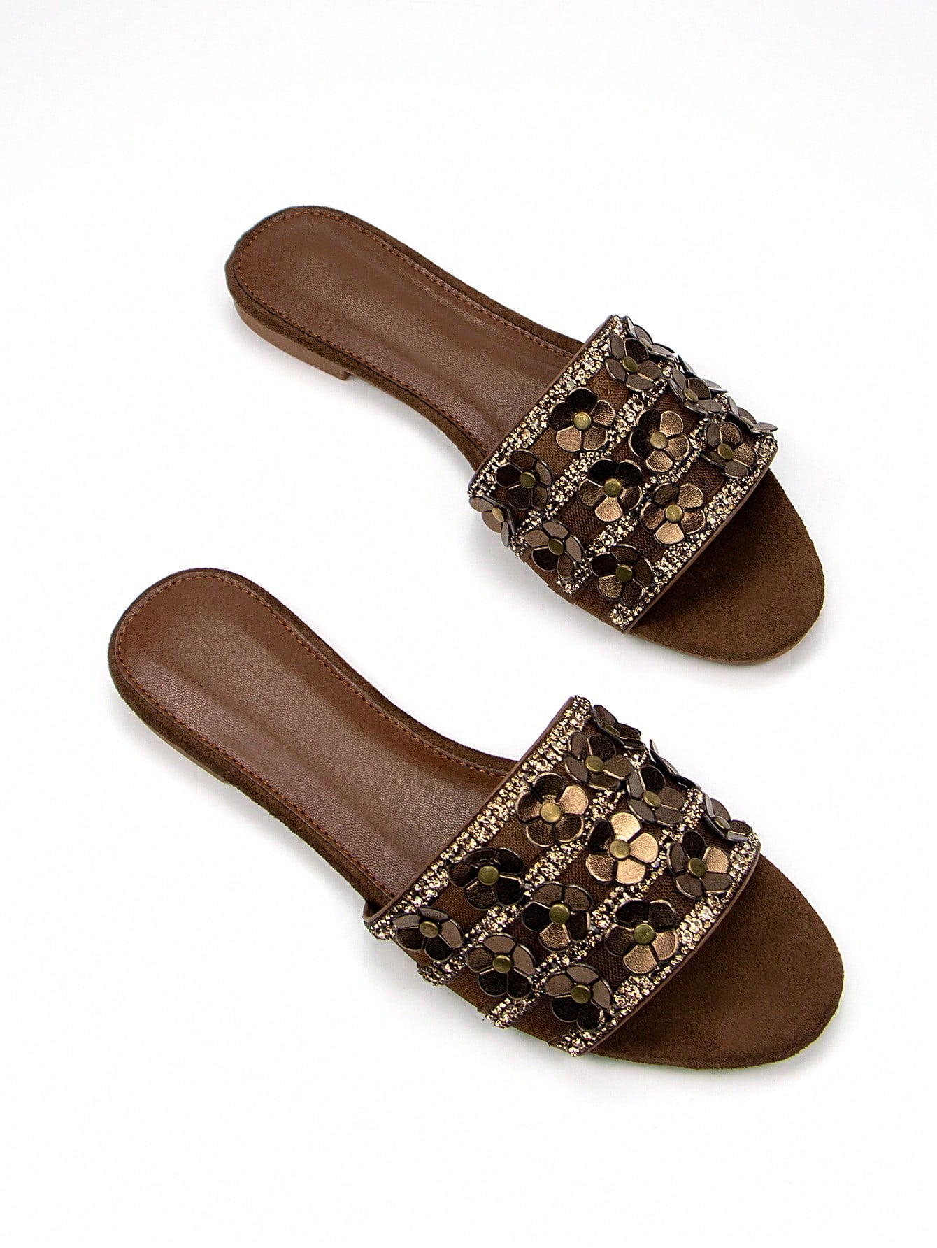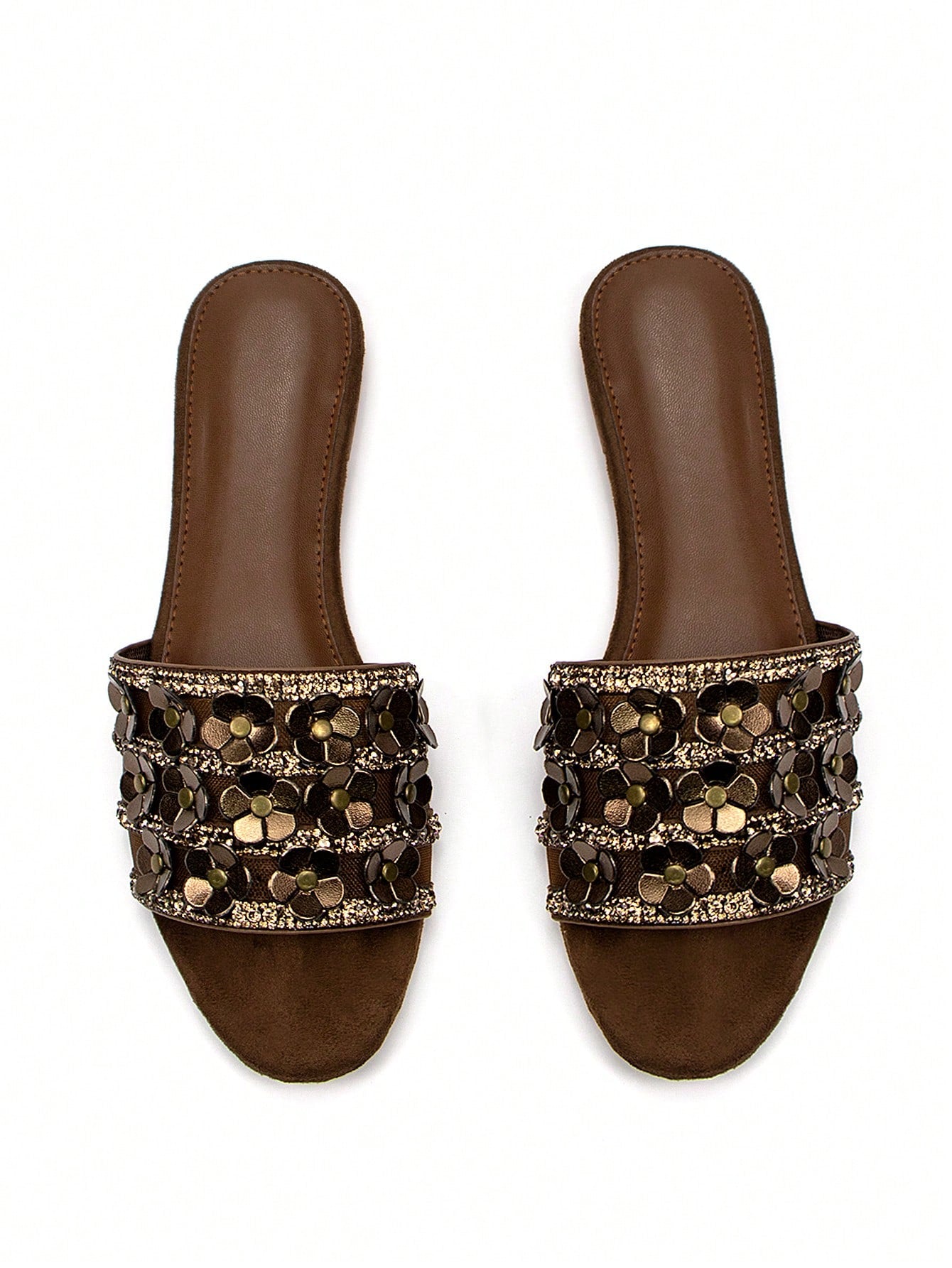 women Women's Glamorous Hollow-Out Full Rhinestone Studded Flower Decor Chocolate Brown Faux Suede Mesh Fashion Round Toe Comfortable Daily Party Flat Slide Sandals