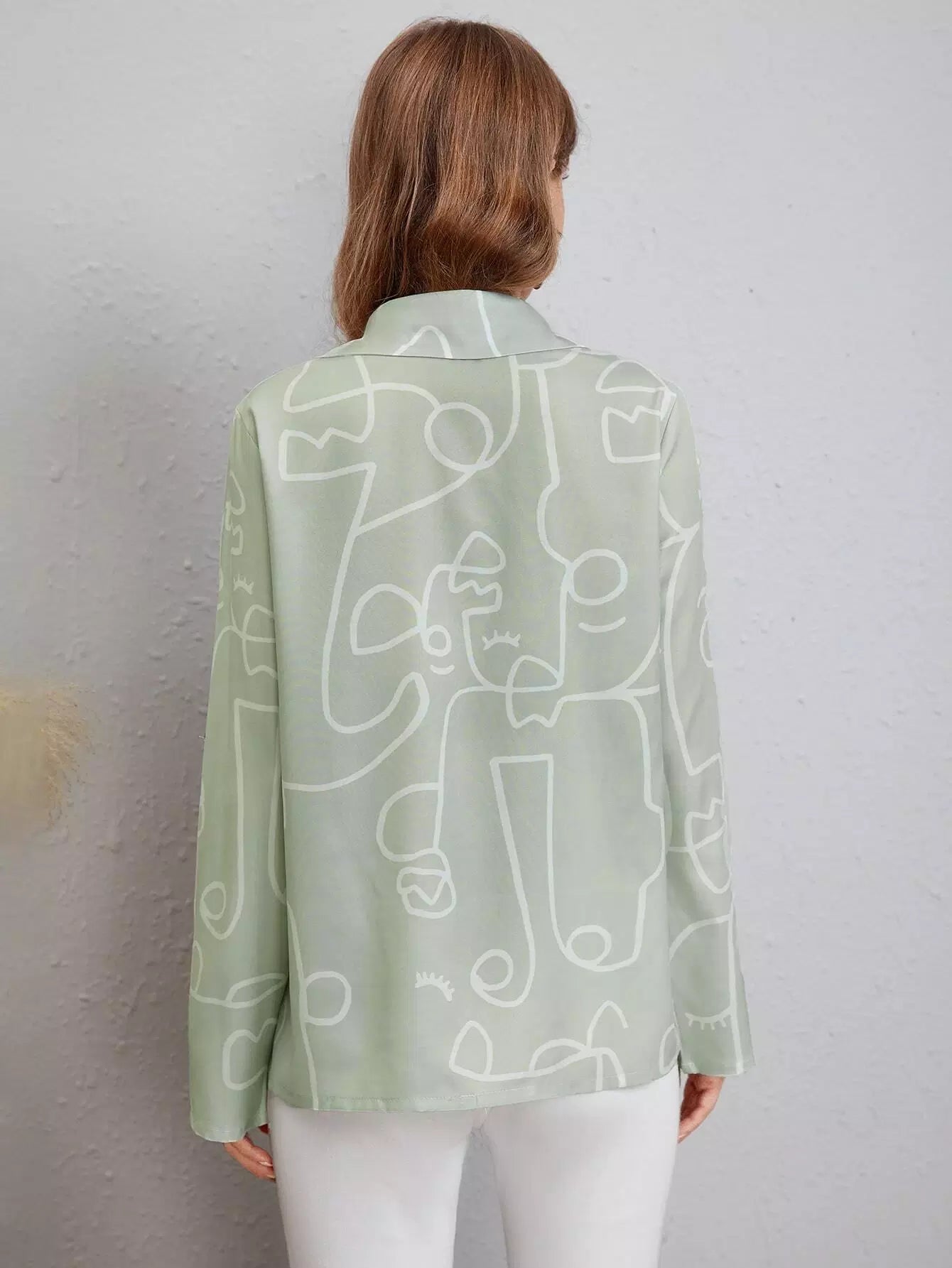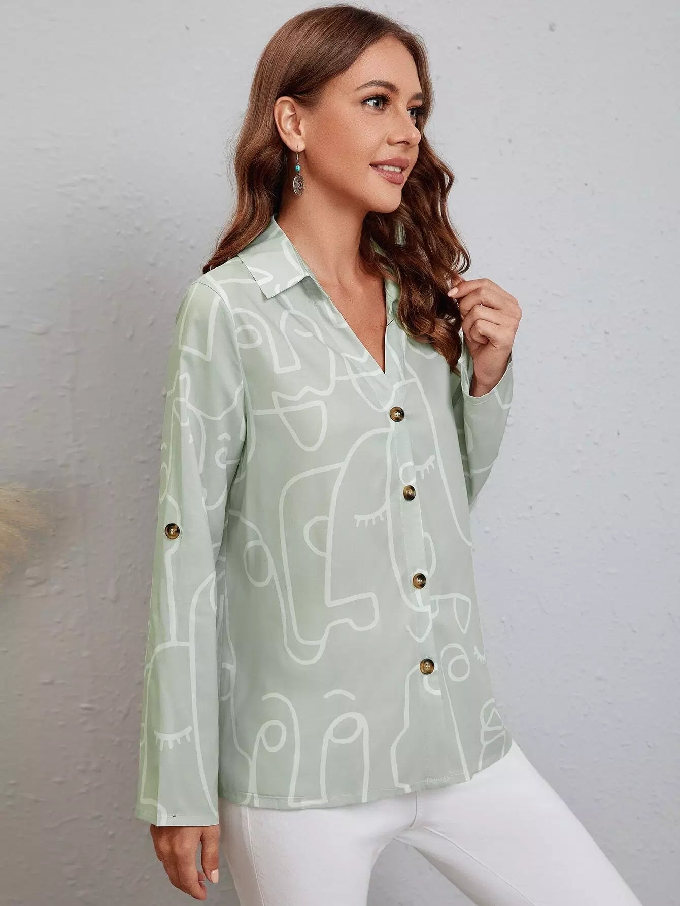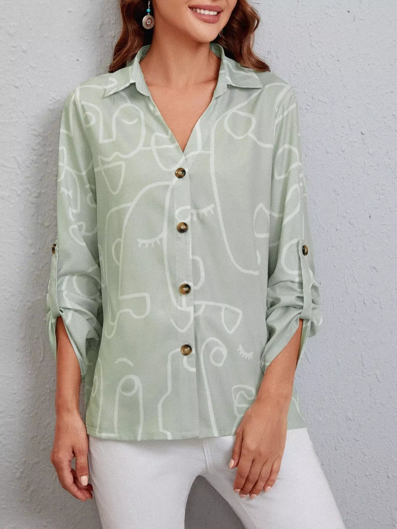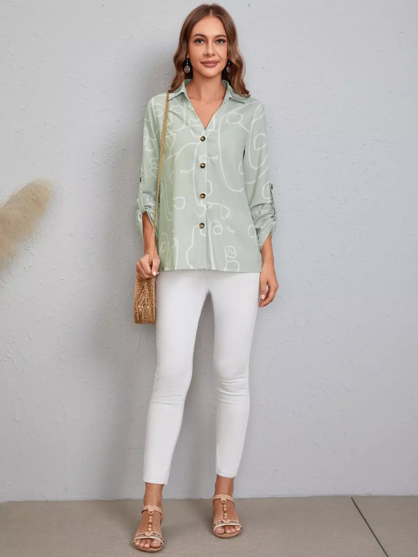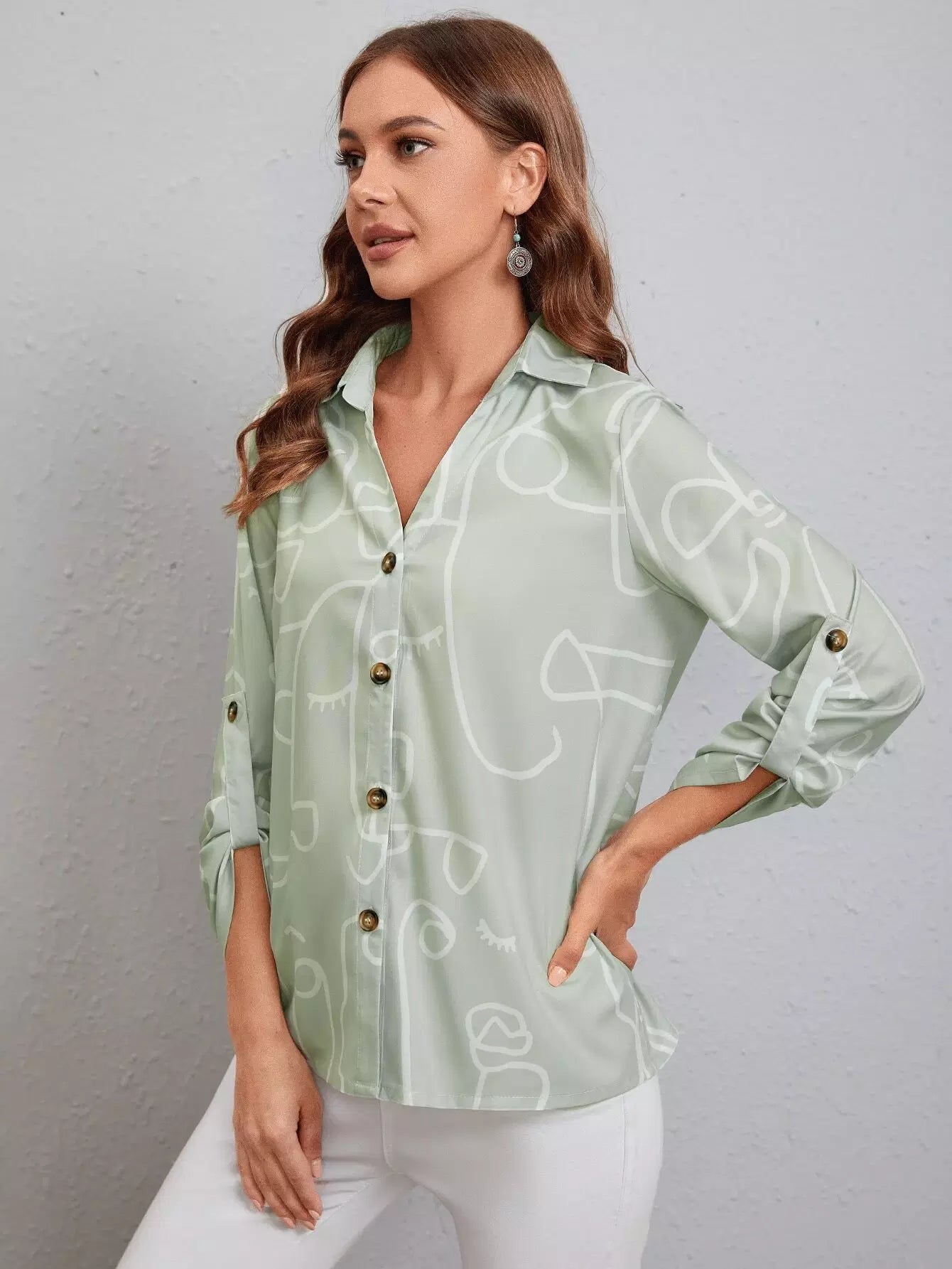 Abstract Figure Graphic Button Front Roll Up Sleeve Shirt