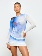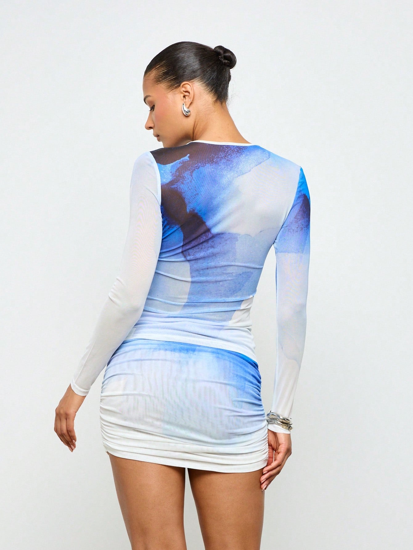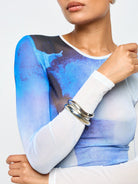 AiiRZ Watercolor Print Mesh Long Sleeve Bodycon Modern Stretchy Athletic Top Performance Active Wear