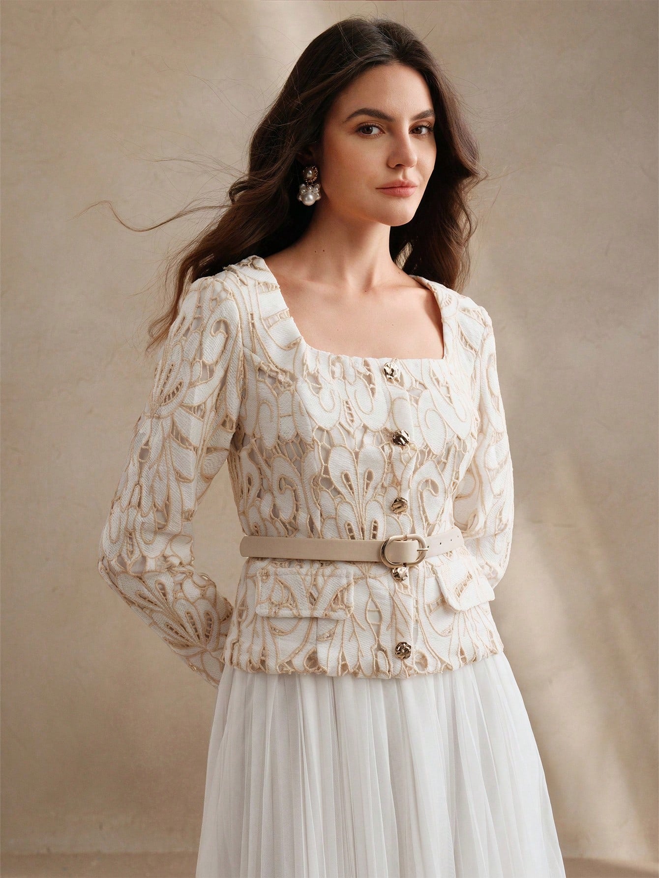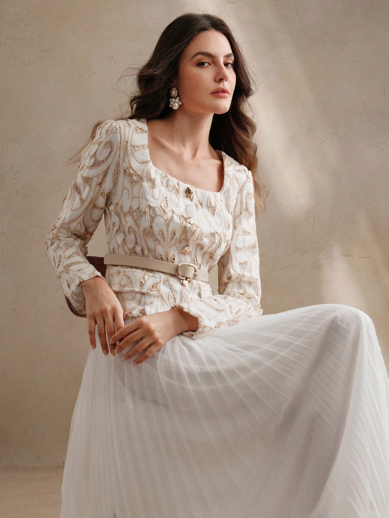 Anewsta Square Neck Long Sleeve Fitted Lace Insert Mesh Waist Belt Pleated Skirt Elegant Outfit, Valentine's