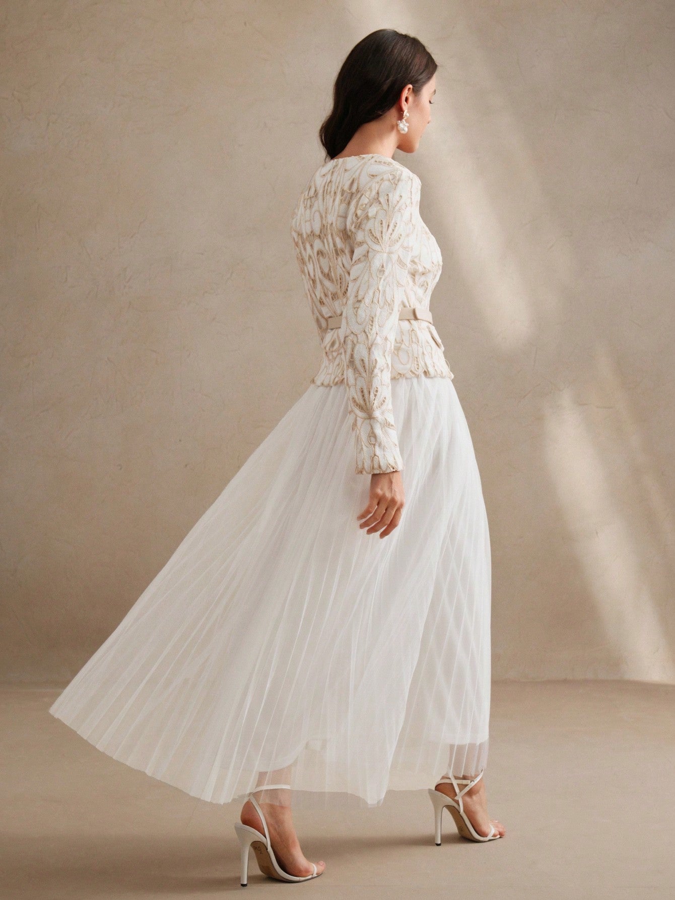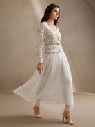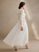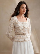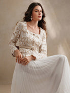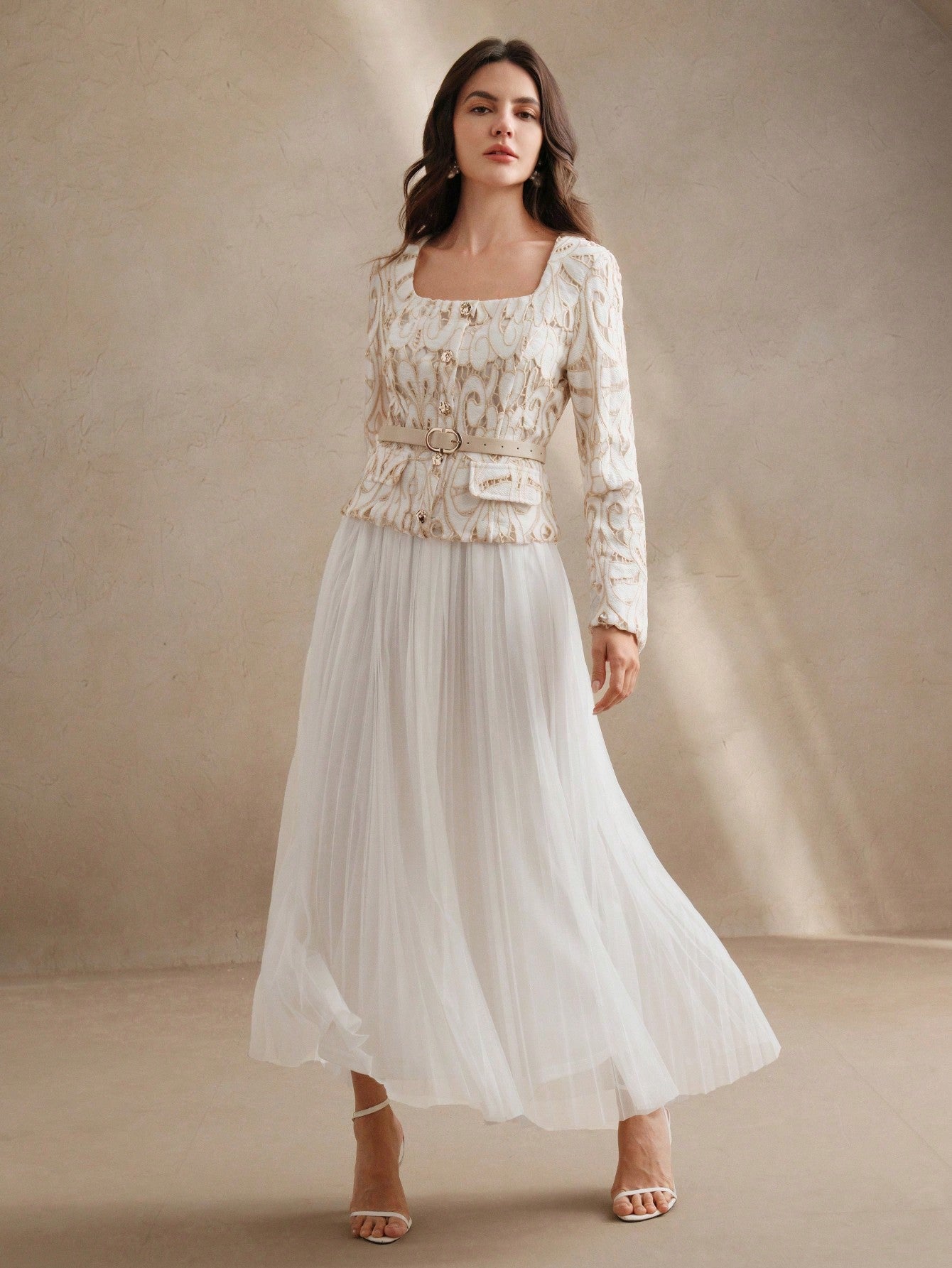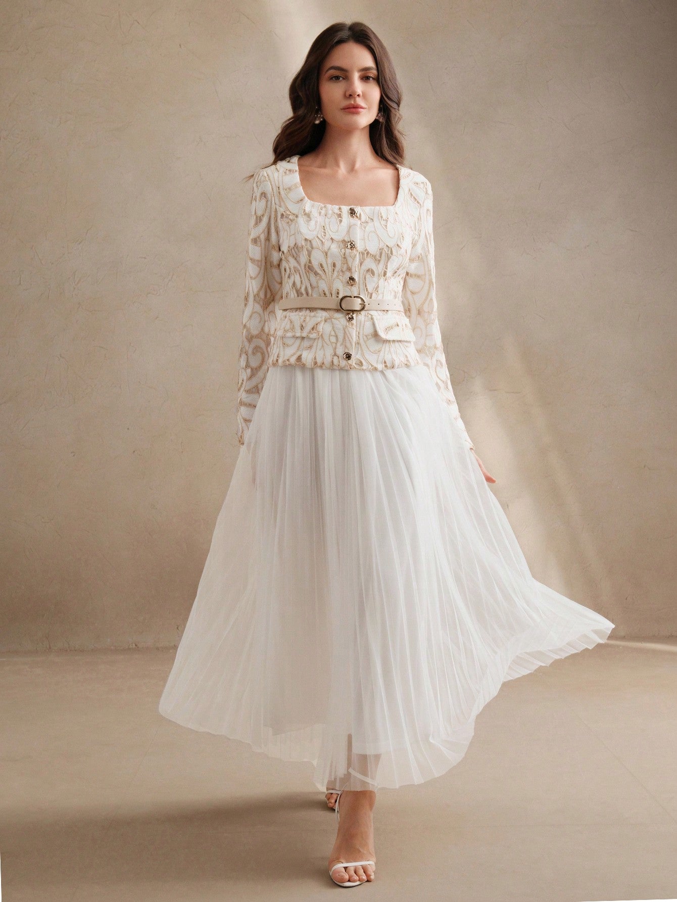 Anewsta Square Neck Long Sleeve Fitted Lace Insert Mesh Waist Pleated Skirt Elegant Outfit, Valentine's Without Belt