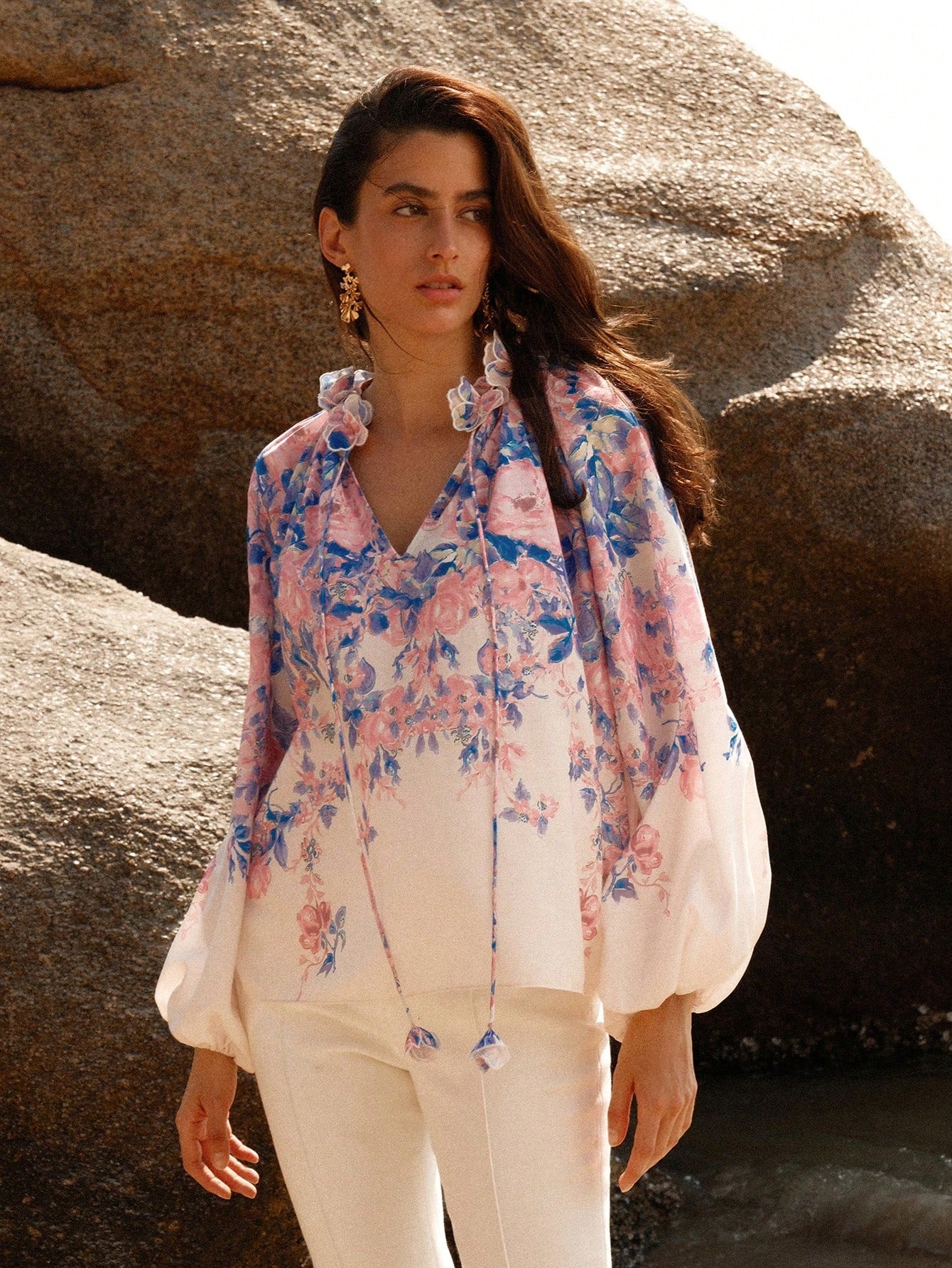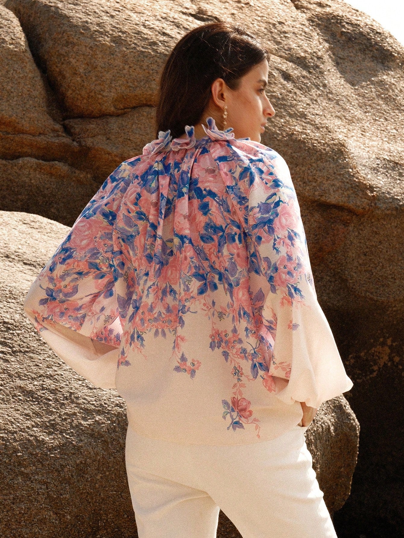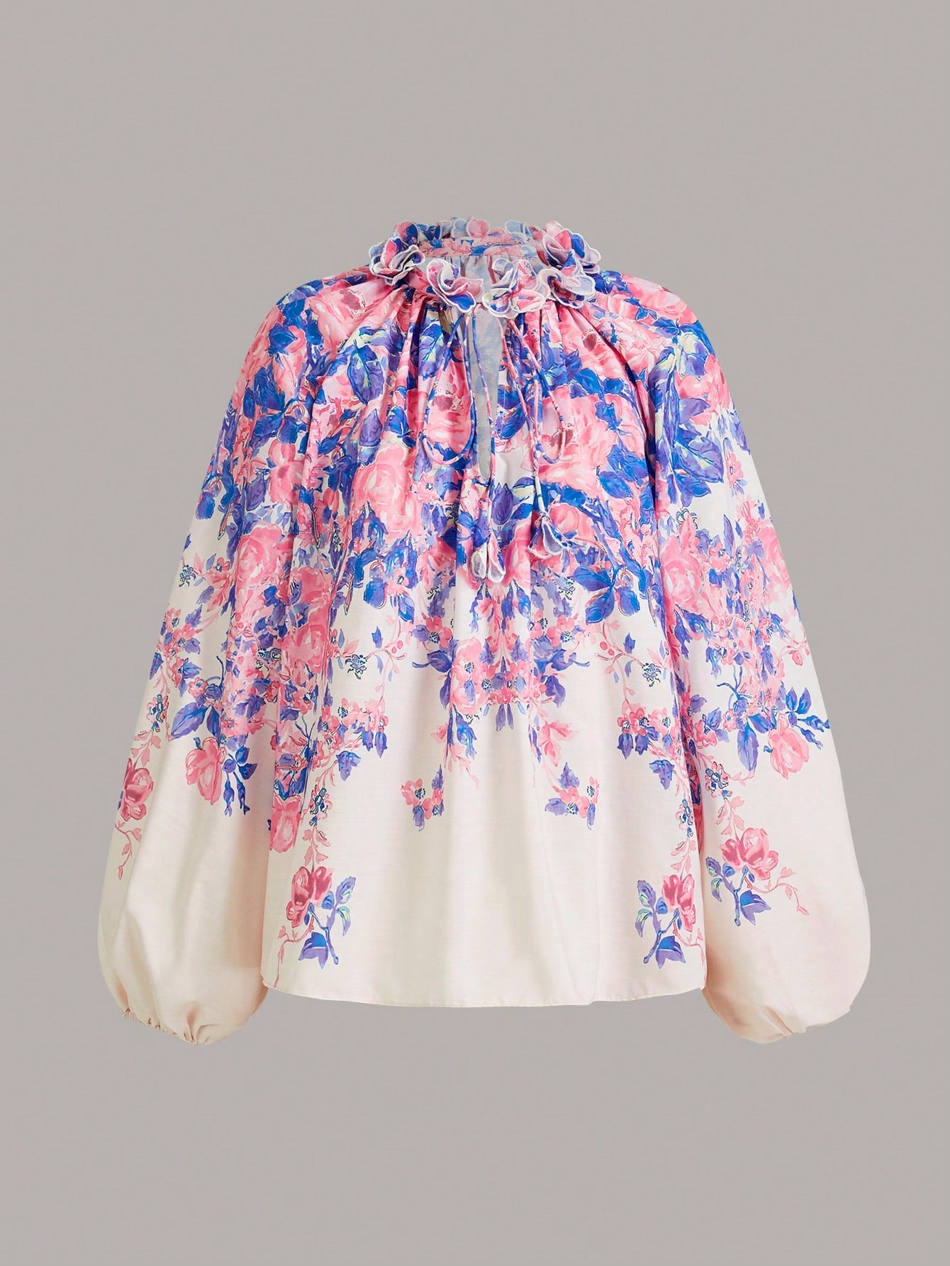 Anewsta Women Floral Printed Shirt With Decorated Lace Collar