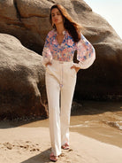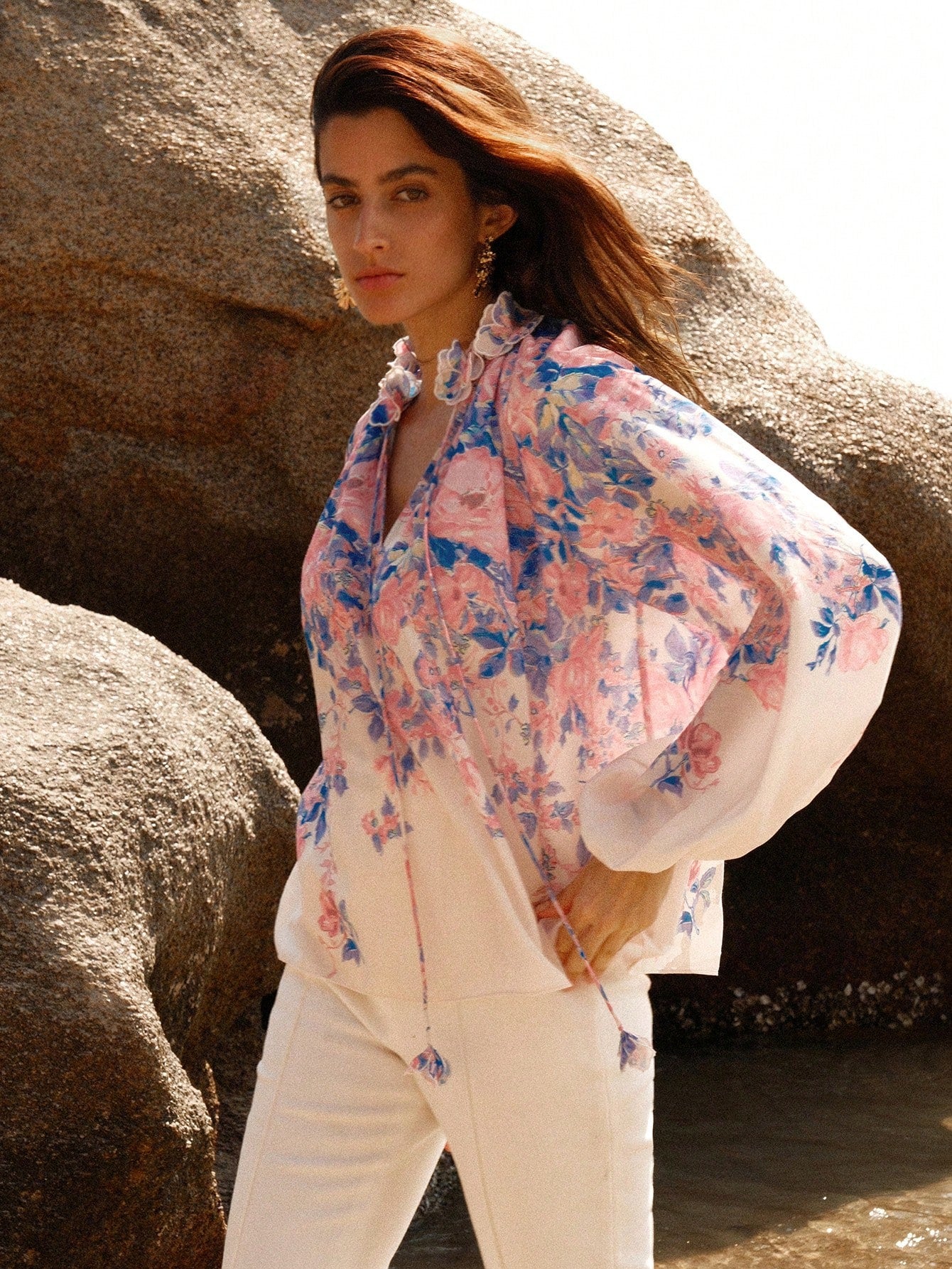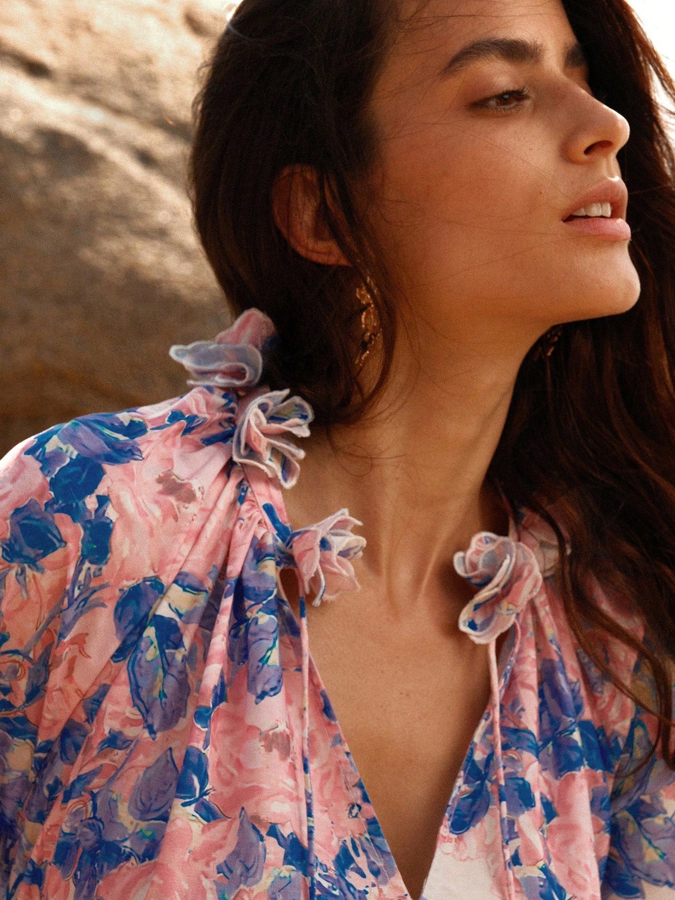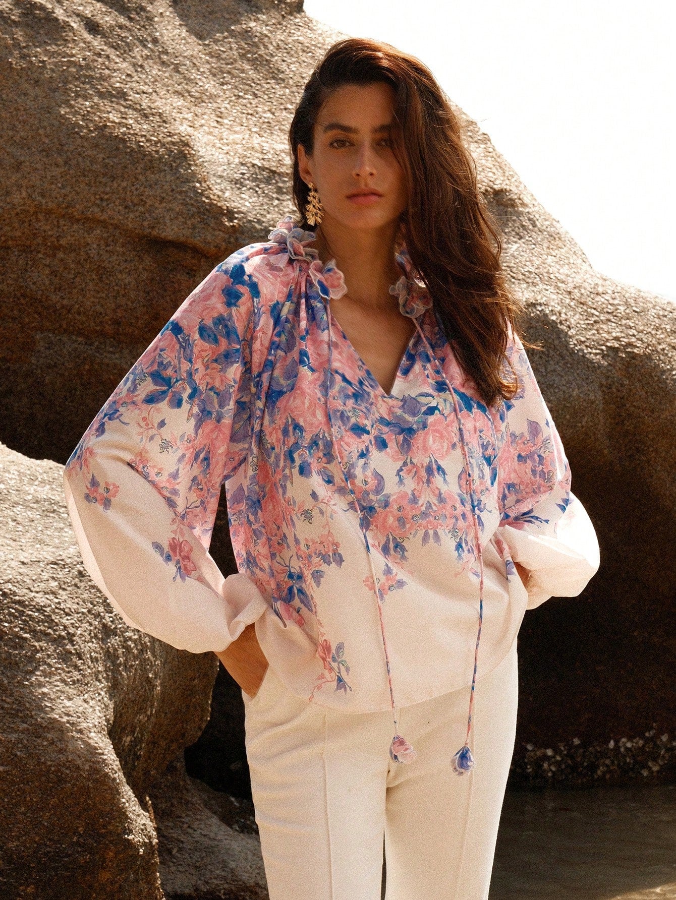 Anewsta Women Floral Printed Shirt With Decorated Lace Collar