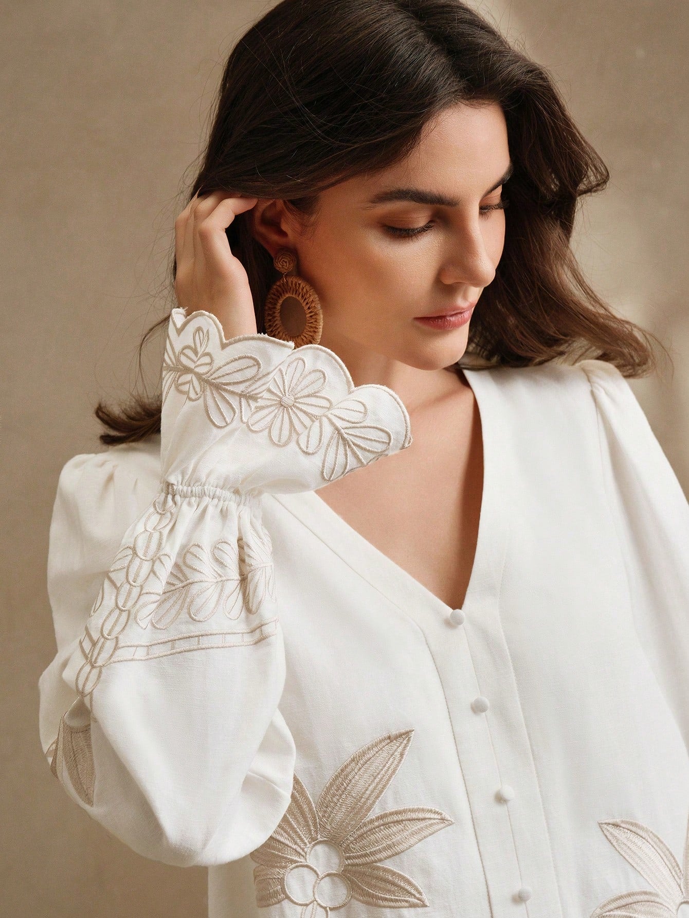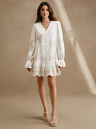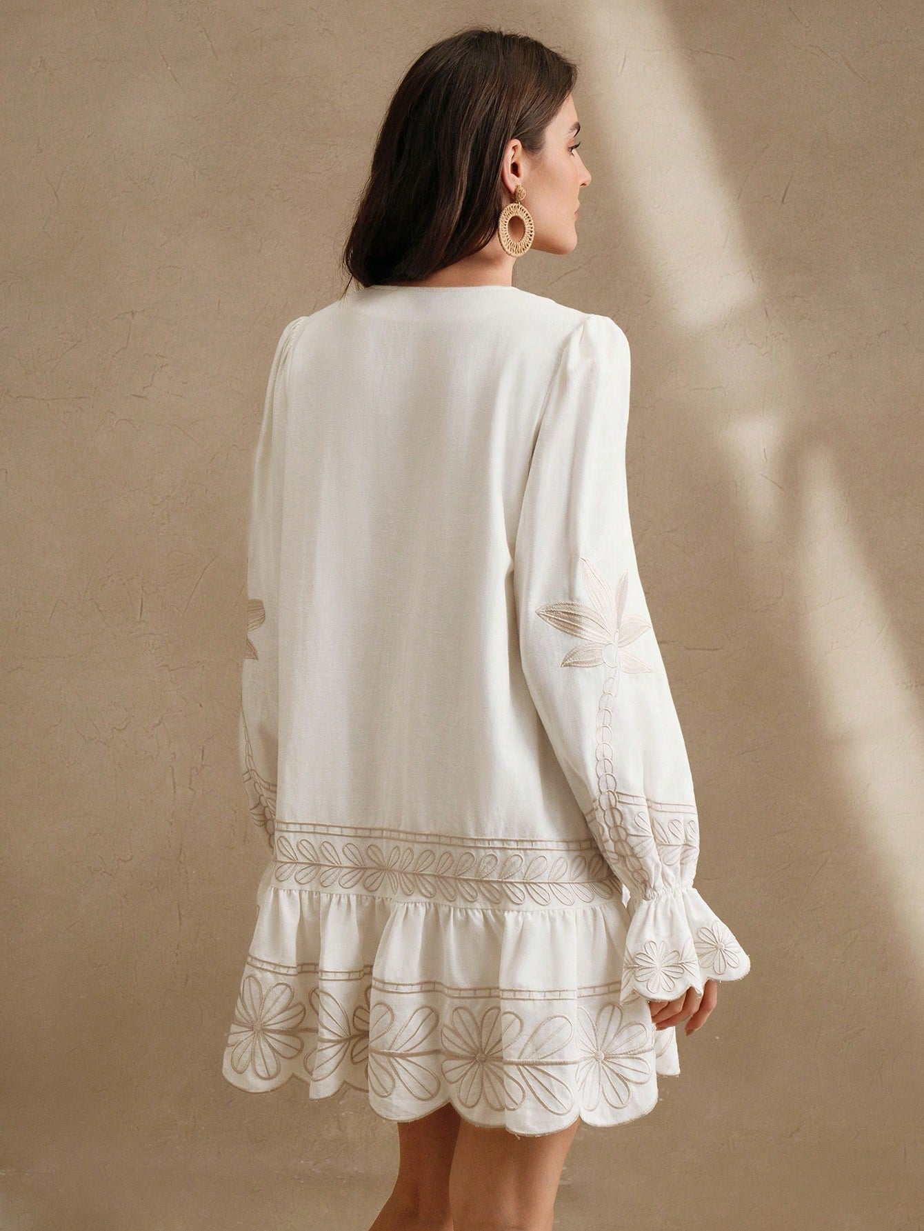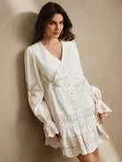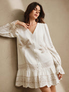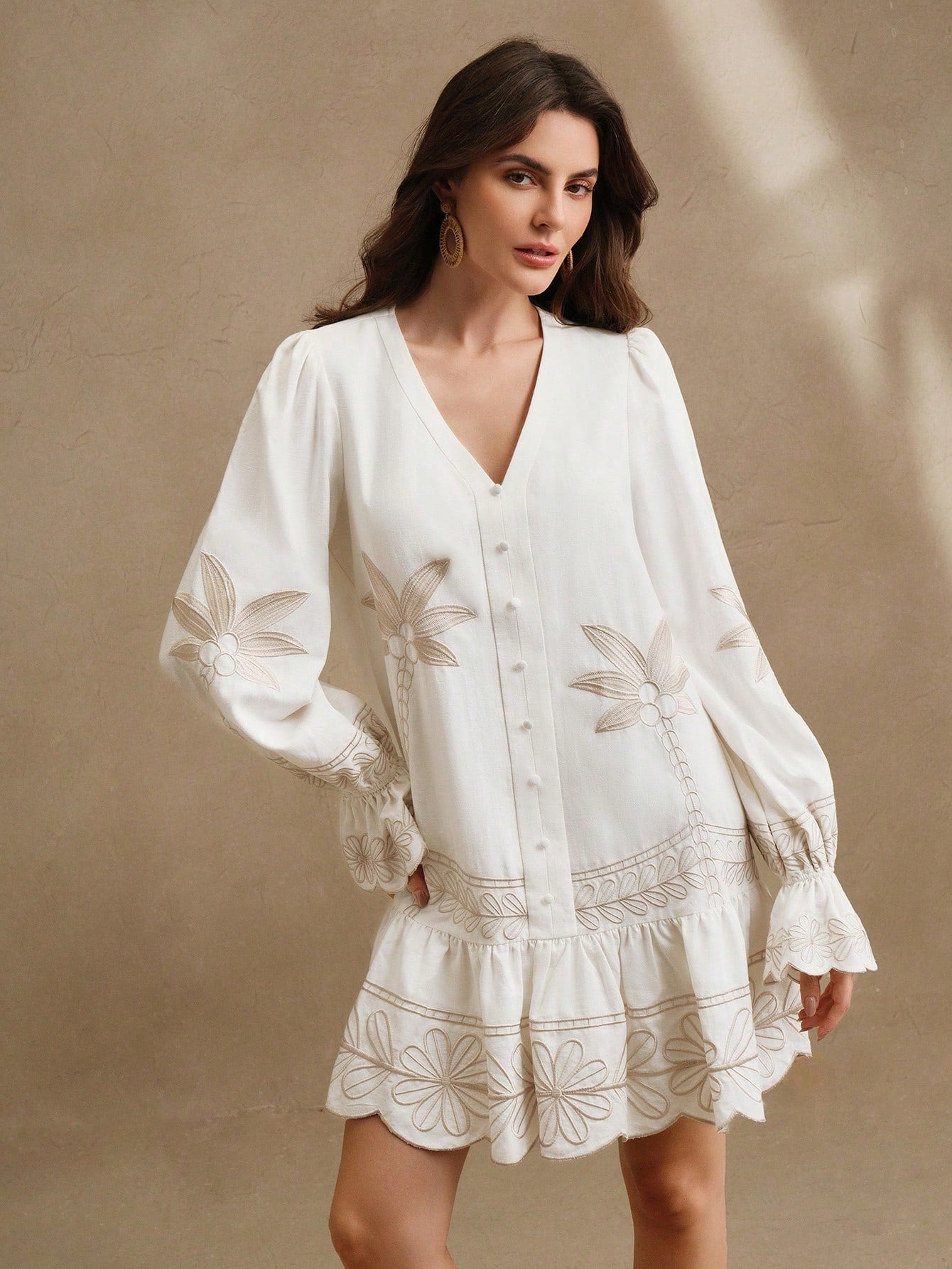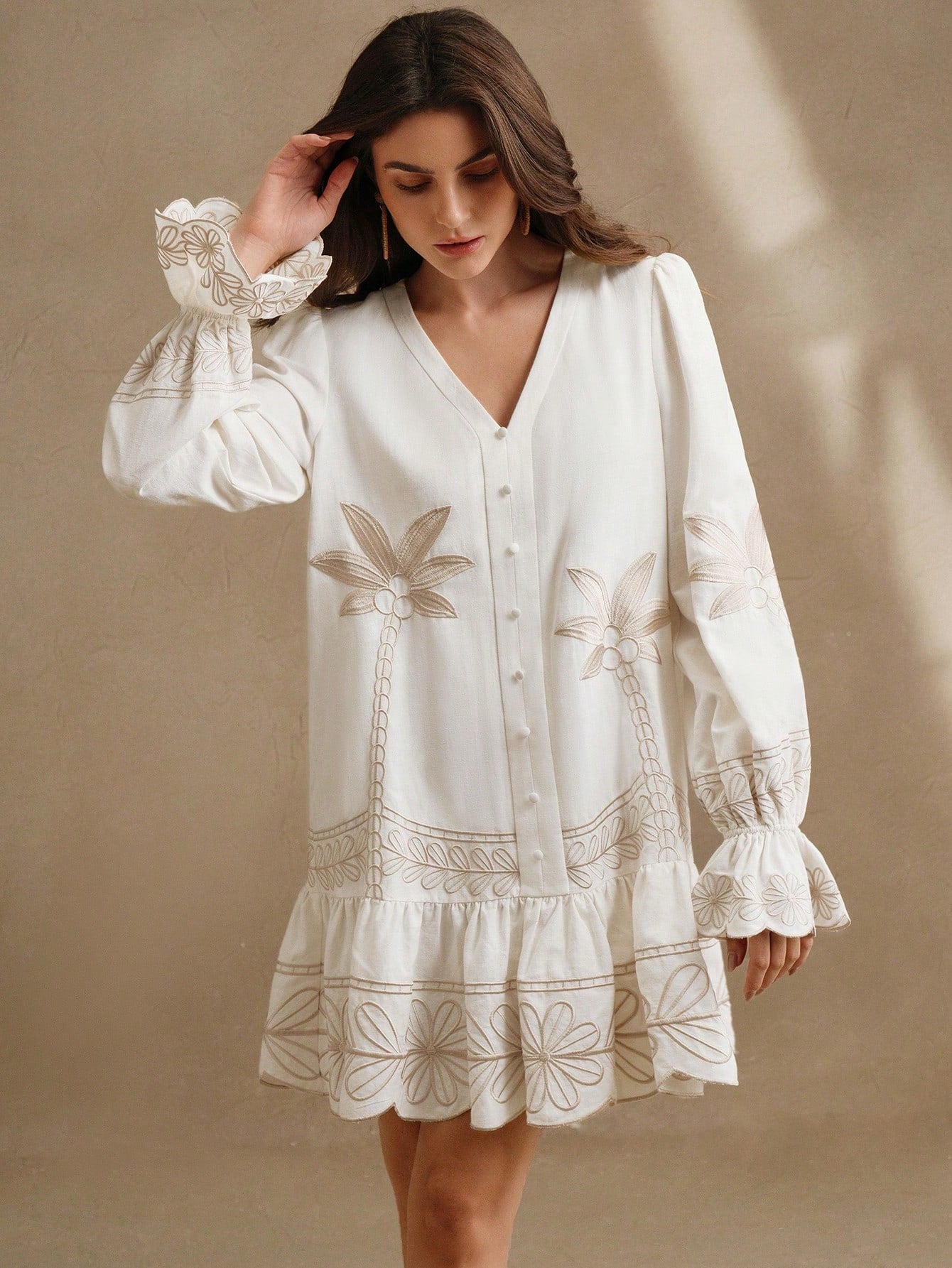 Anewsta Women's V-Neck Long Sleeve Embroidered Coconut Tree Elegant Short Dress, Suitable For Spring,
