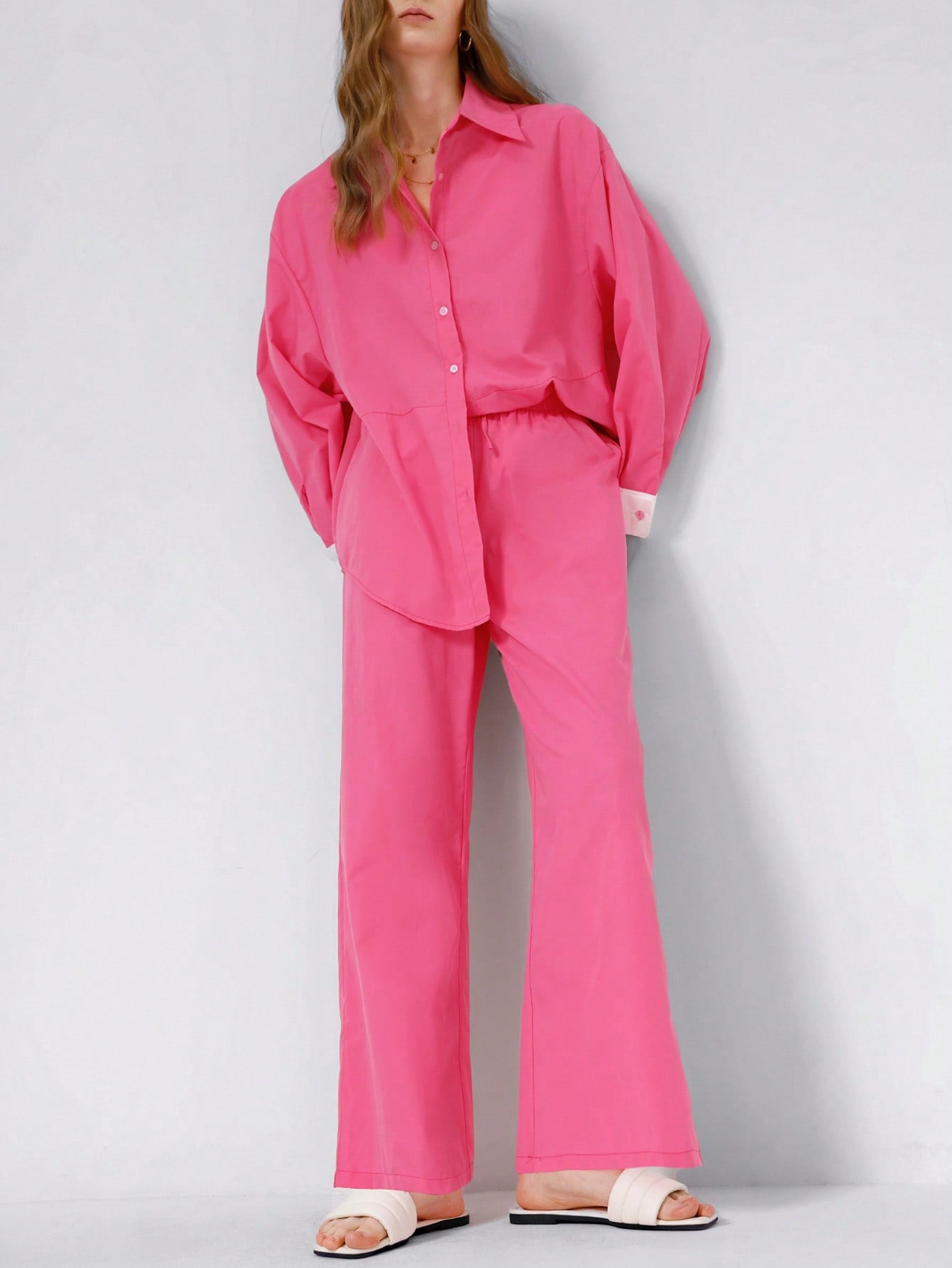 women Aveloria Affinna Women's Casual Loose Fit Contrast Color Collar Long Sleeve Shirt And Adjustable Elastic Waist Wide Leg Pants 2pcs Set