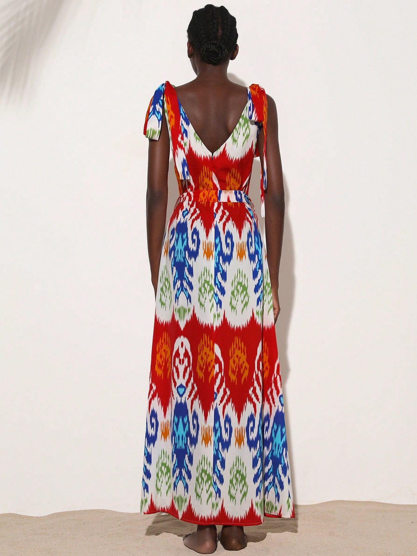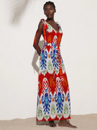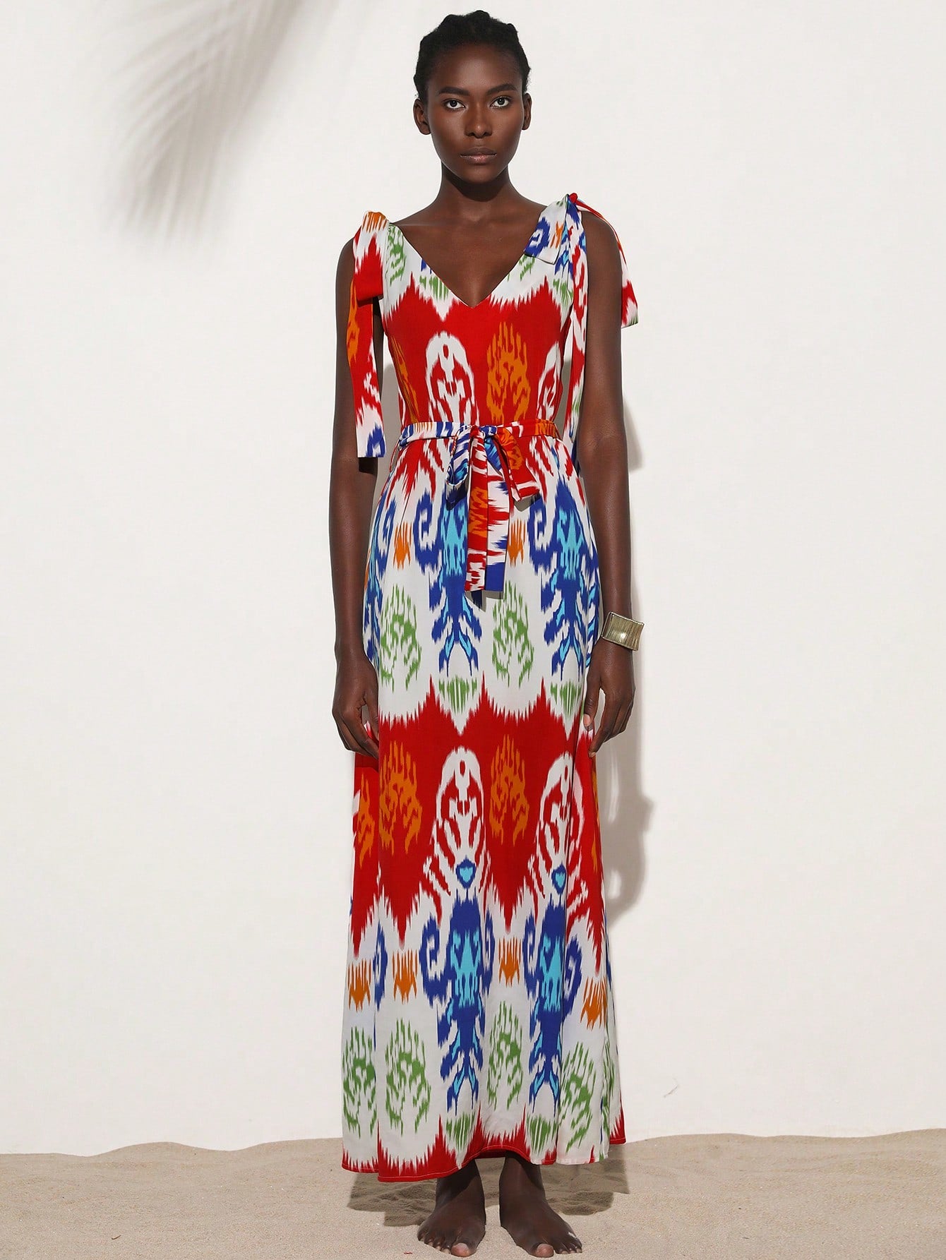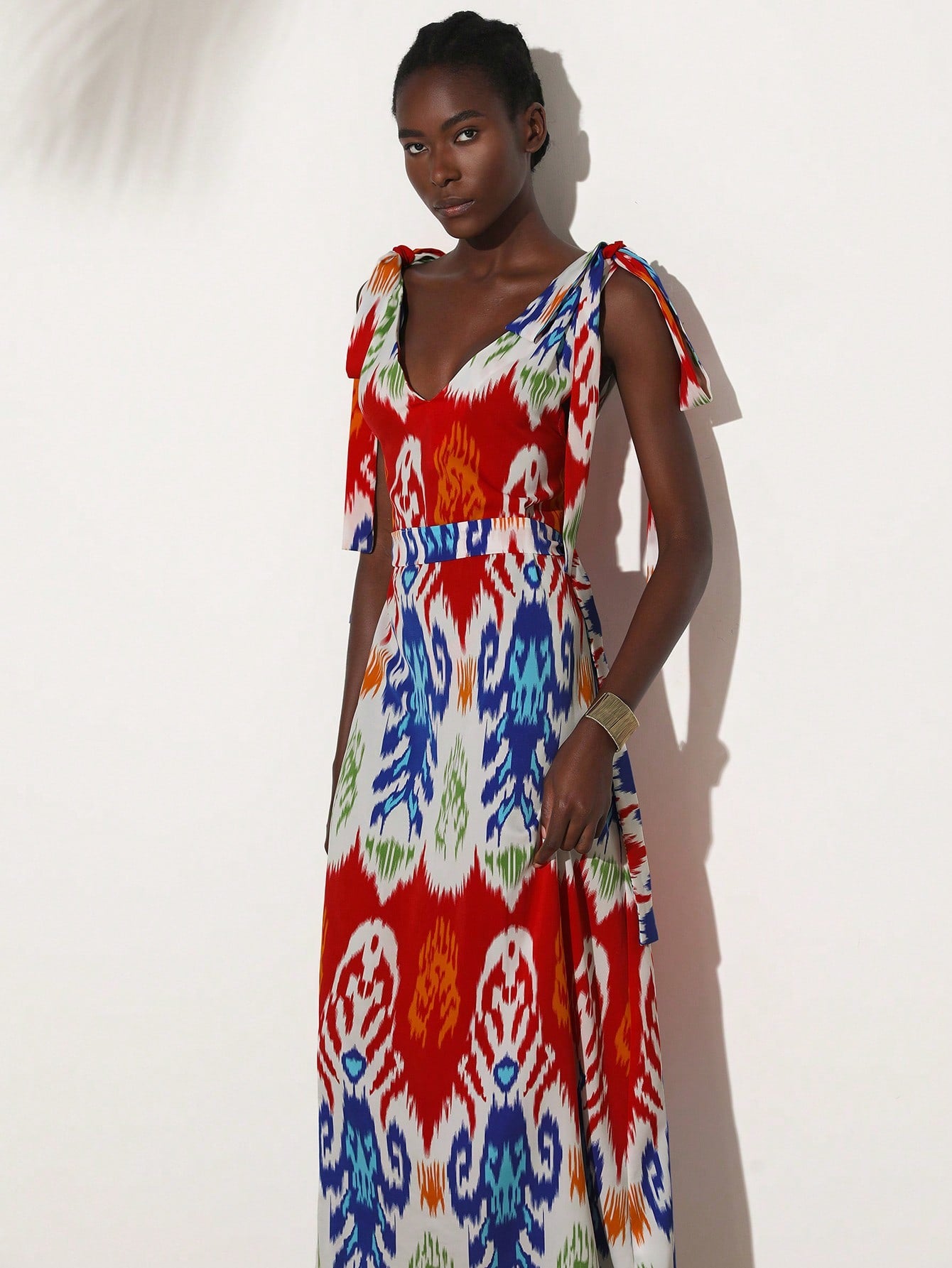 Aveloria Modichic Retro Style Holiday Colorblock V-Neck Tie Shoulder Waist Women's Dress Without Belt