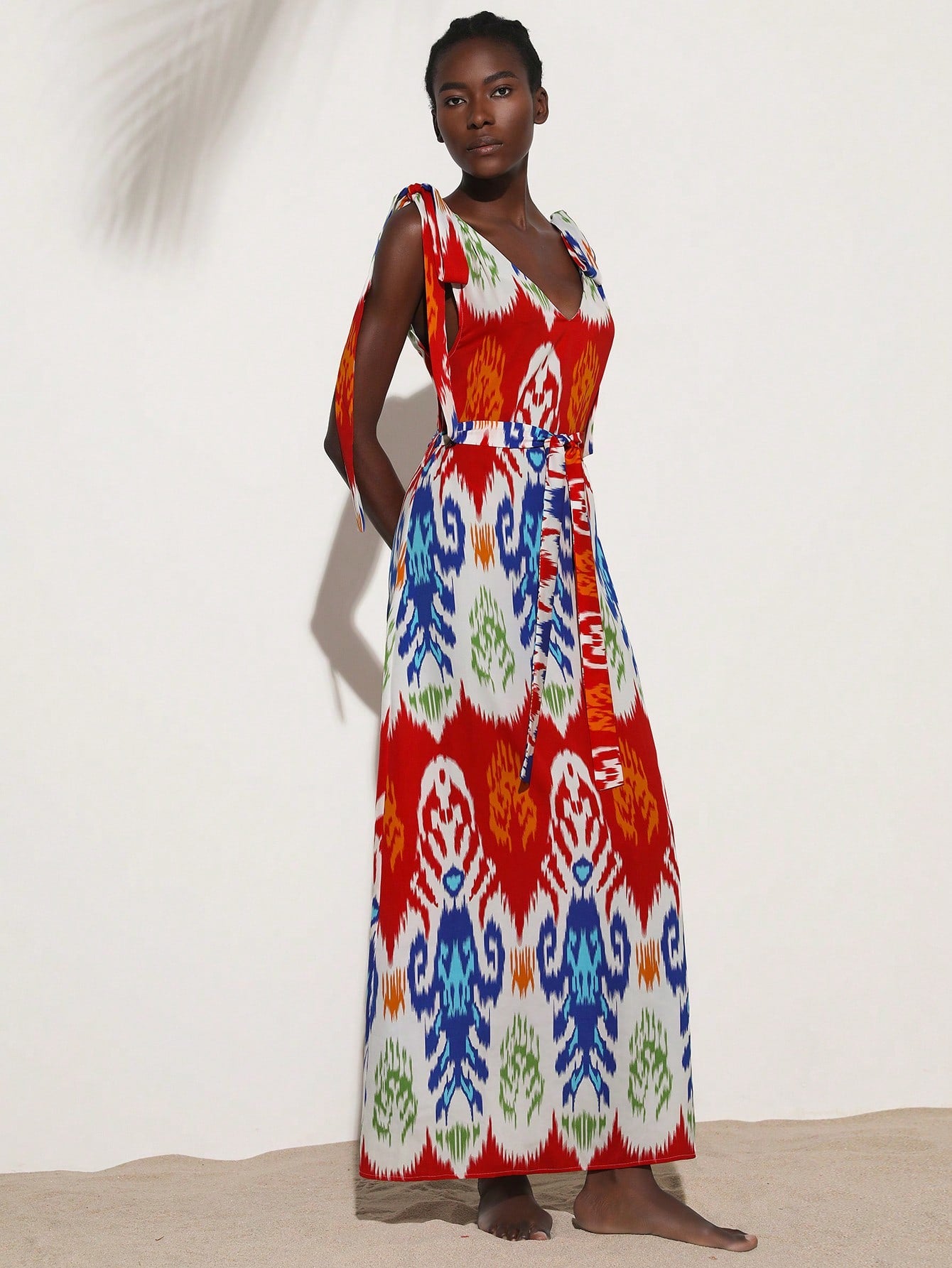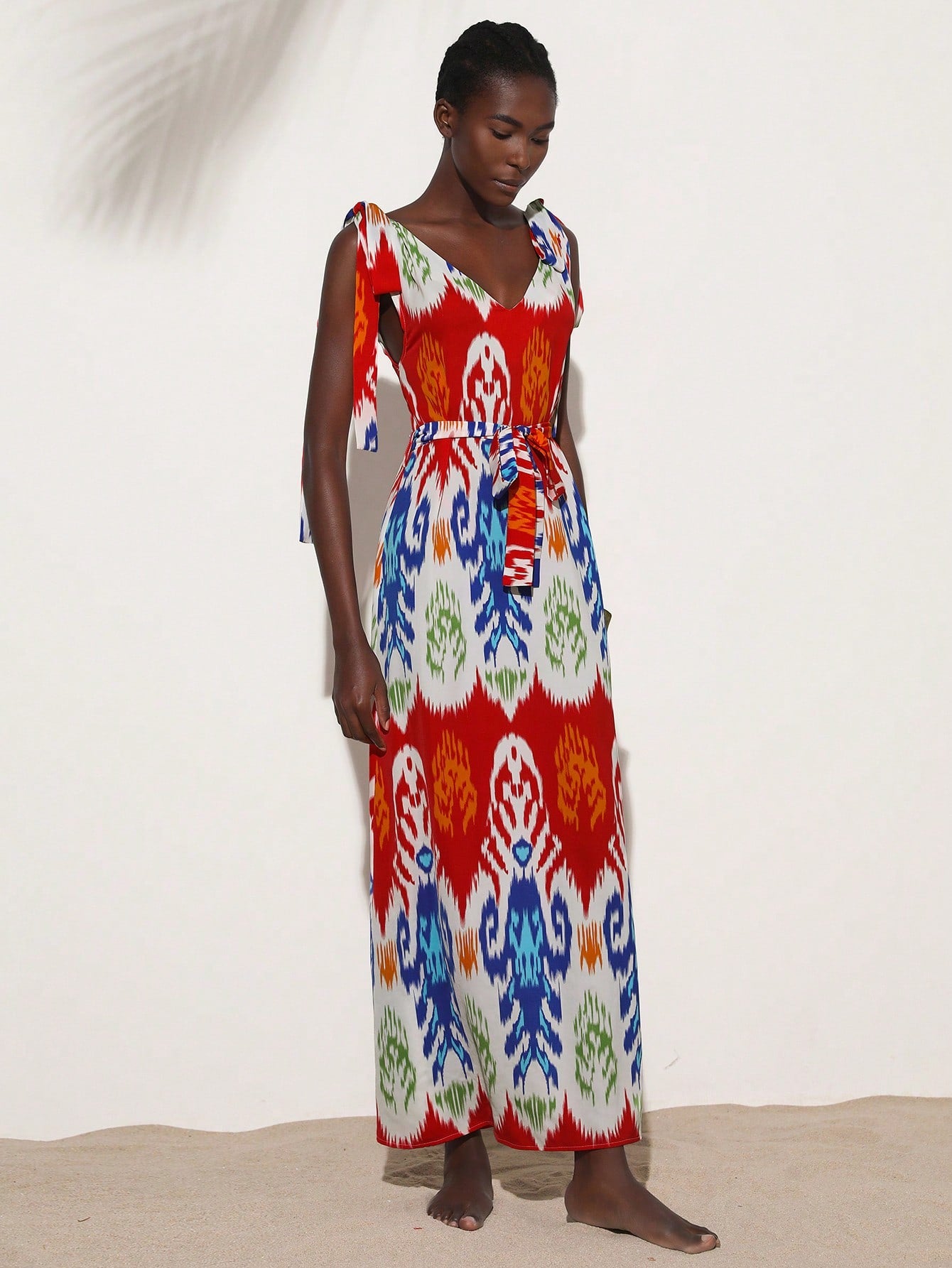 Aveloria Modichic Retro Style Holiday Colorblock V-Neck Tie Shoulder Waist Belt Women's Dress