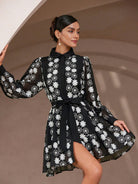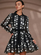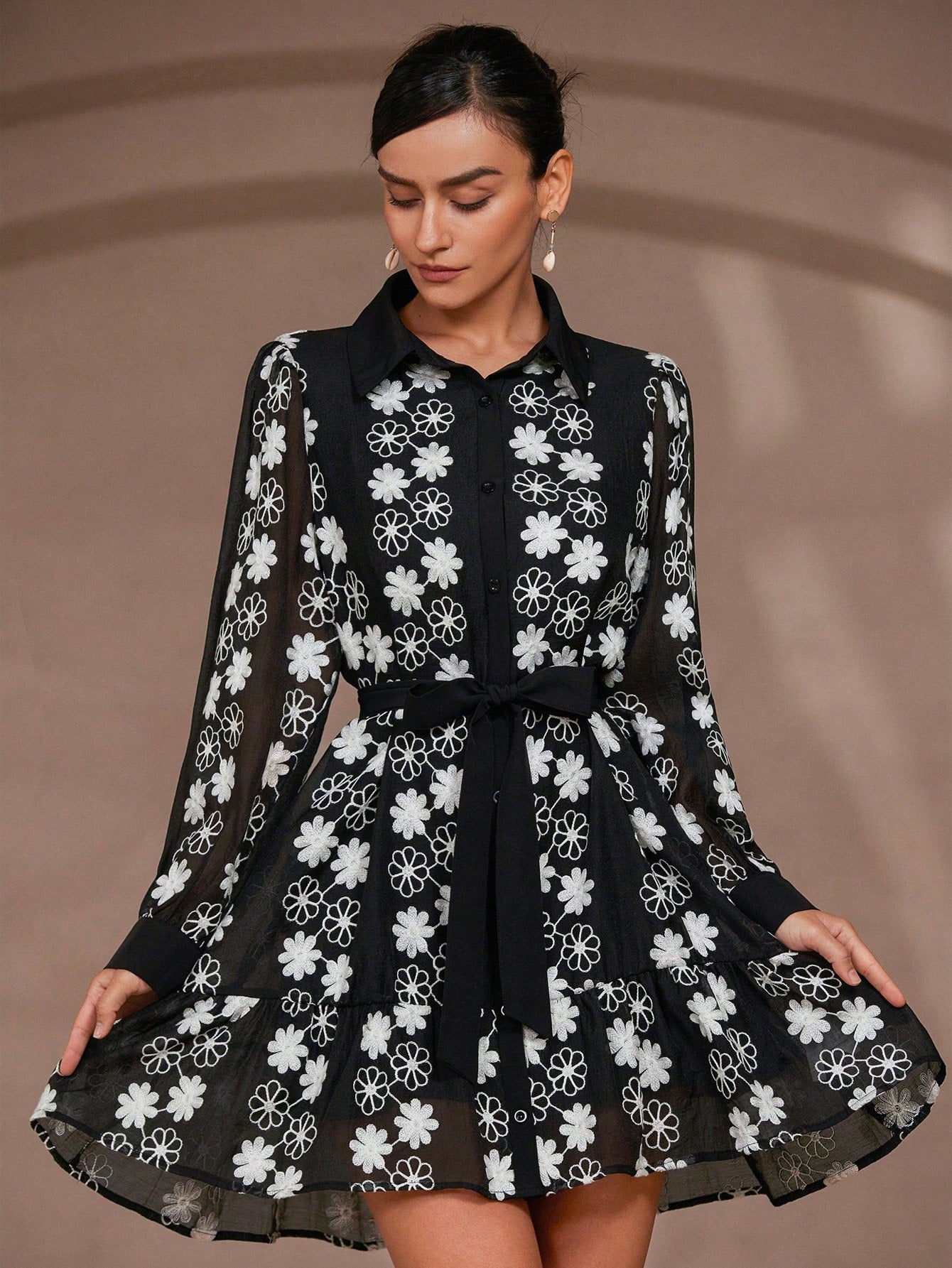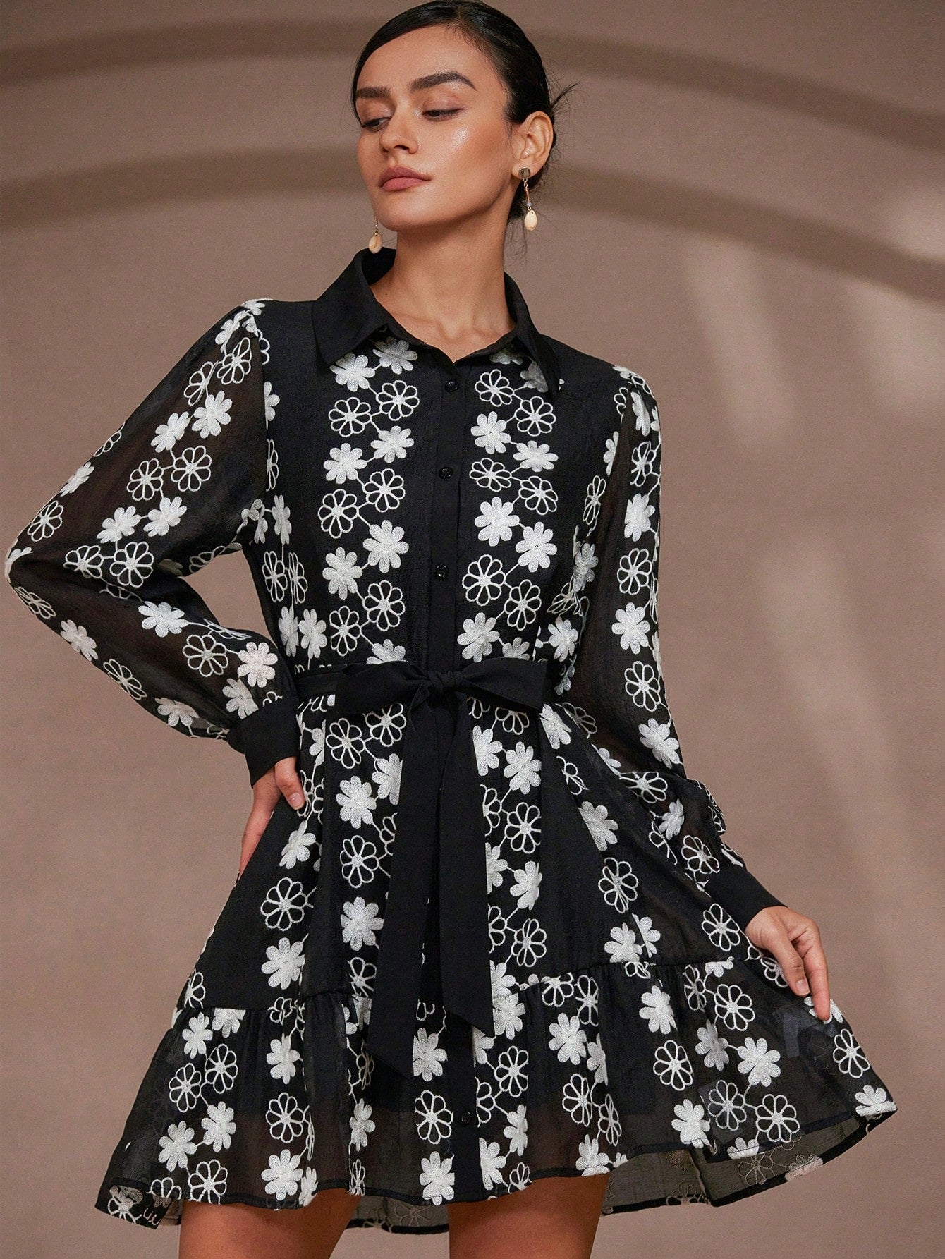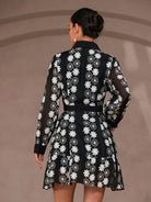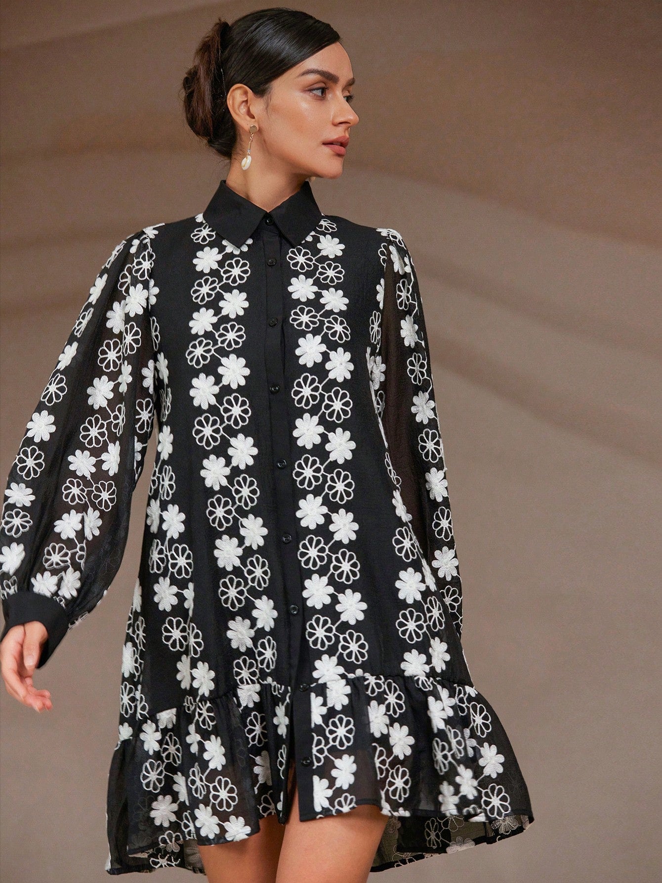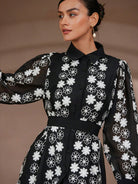 Aveloria Rosie Black & White 3D Embroidery Elegant Design Contrast Color Turndown Collar Long Sleeve