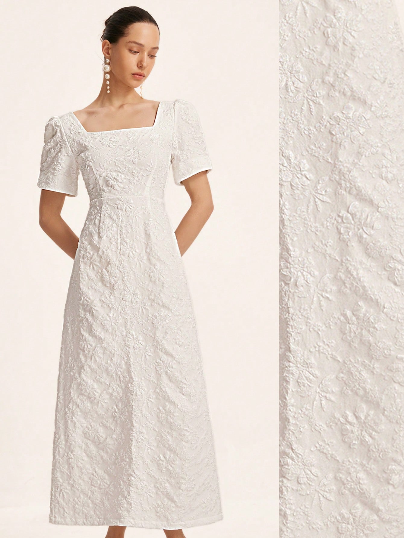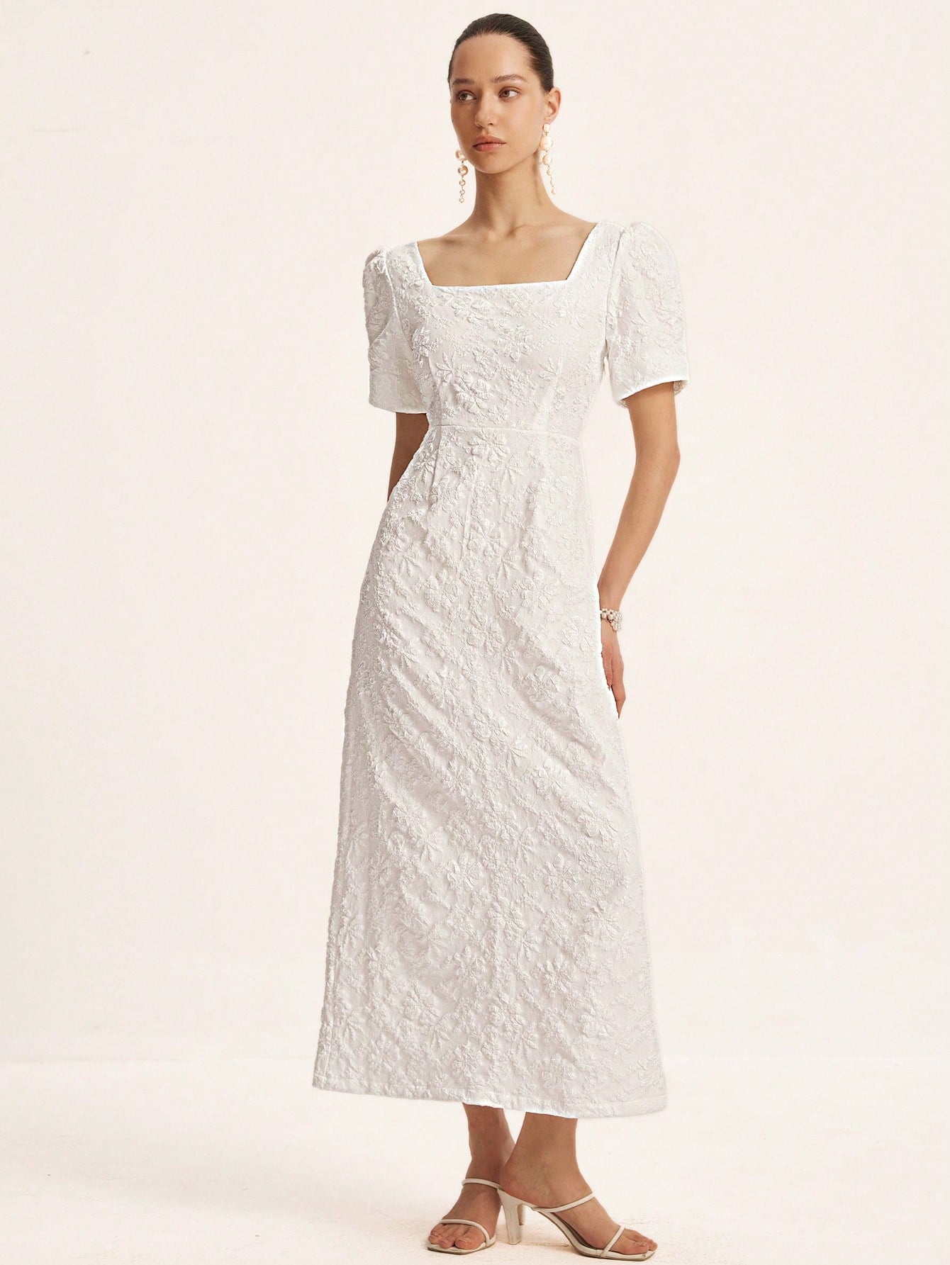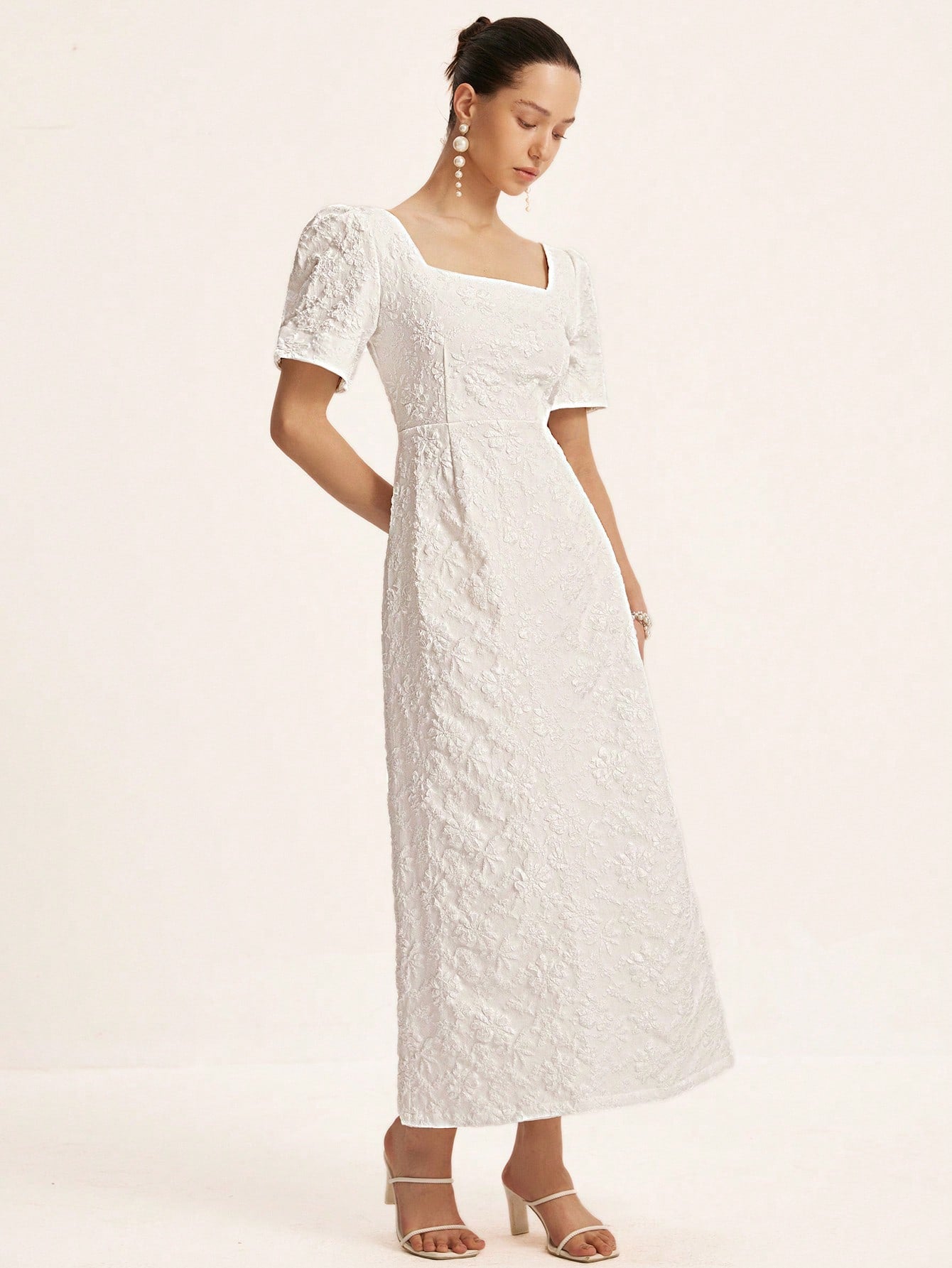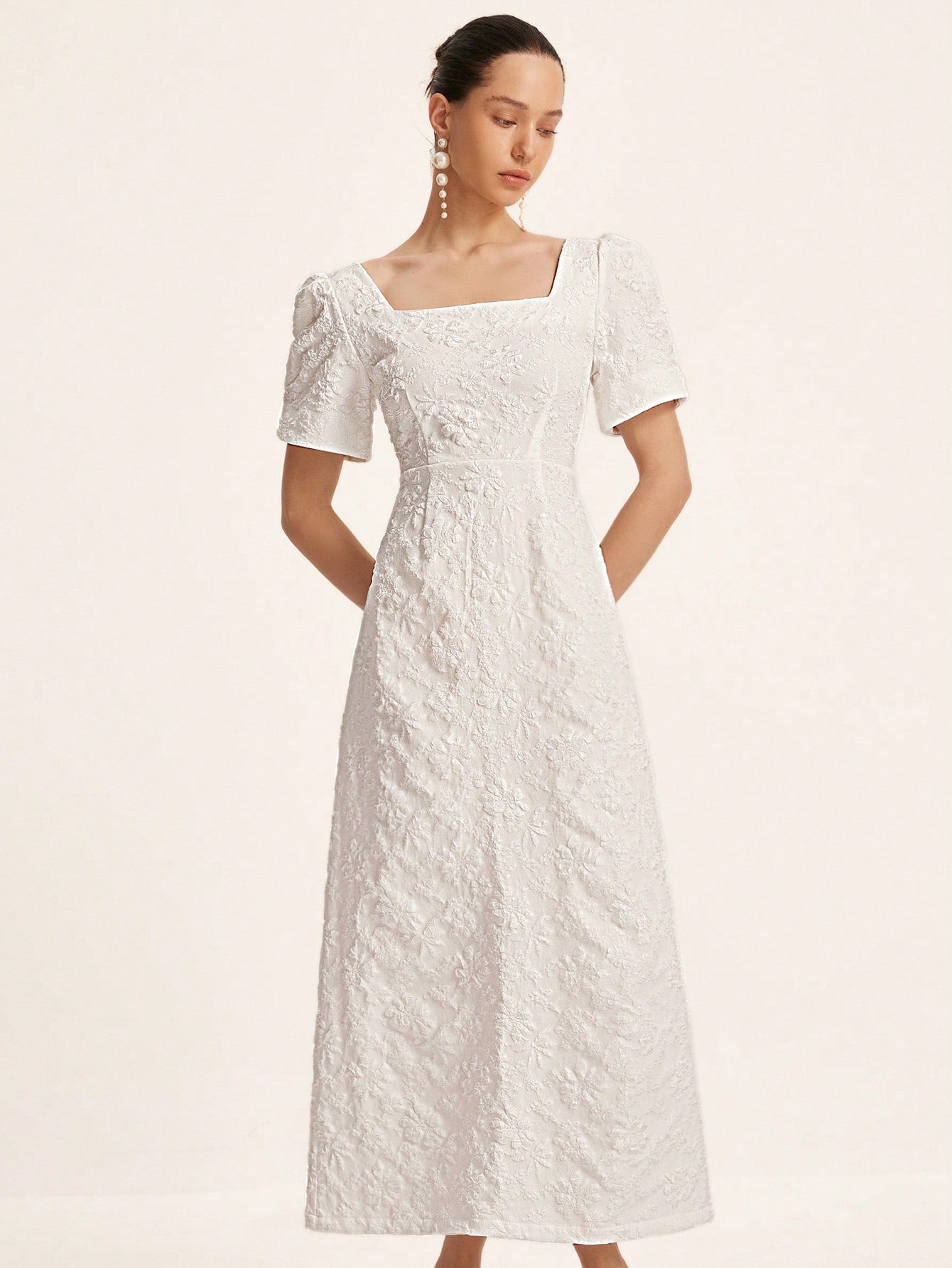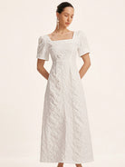 Aveloria Rosie French Retro Romantic Solid Color Jacquard Weave Square Collar Puff Sleeve Fitted Cinched