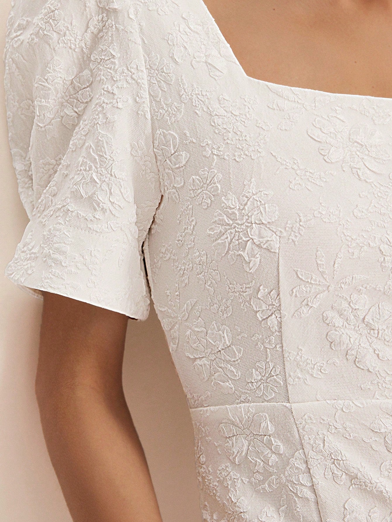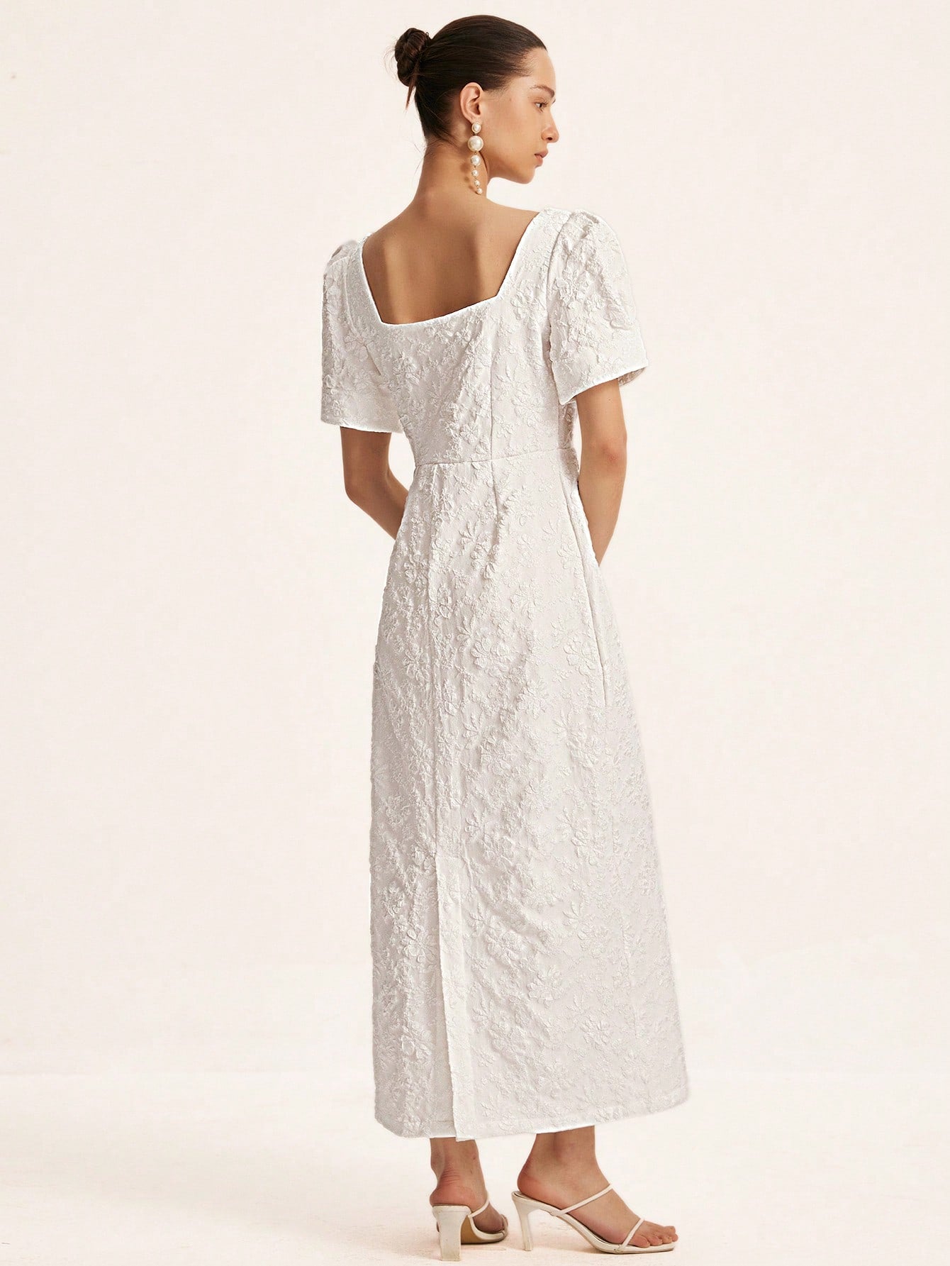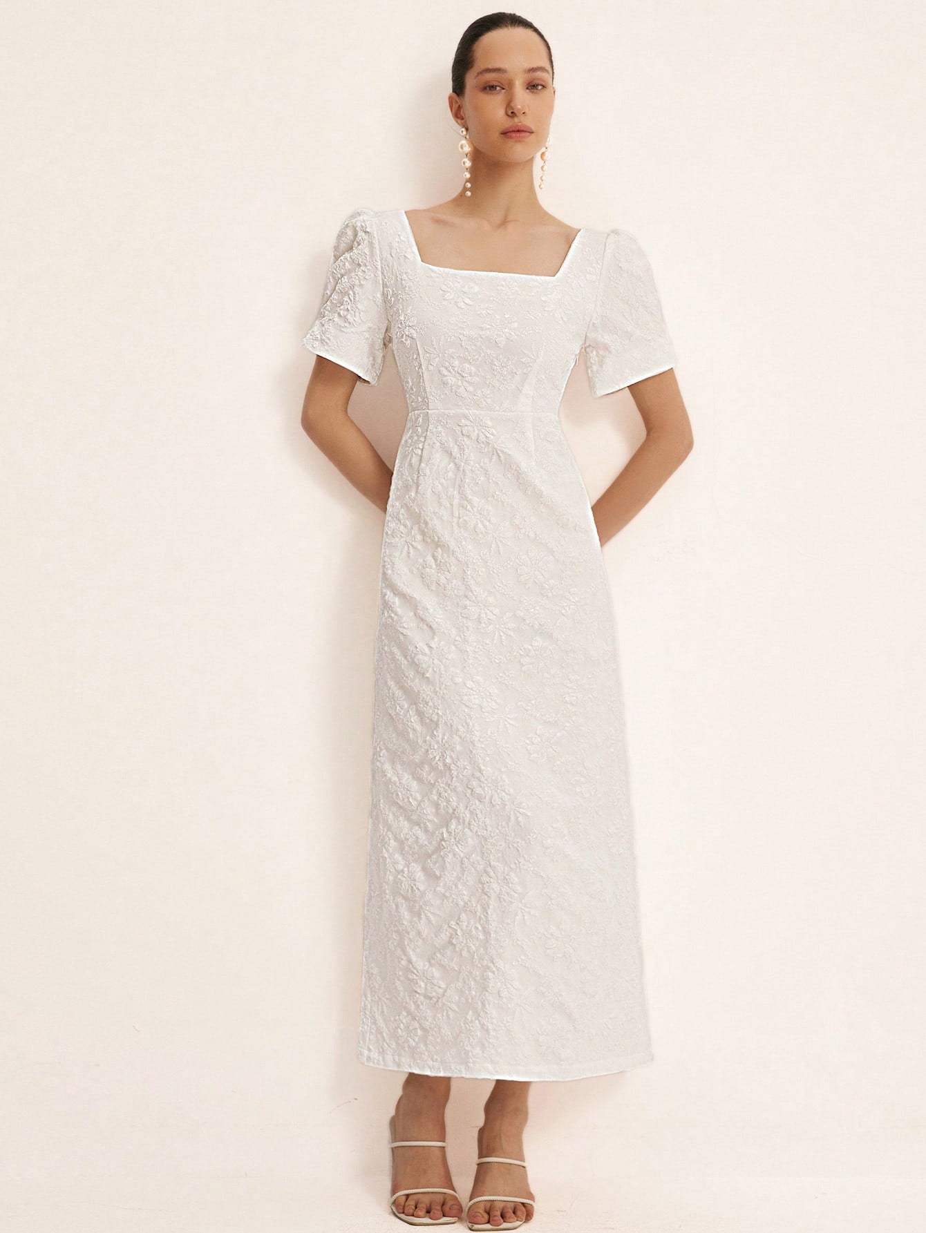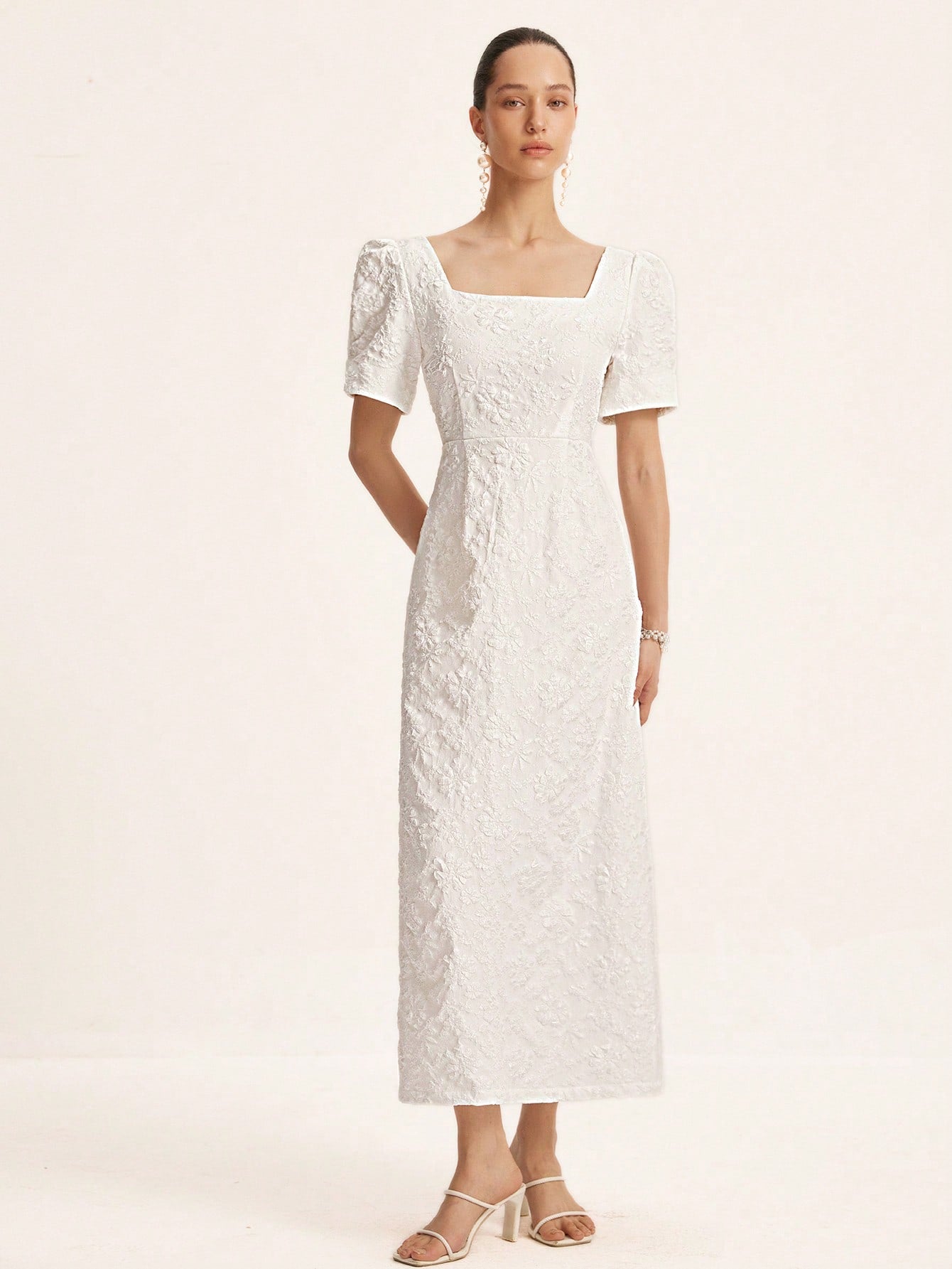 Aveloria Rosie French Retro Romantic Solid Color Jacquard Weave Square Collar Puff Sleeve Fitted Cinched