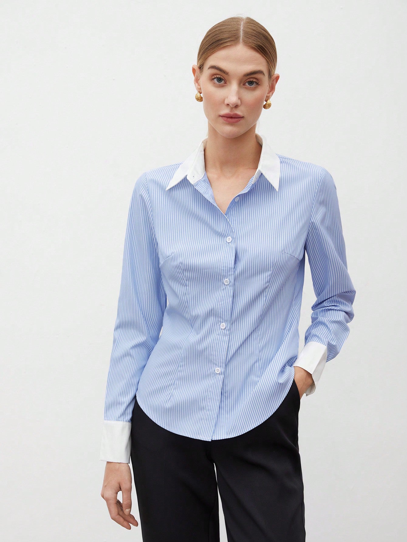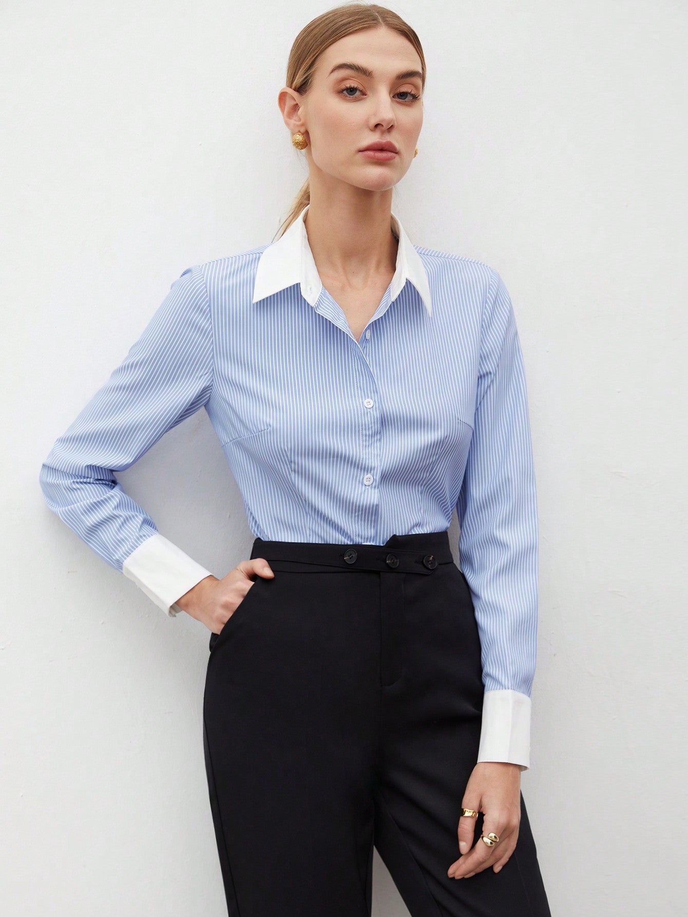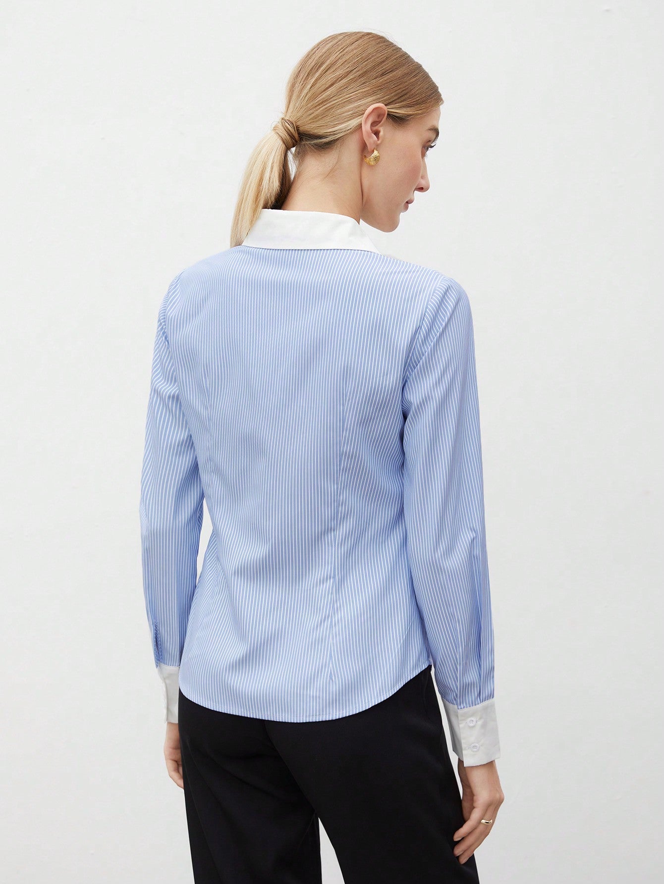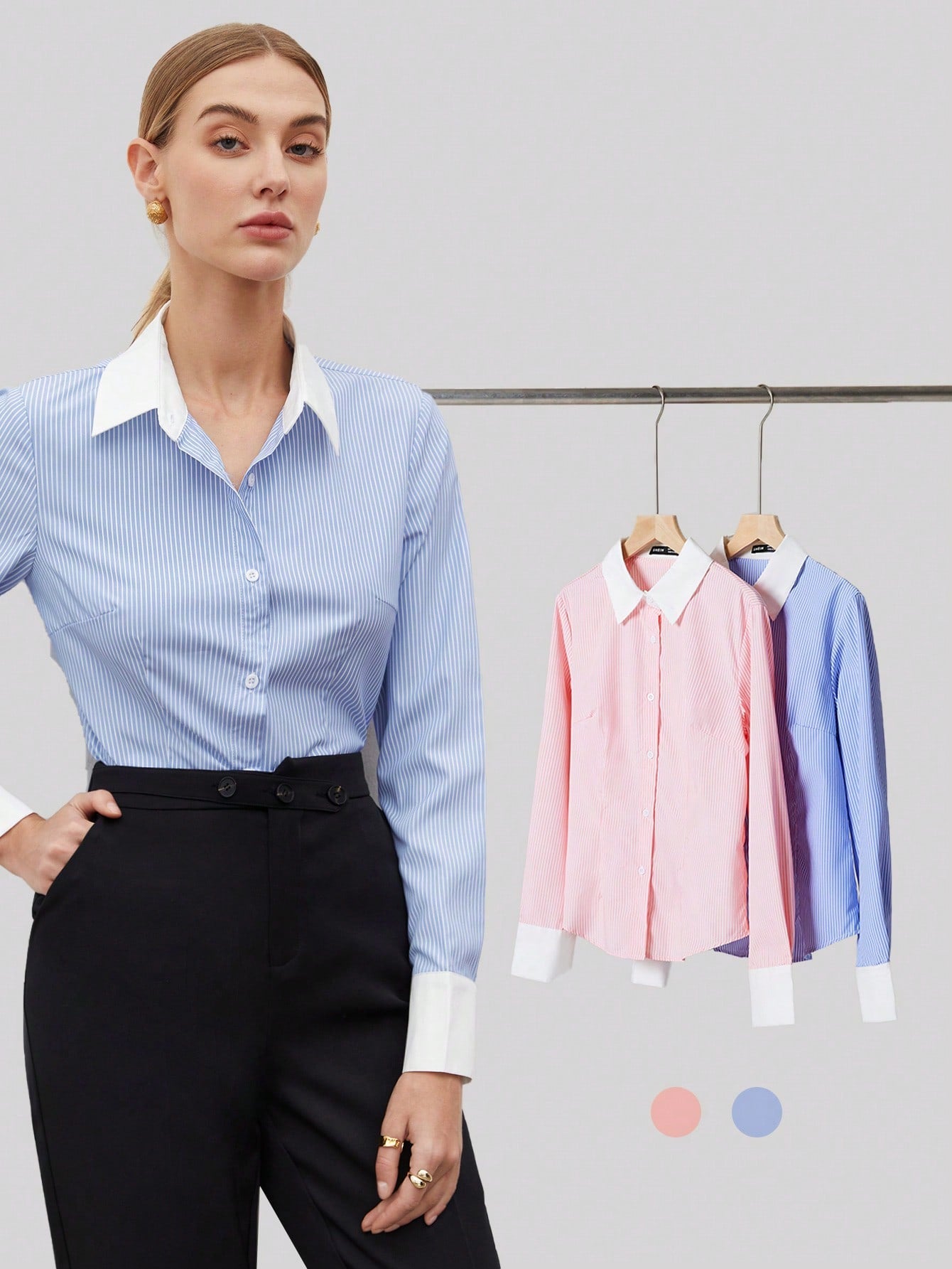 women BizChic Women's Color-Blocking Striped Shirt With Turn-Down Collar
