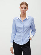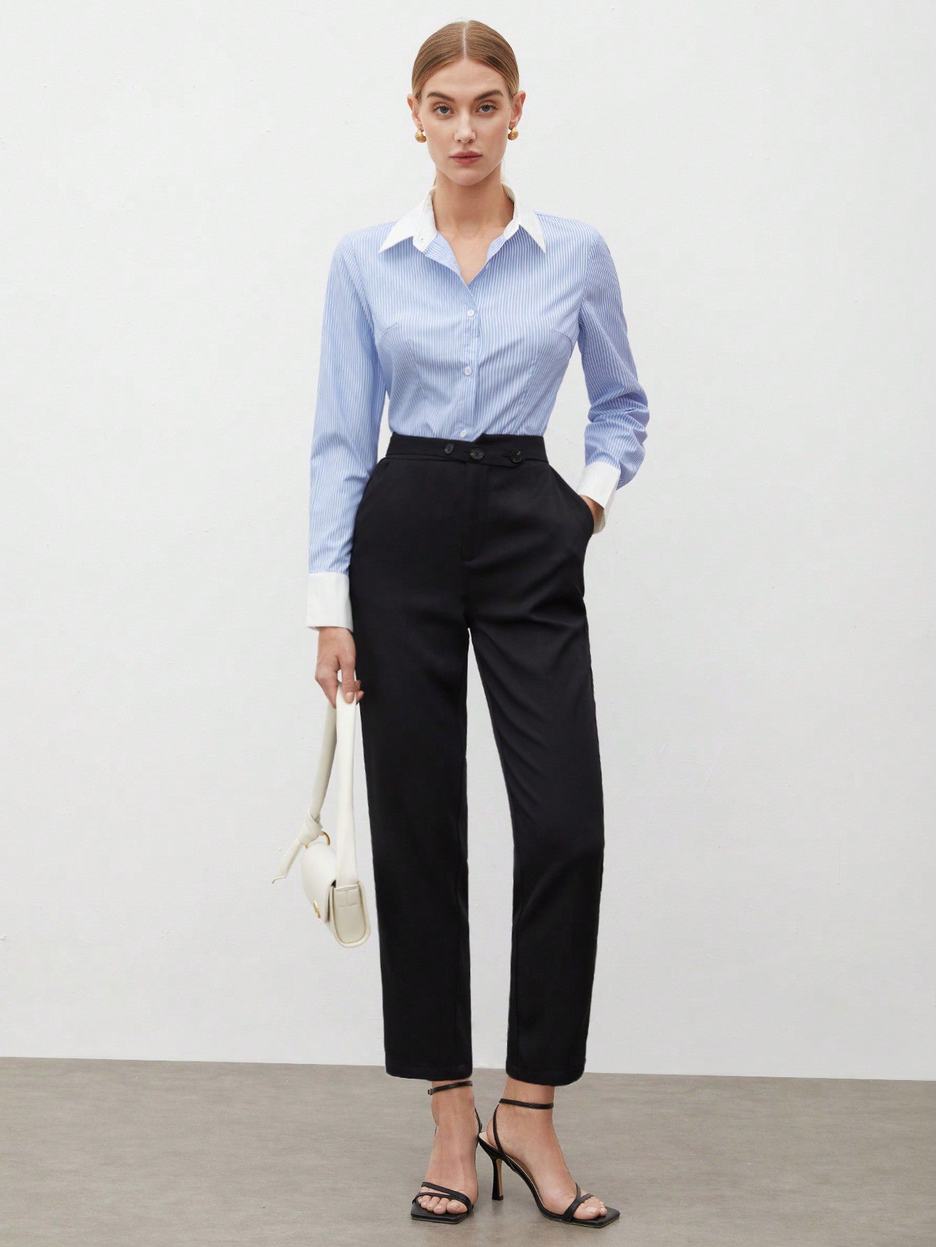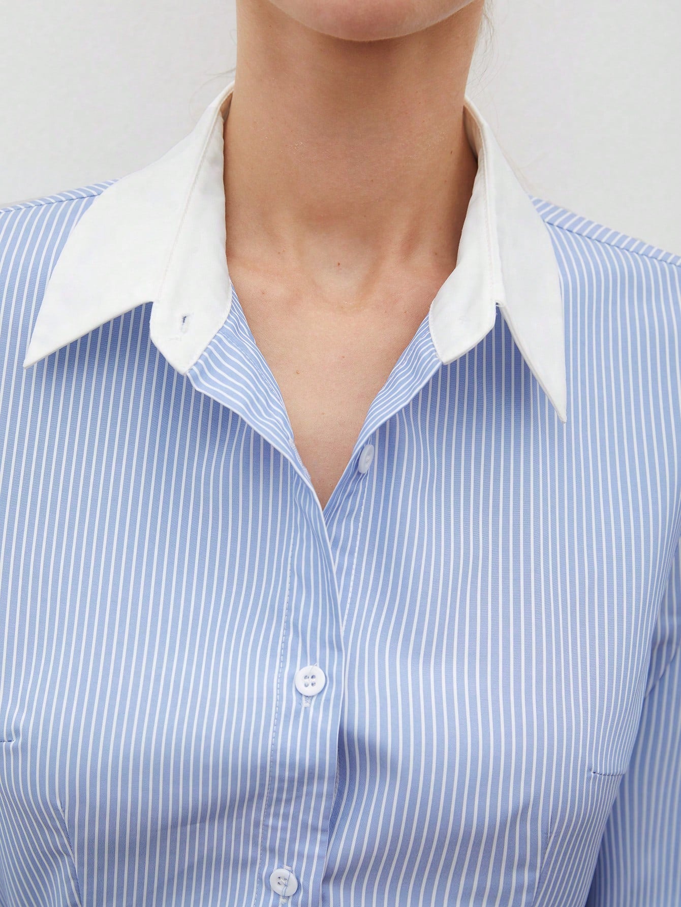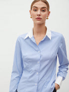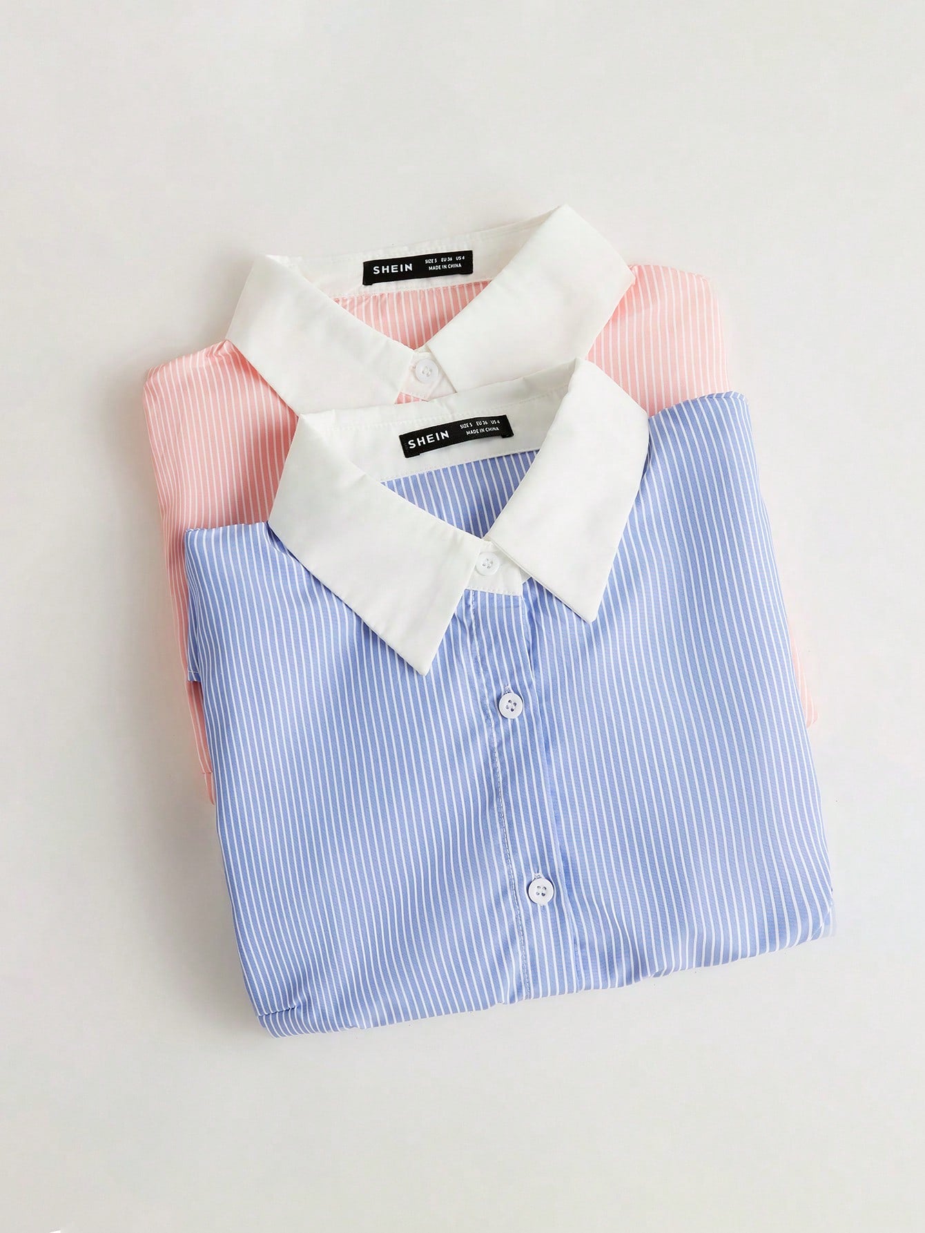 women BizChic Women's Color-Blocking Striped Shirt With Turn-Down Collar