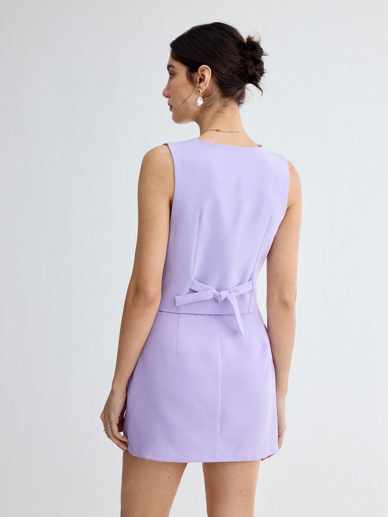 BizChic Women's Solid Color Sleeveless Suit Vest With Front Button Closure & Asymmetrical Hem Skirt With