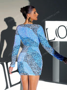Blue V-Neck Long Sleeve Asymmetrical Formal Gown Dress, Elegant Semi Formal Prom Dress, For Birthday,