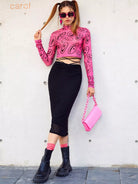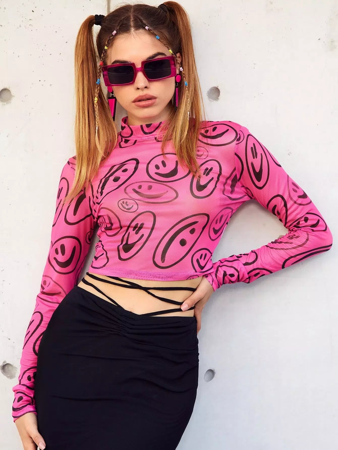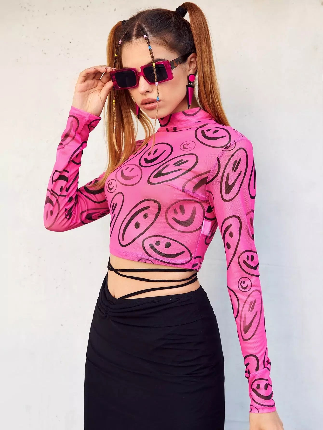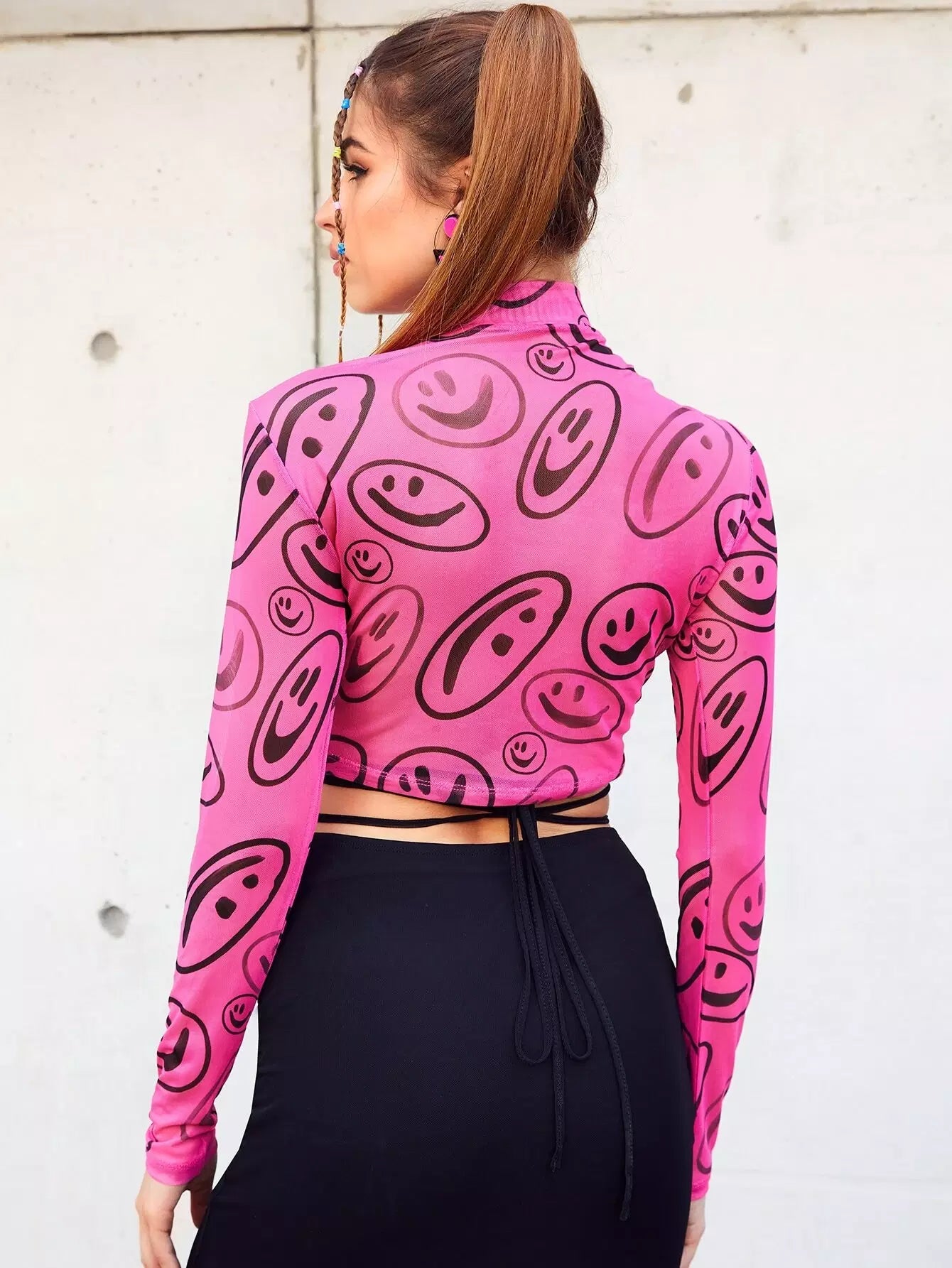 Cartoon Face Print Stand Neck Mesh Crop Top