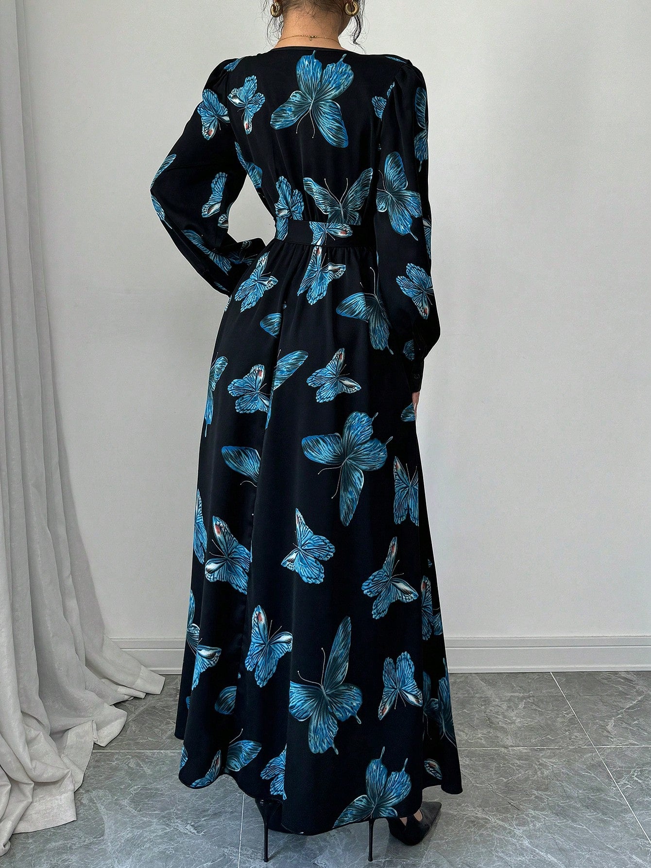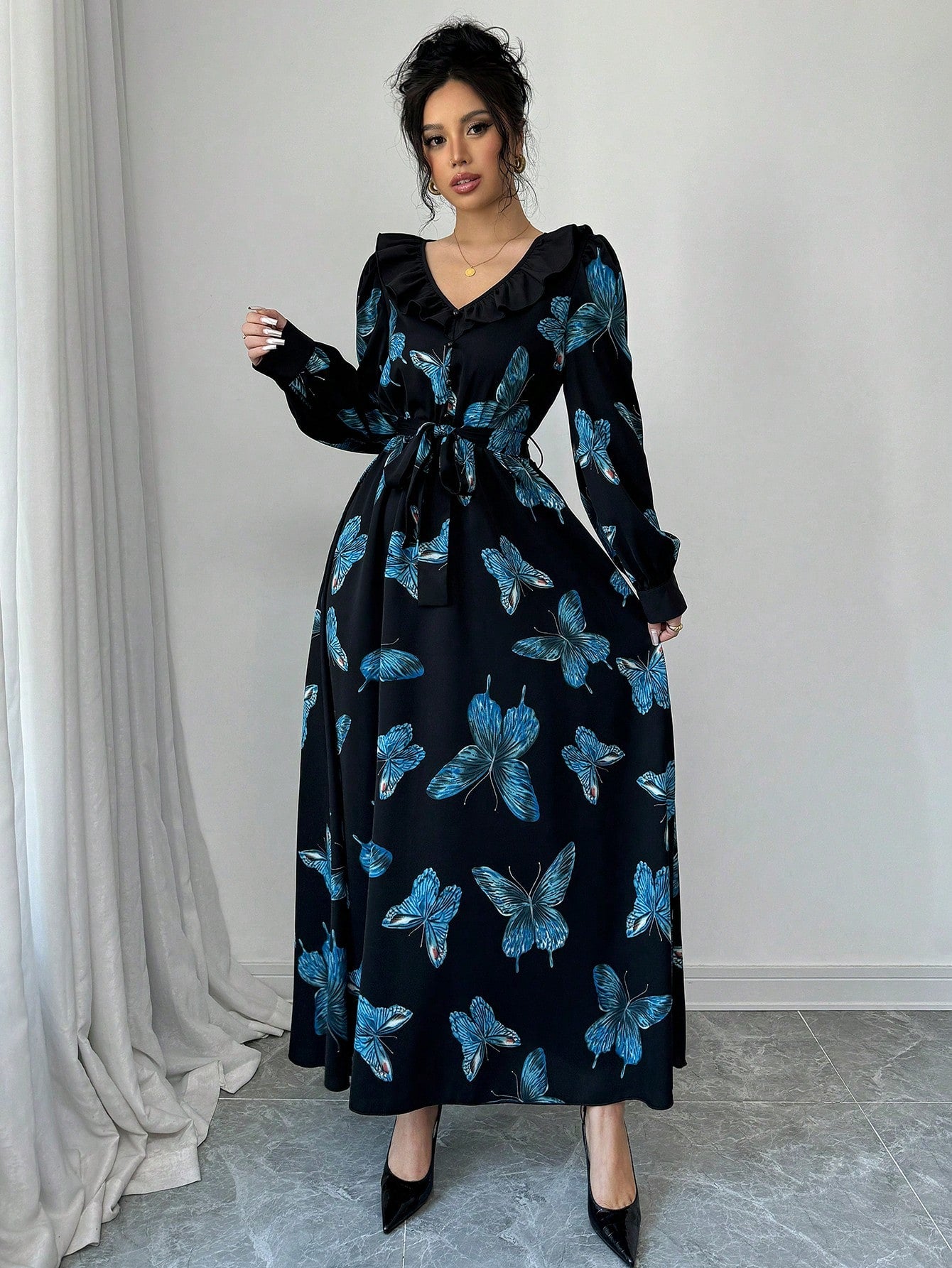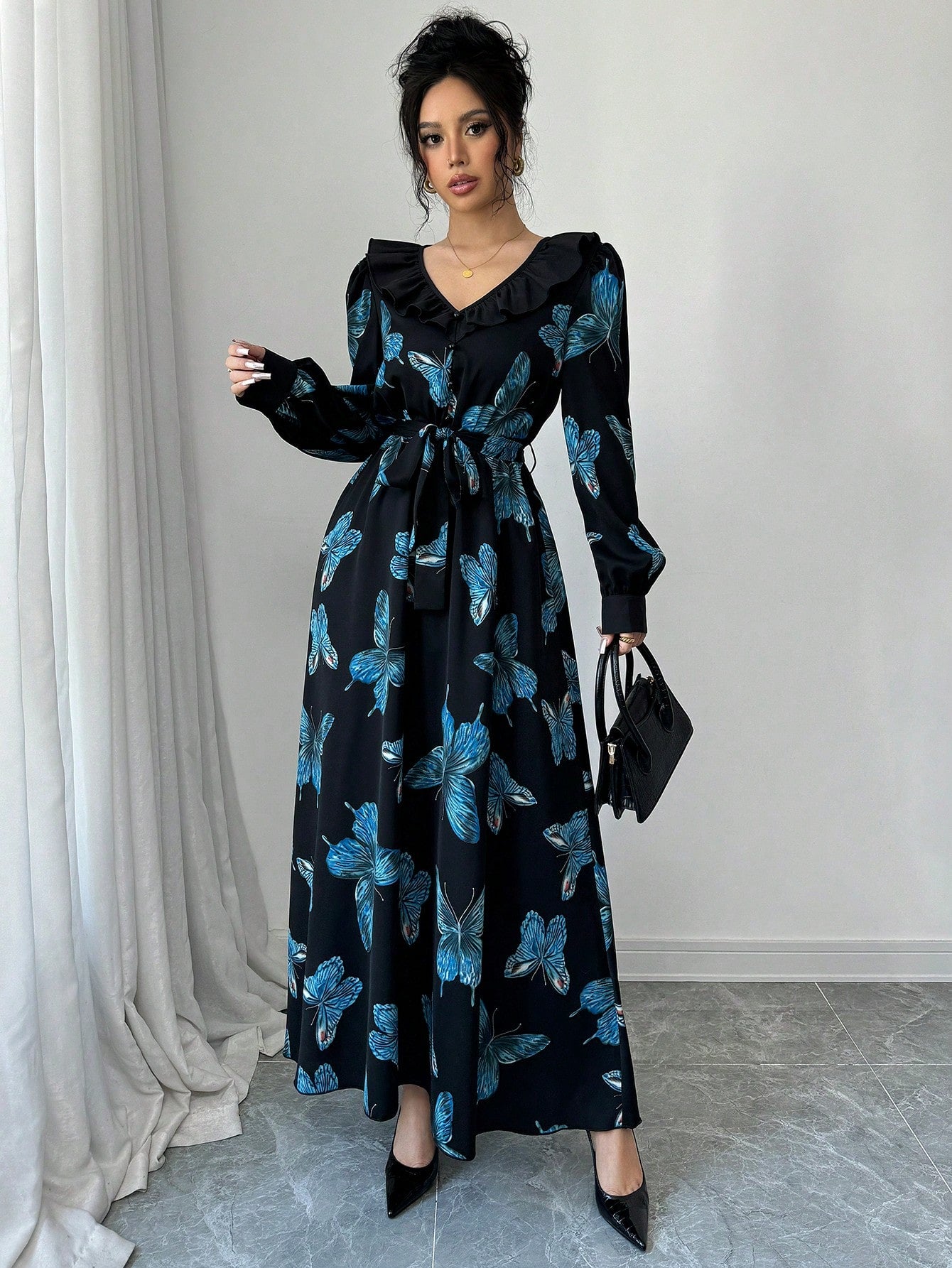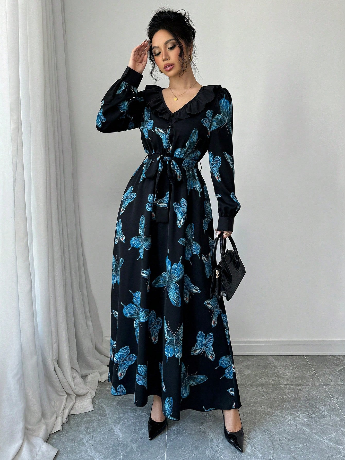 Chiquease Butterfly Print Vintage Elegant Waist-Cinched V-Neck Ruffle Hem Midi Dress