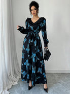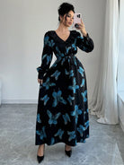 women Chiquease Butterfly Print Vintage Elegant Waist-Cinched V-Neck Ruffle Hem Midi Dress