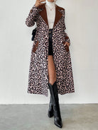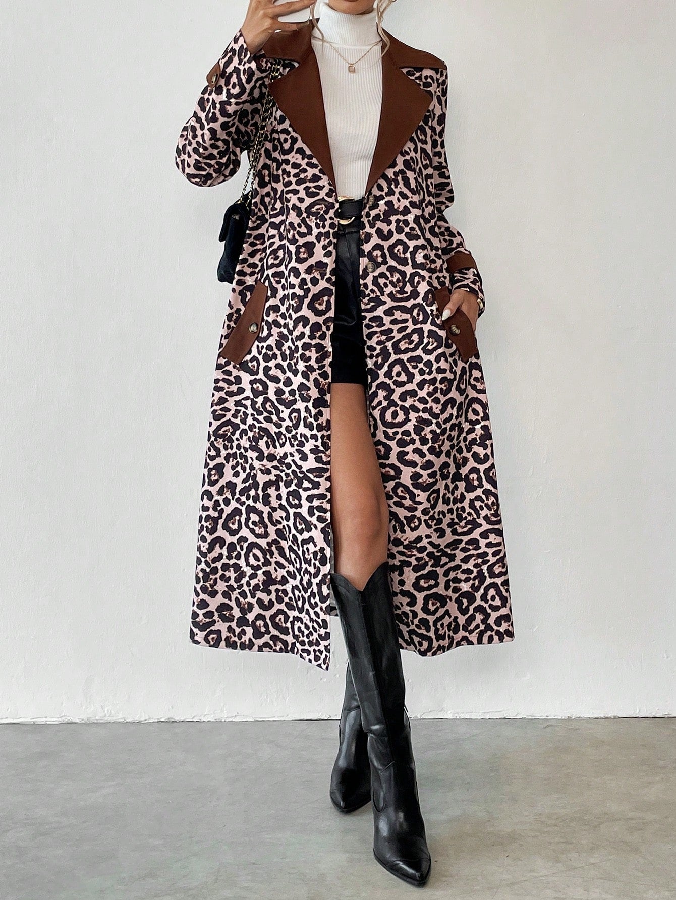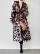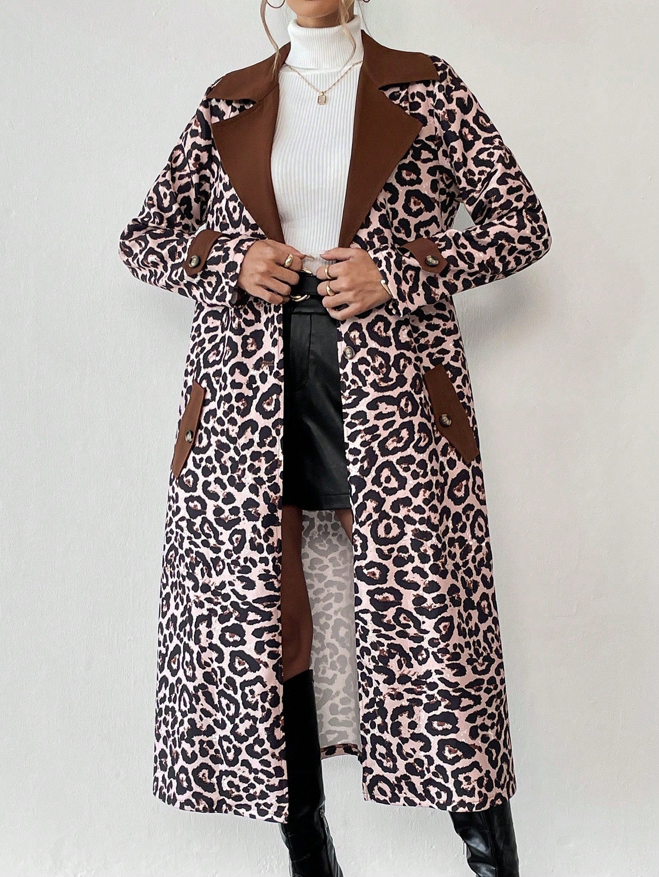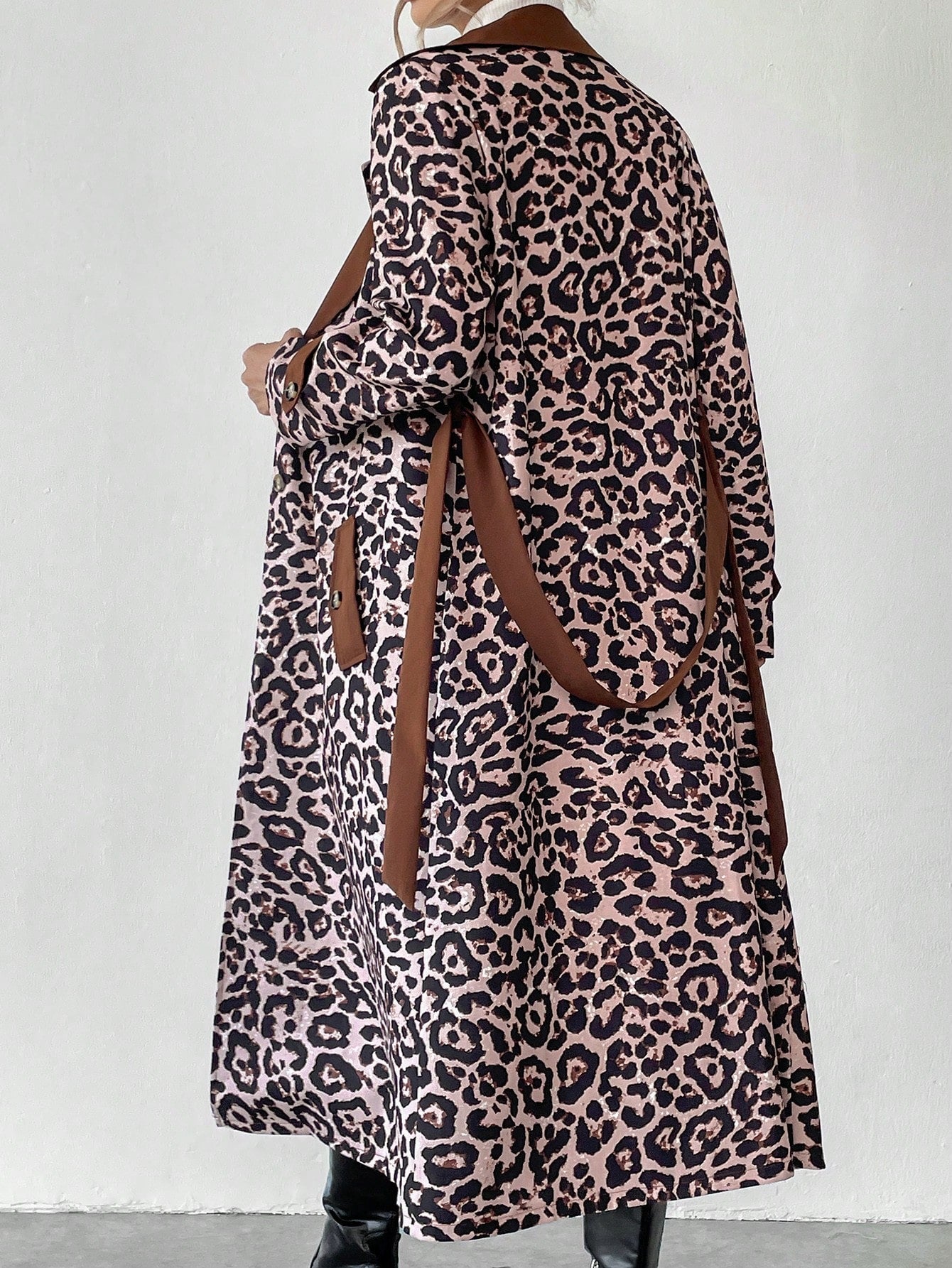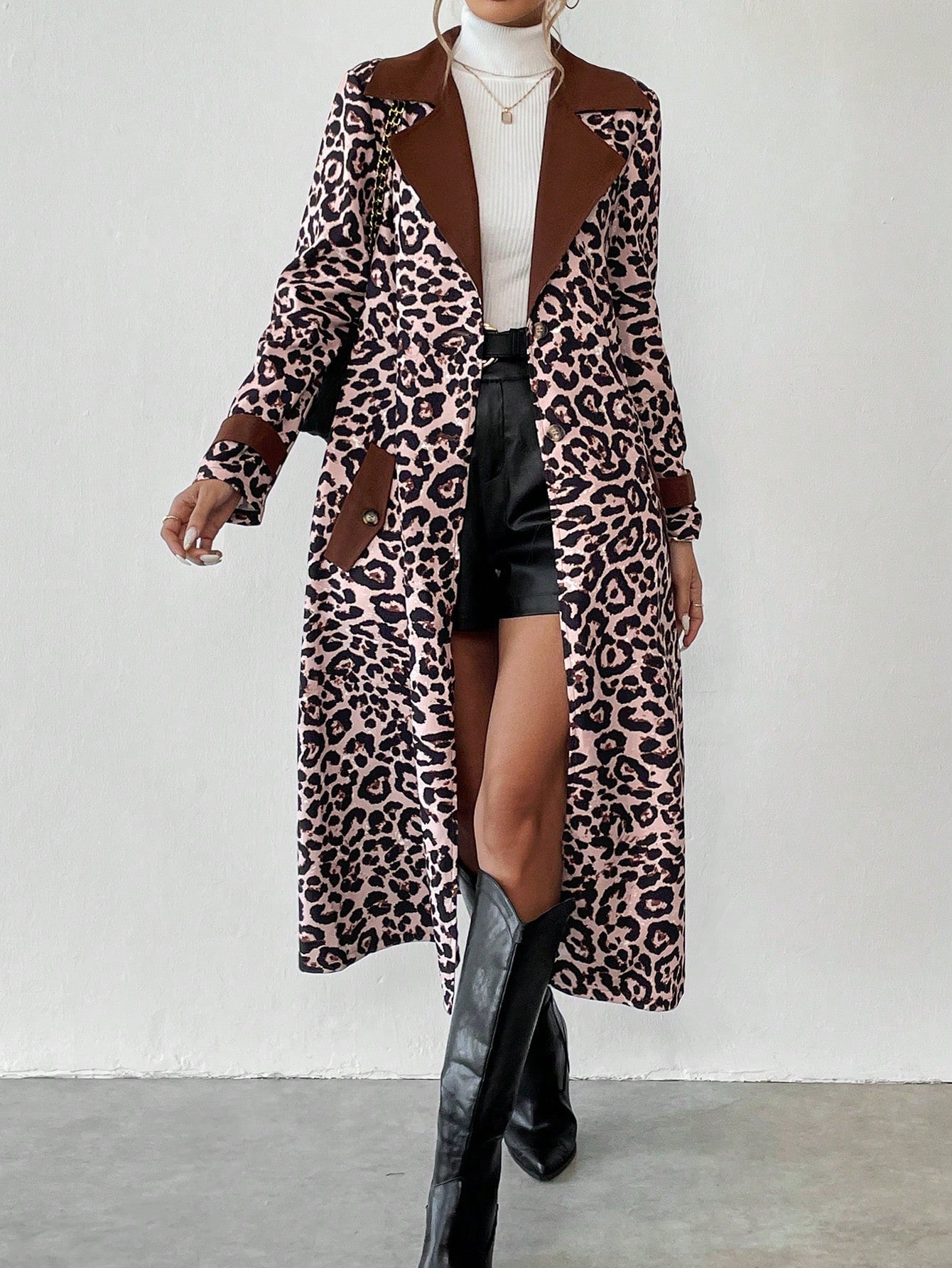 Chiquease Printed Random Pattern Big Lapel Contrast Color Tie Cuff Long Sleeve Leopard Print Maxi Trench