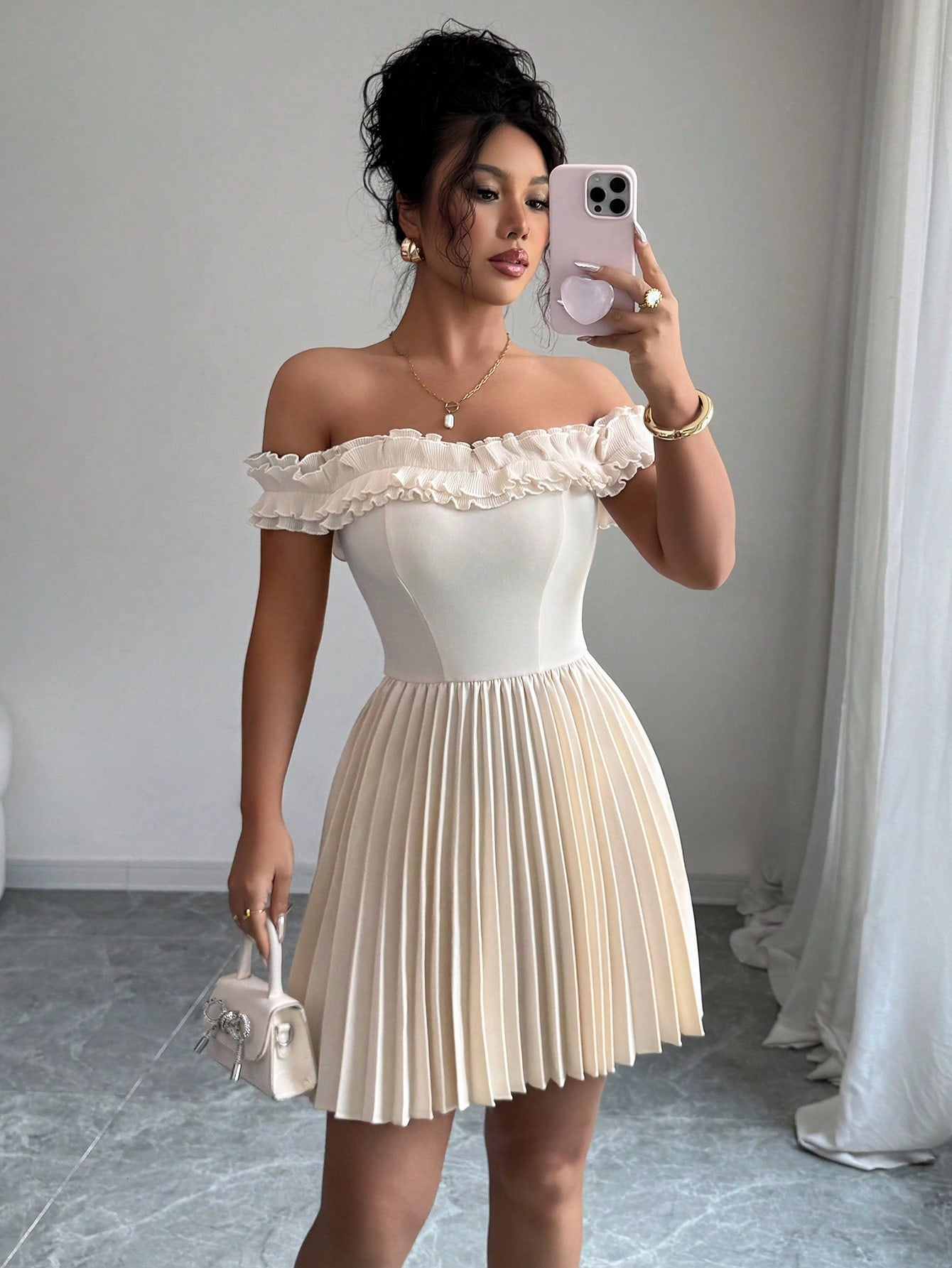 Chiquease Women's Romantic Ruffle Off Shoulder Solid Color Waisted Pleated Hem Short Dress