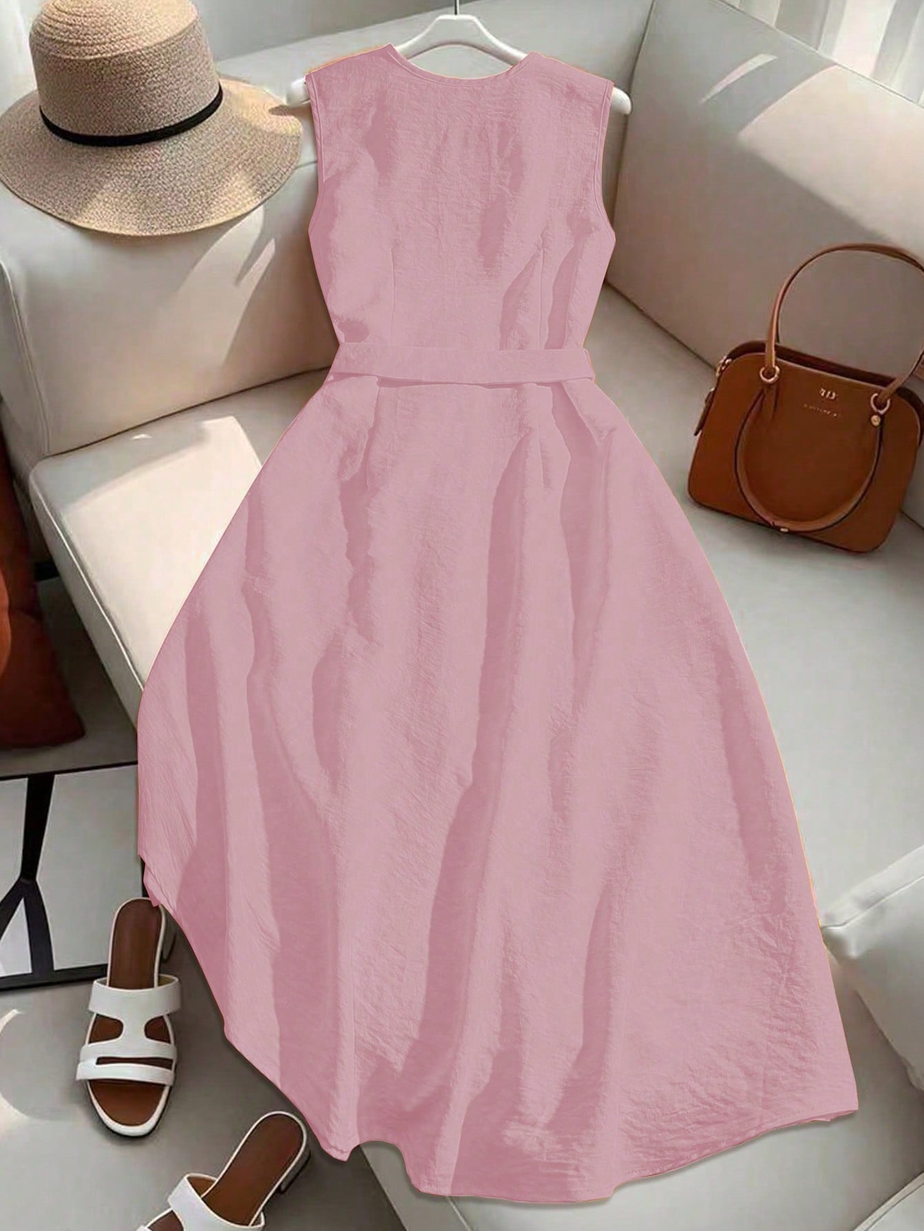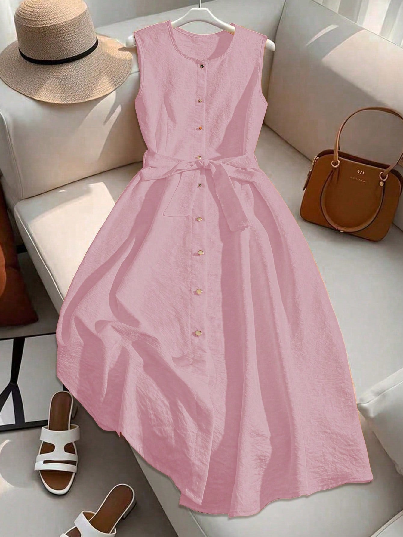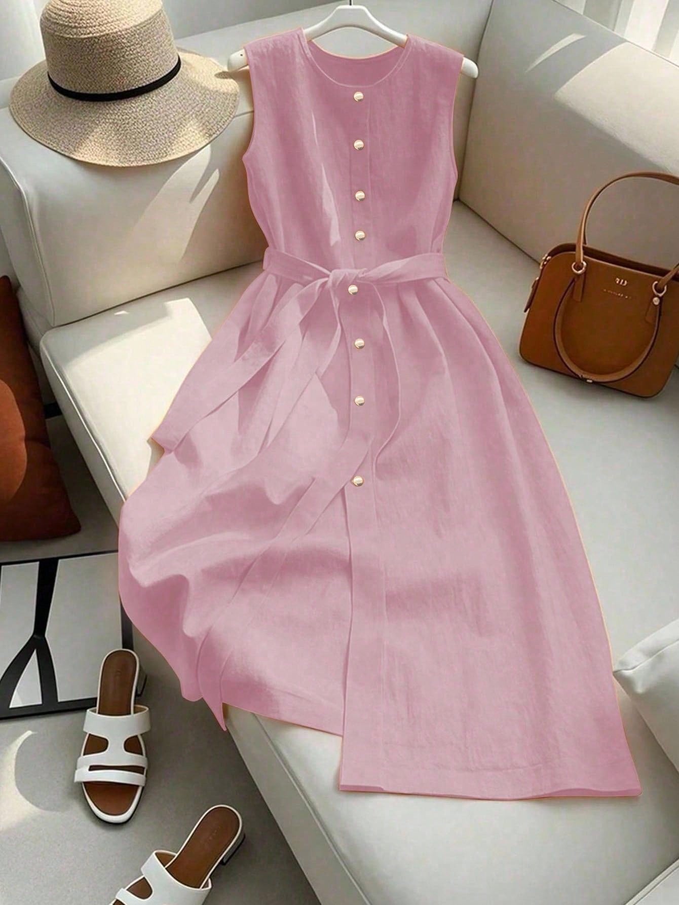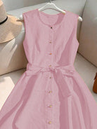 Chiquease Women's Solid Color Single-Breasted Round Neck French Elegant Sleeveless Dress