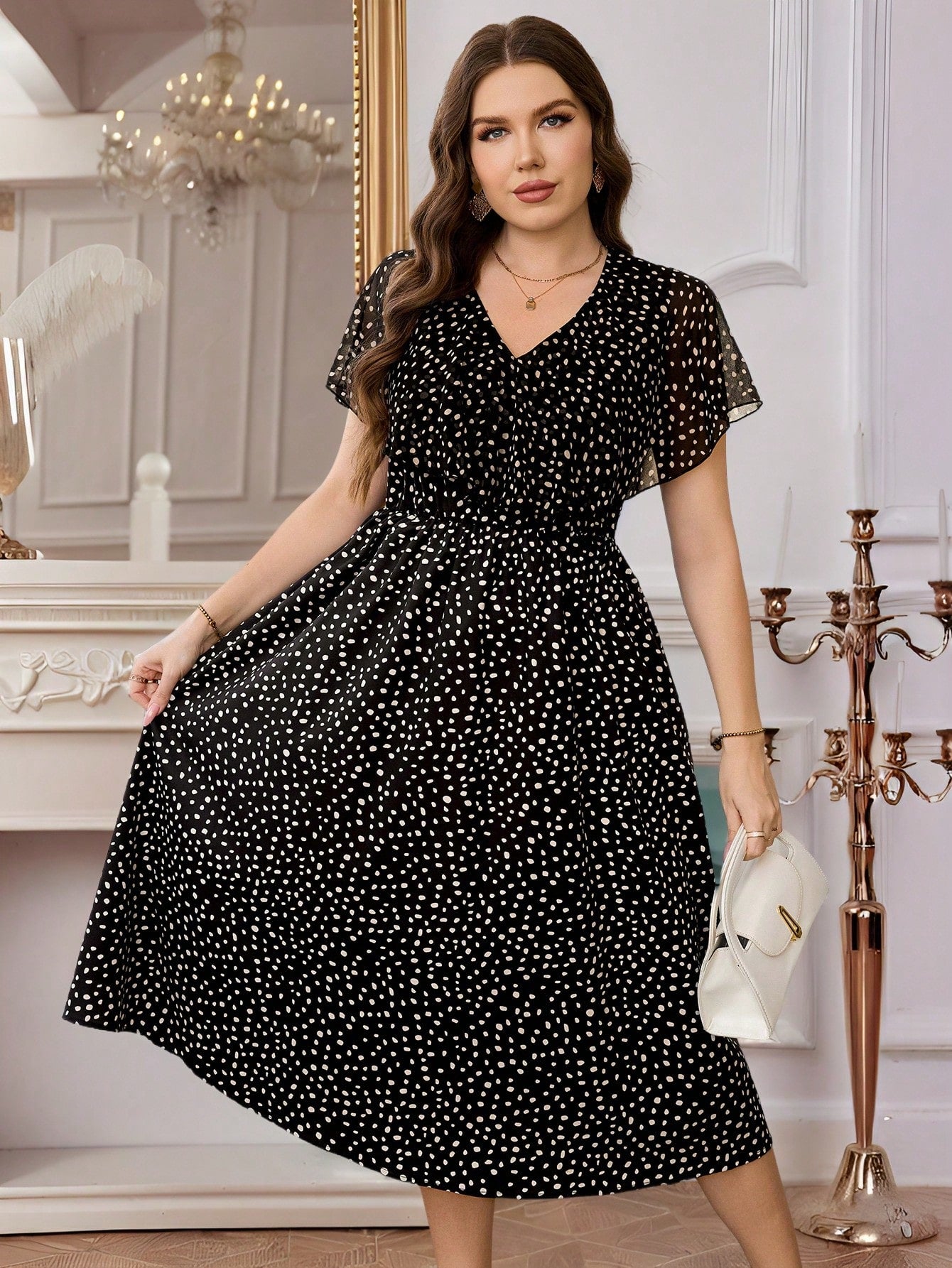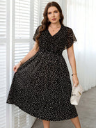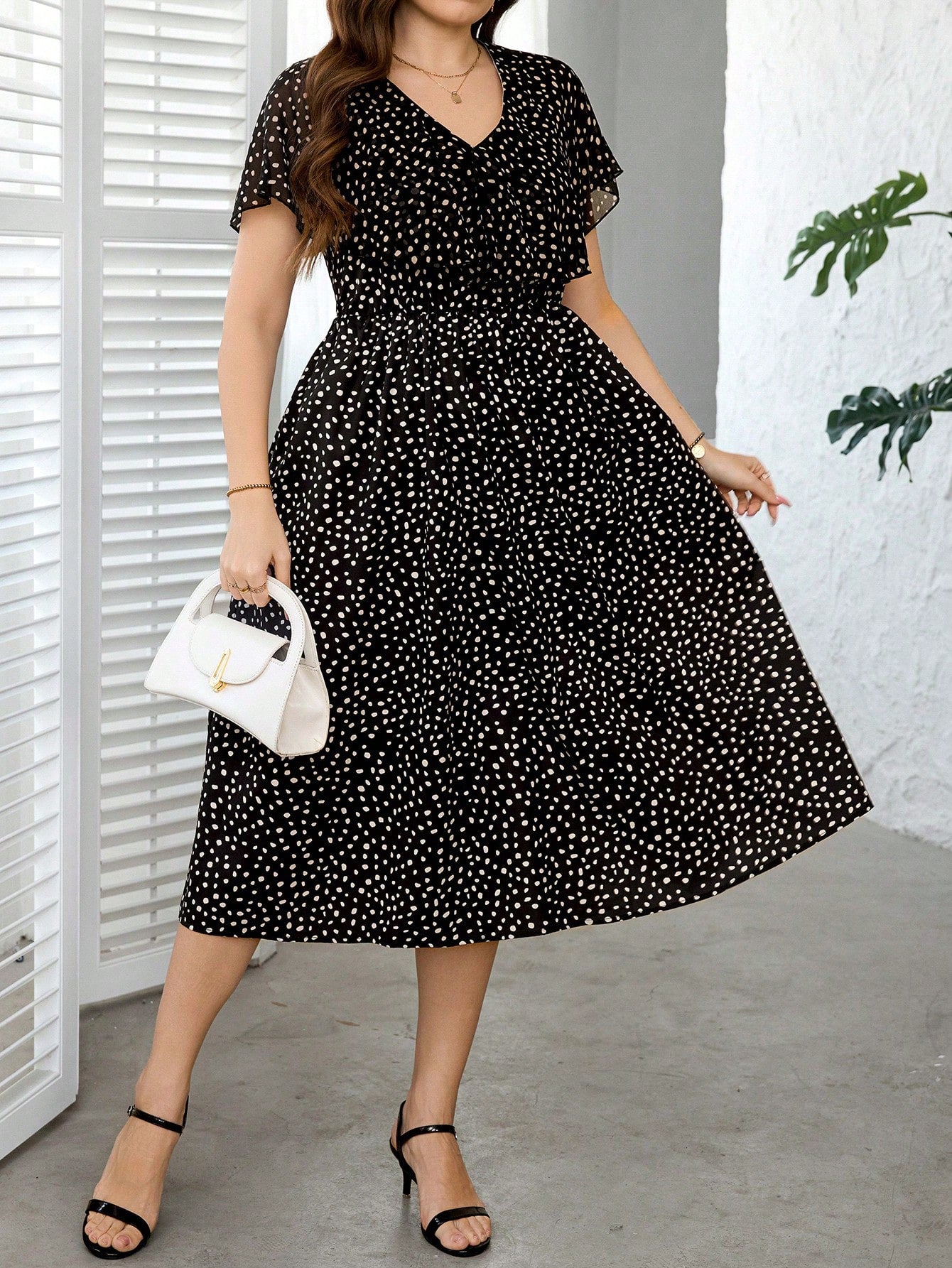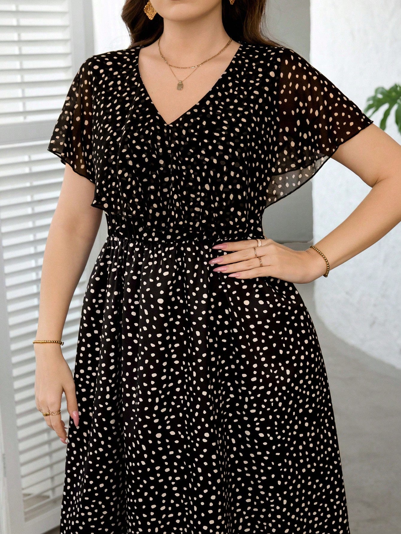 Clasi Plus Size Women V Neck Ruffle Short Sleeve Polka Dot Dress, Elegant,Polka Dot Dress,Dresses For