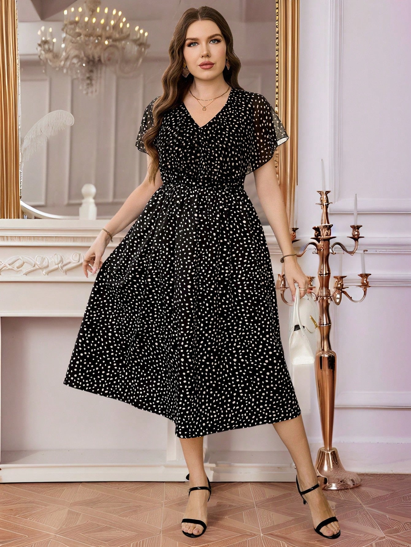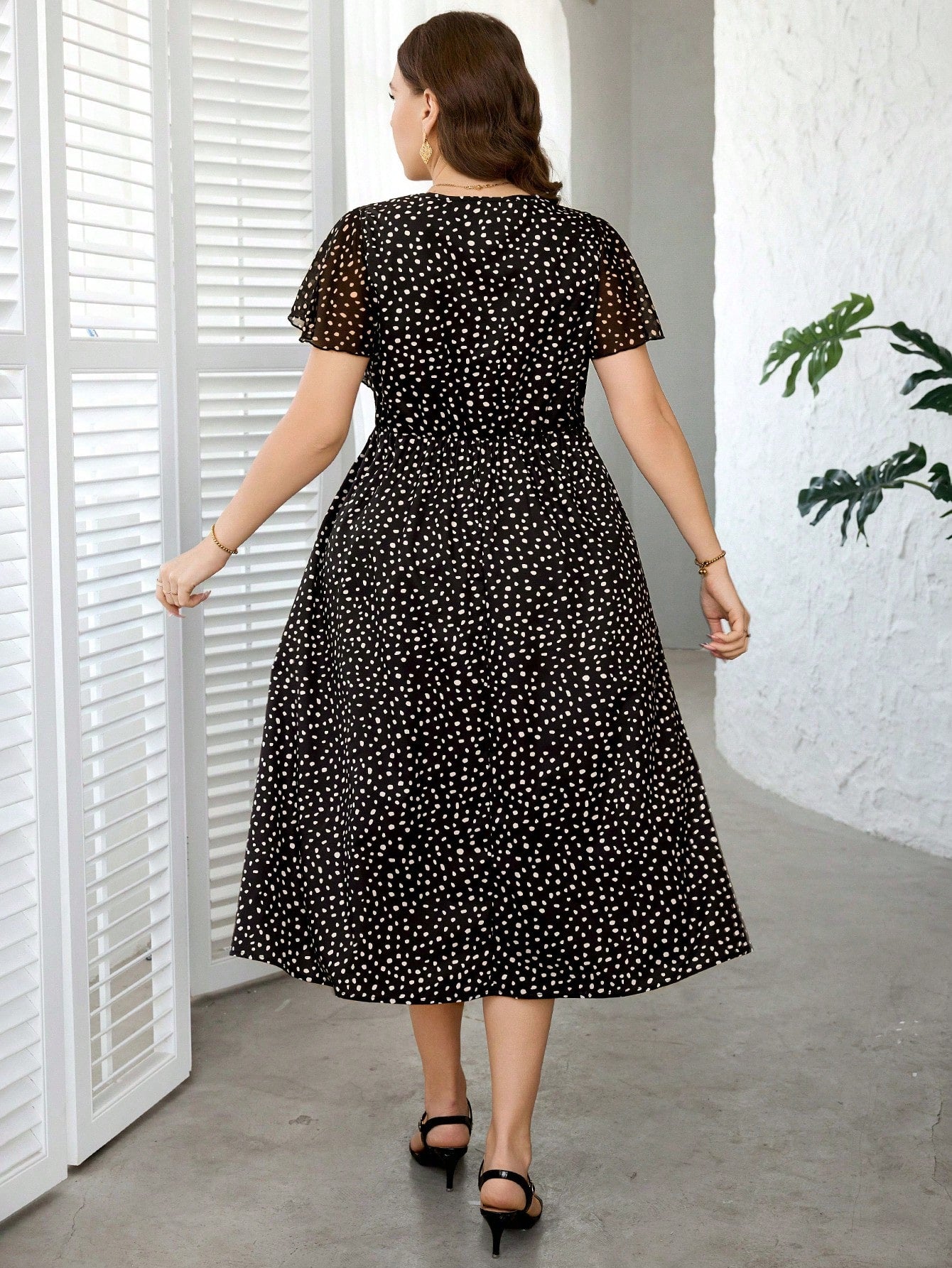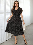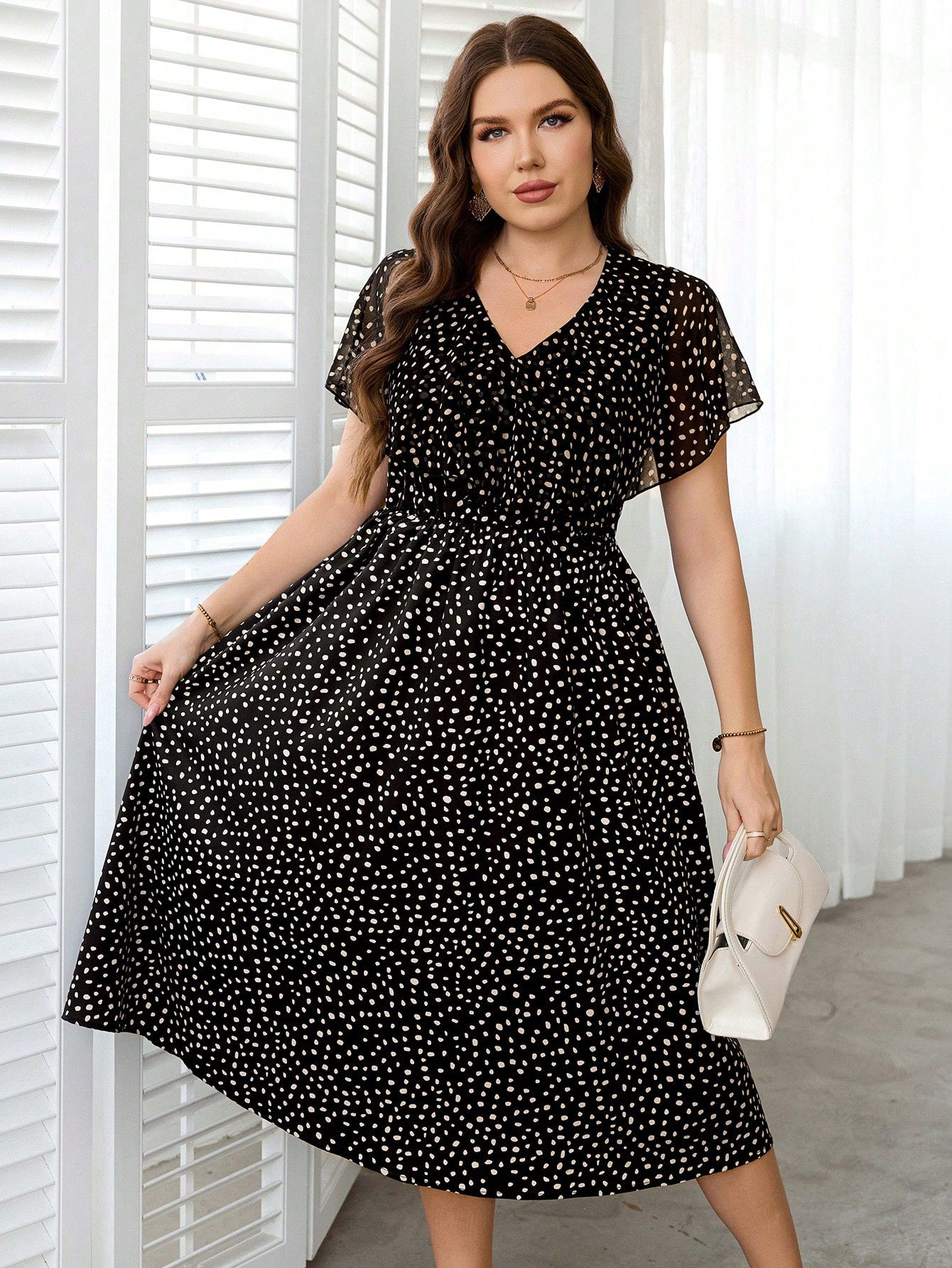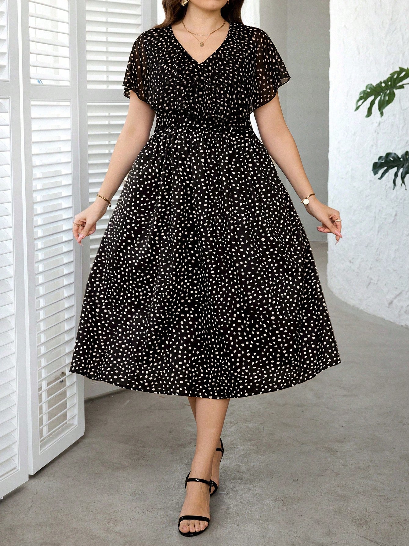 Clasi Plus Size Women V Neck Ruffle Short Sleeve Polka Dot Dress, Elegant,Polka Dot Dress,Dresses For