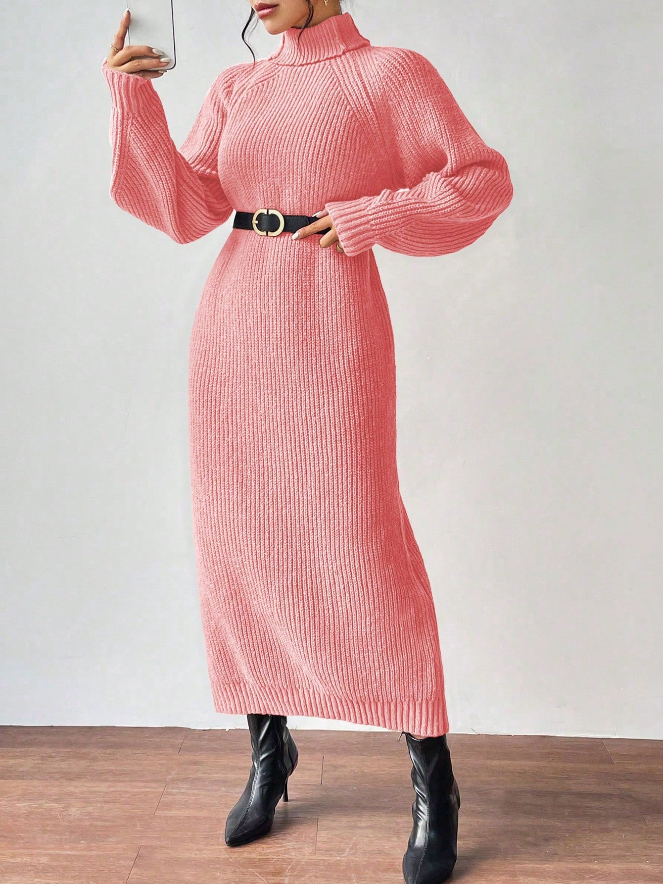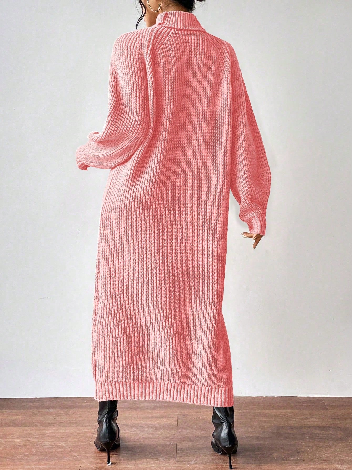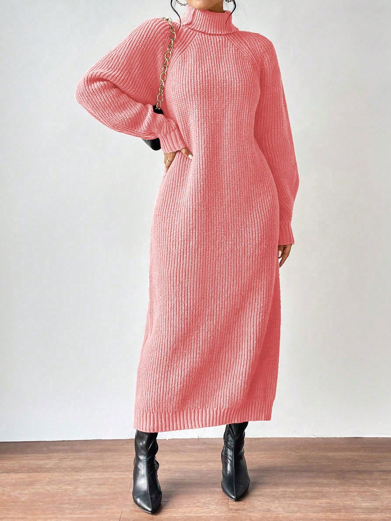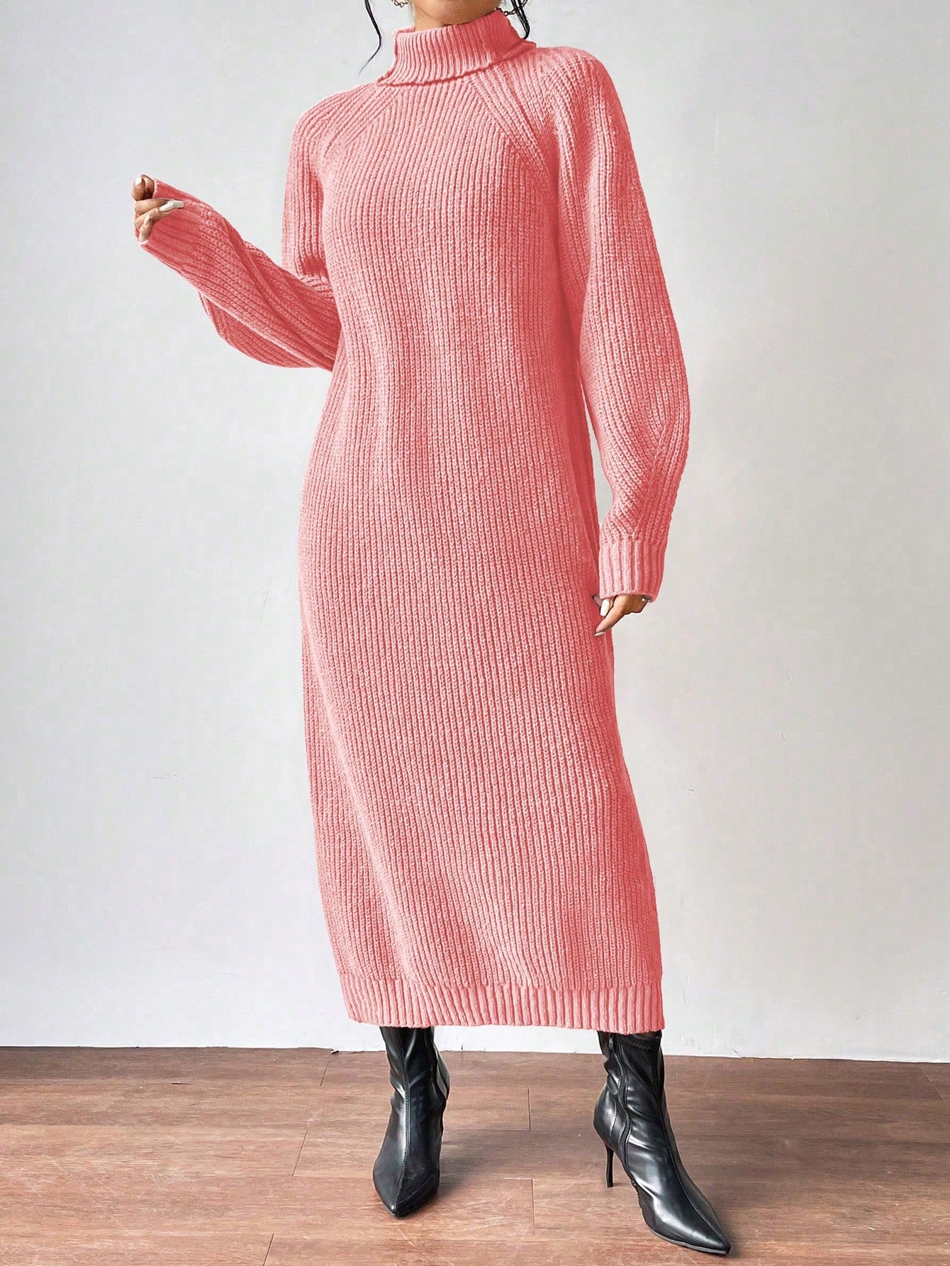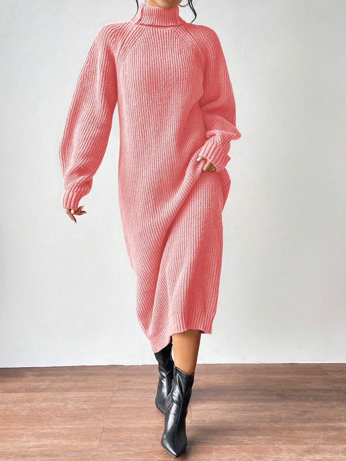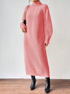 Clasi Women High Collar Raglan Sleeve Solid Color Loose Knitted Sweater Dress, Casual Wear For Autumn/Winter