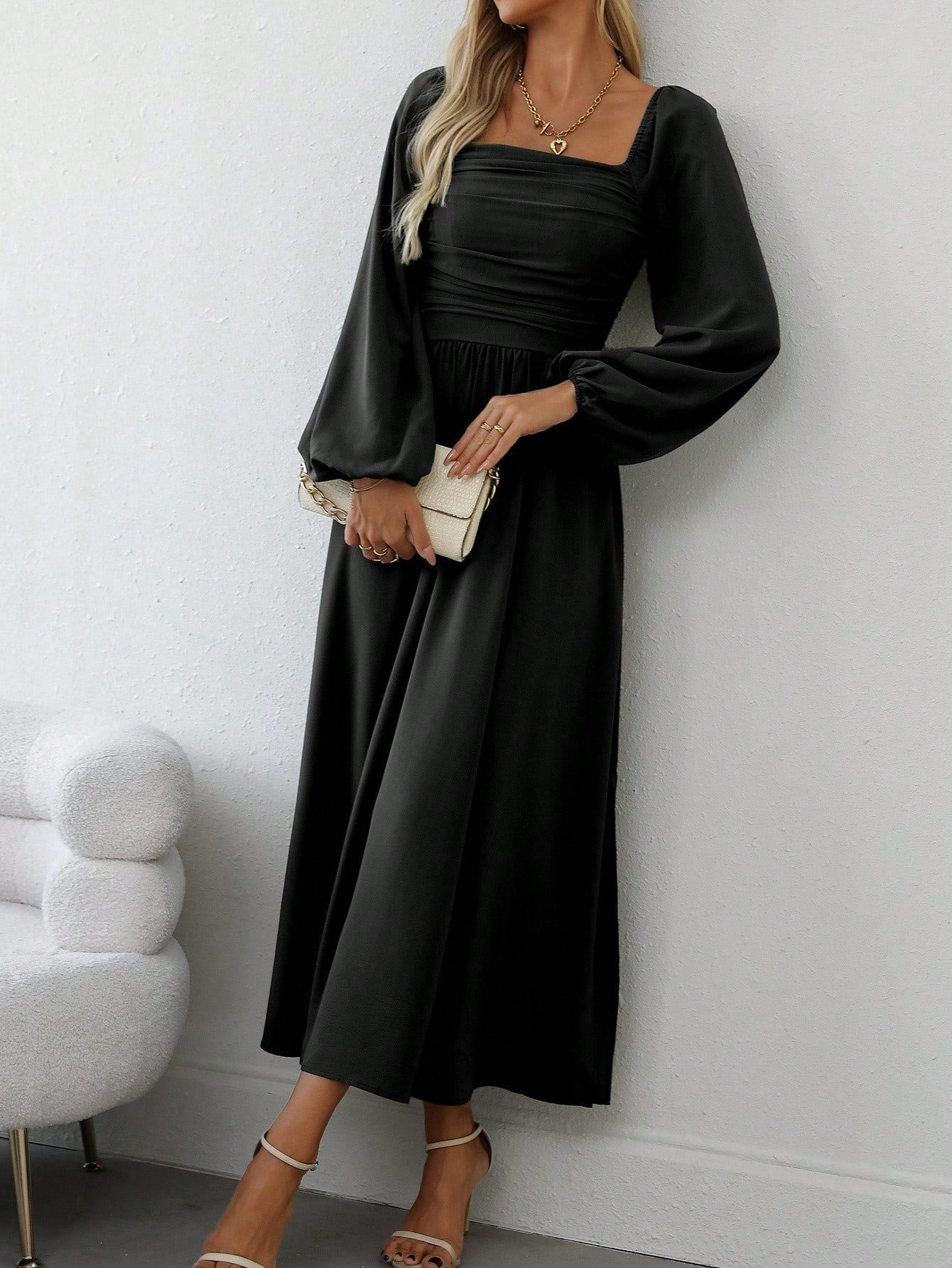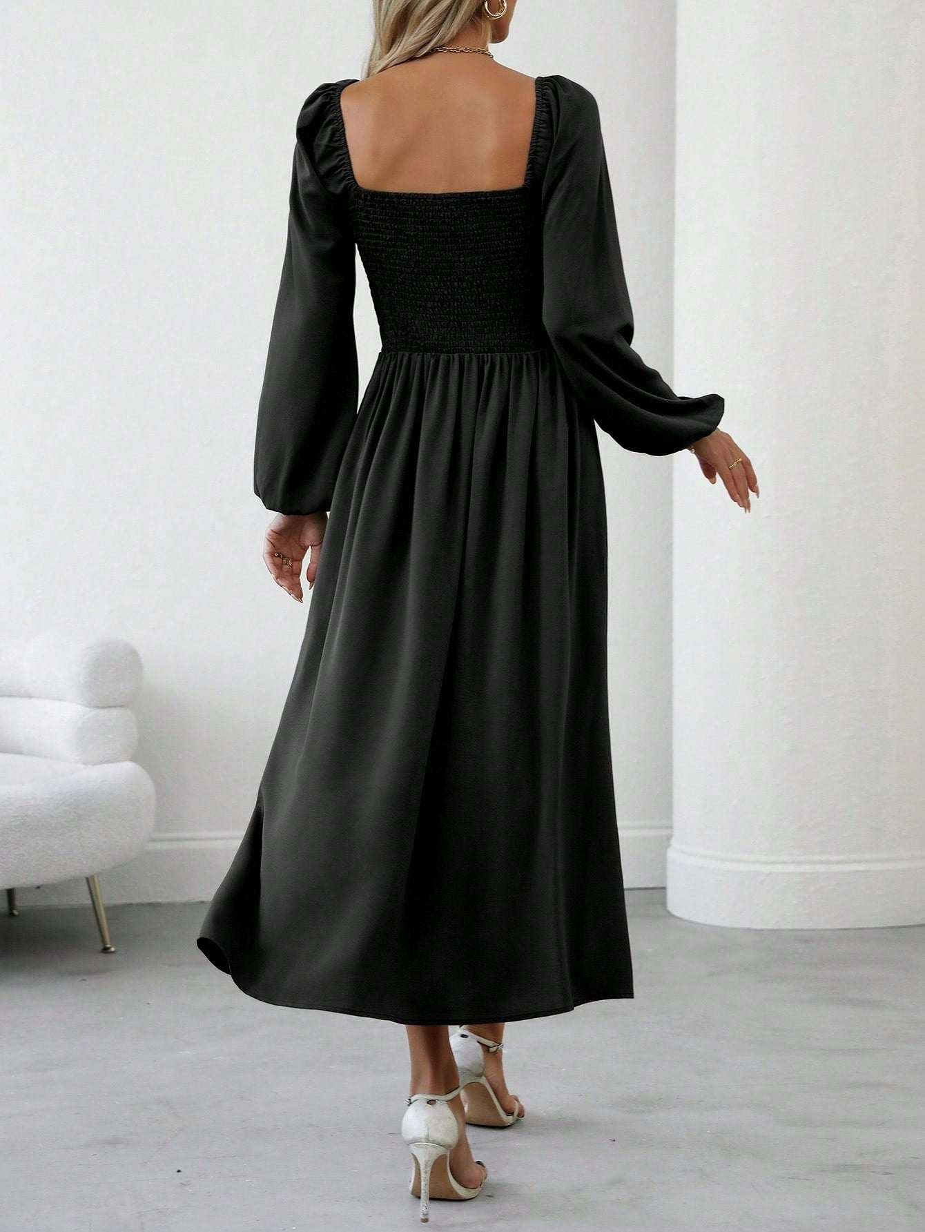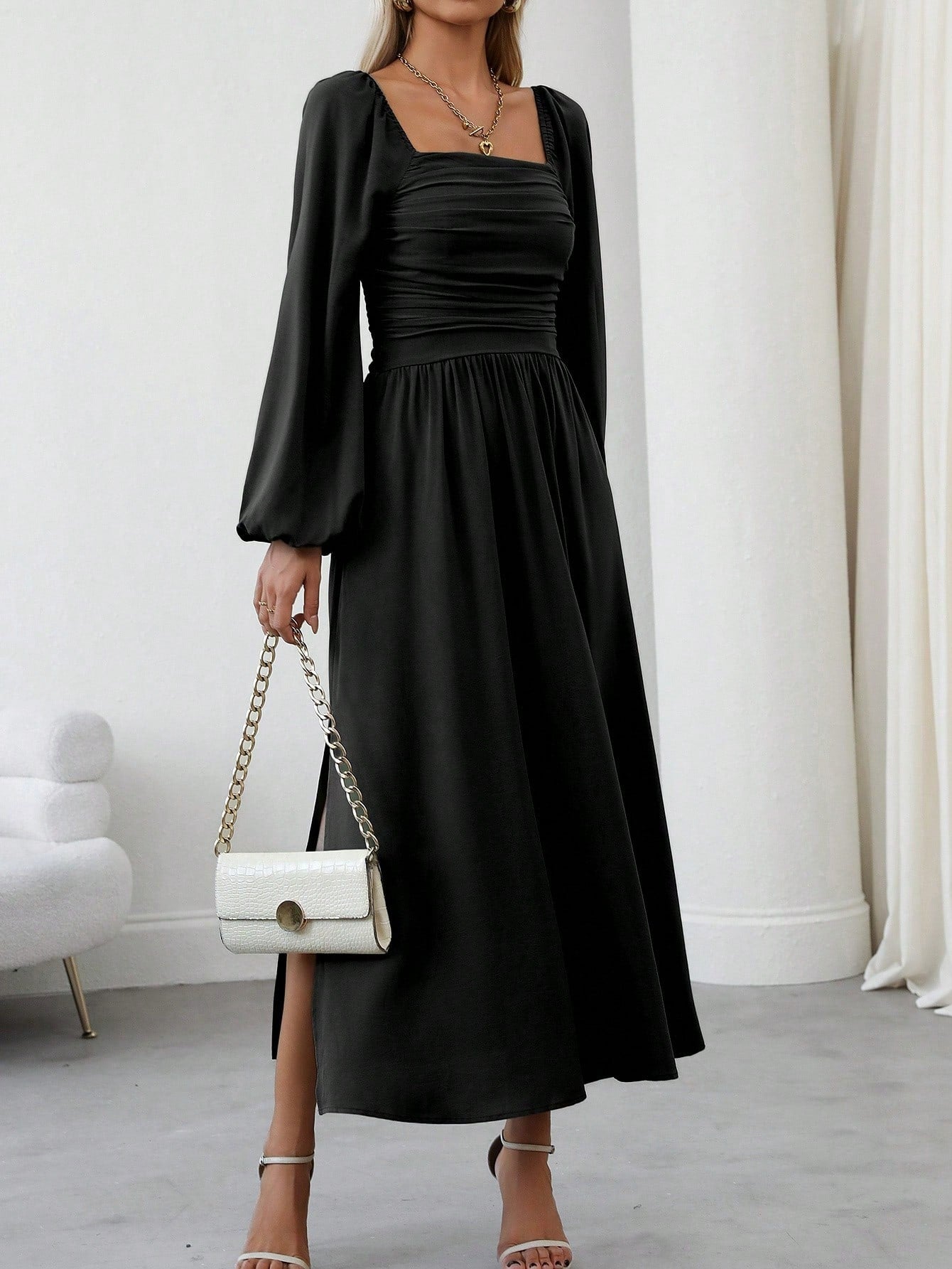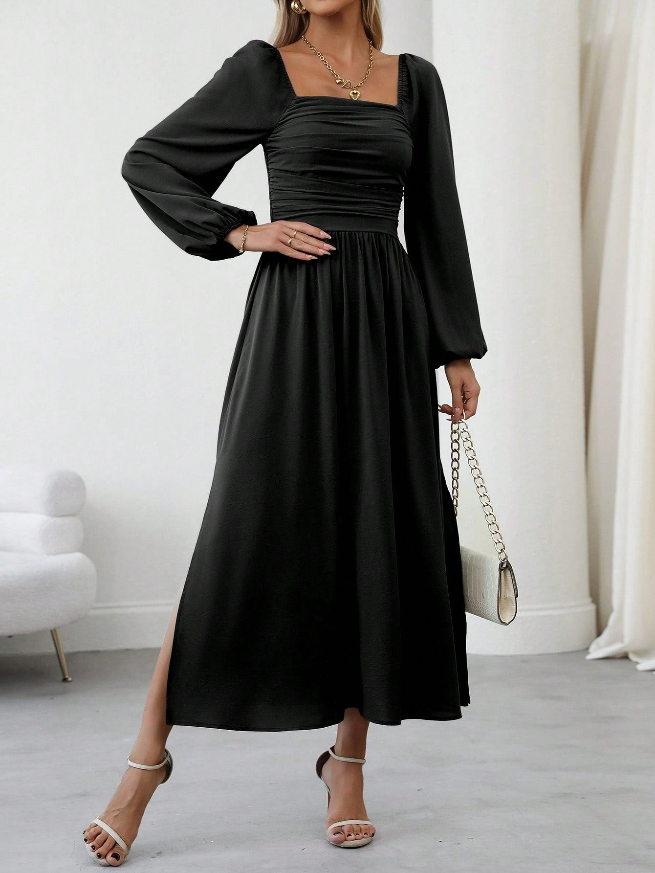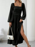 Clasi Women's Elegant Solid Color Lantern Sleeve Side Slit Dress, For Autumn Maxi Women Outfit