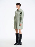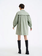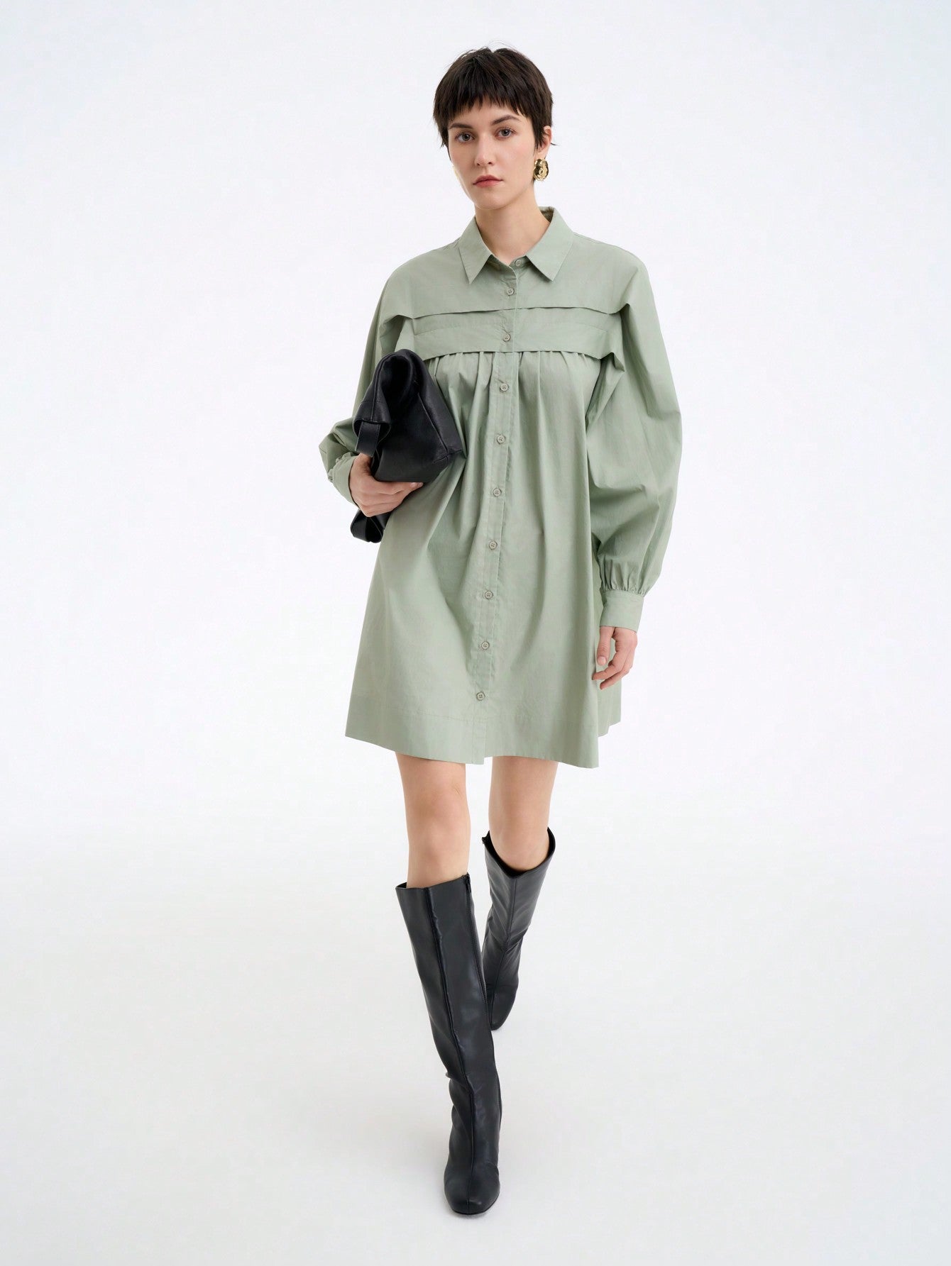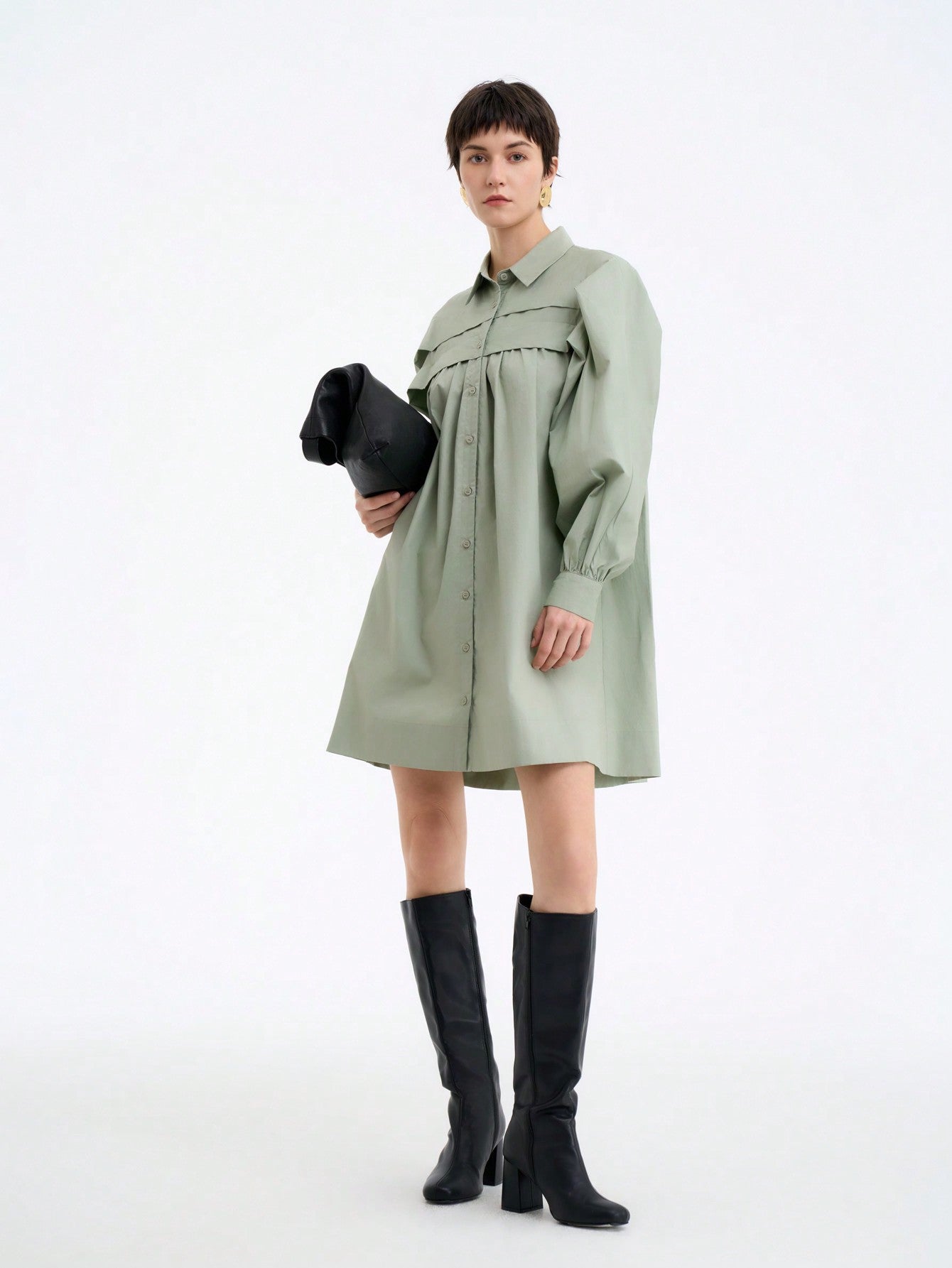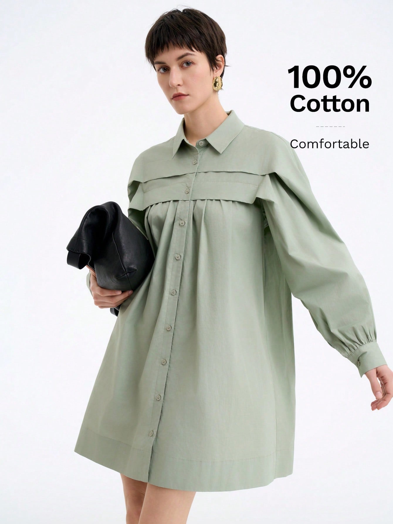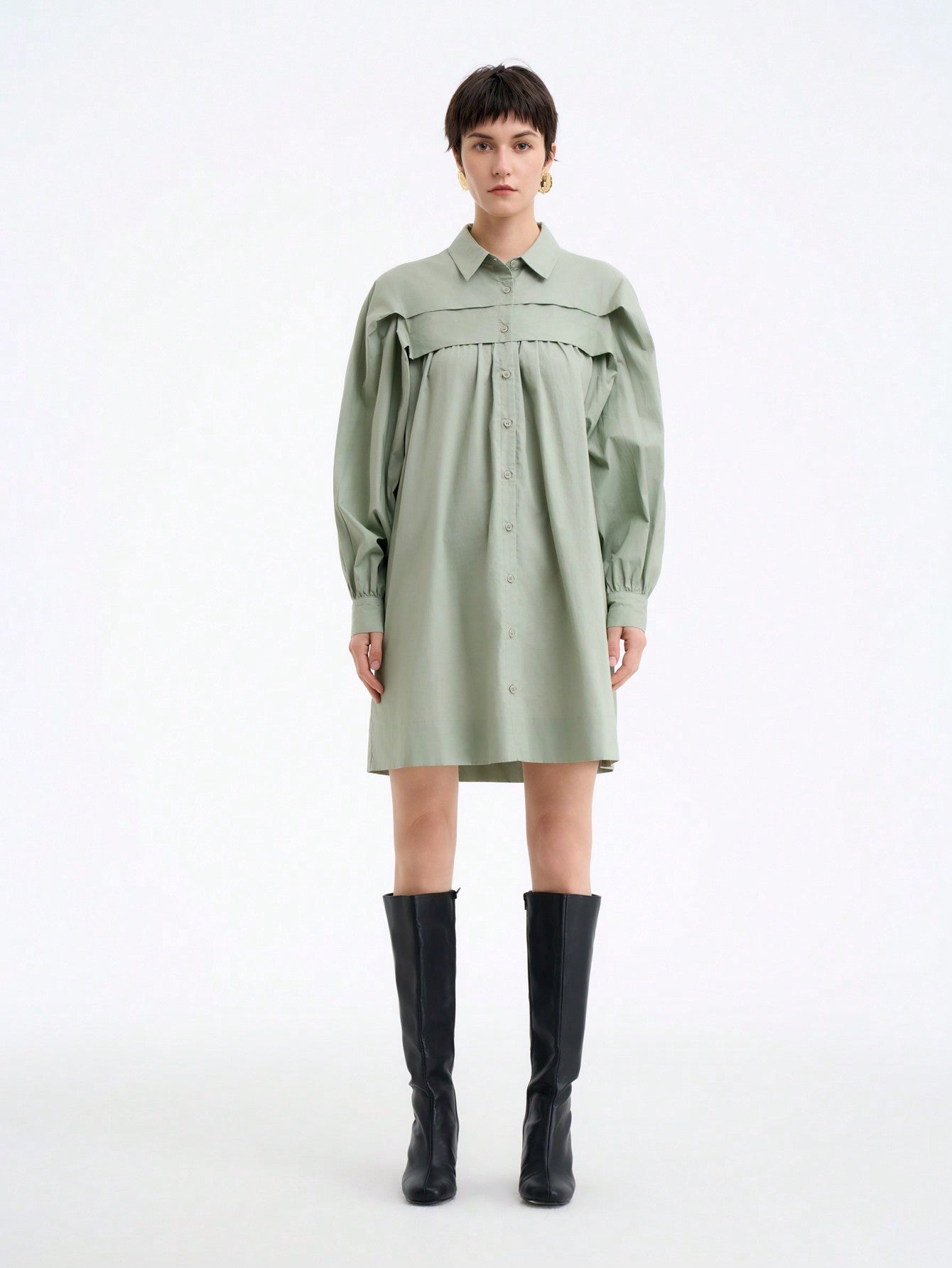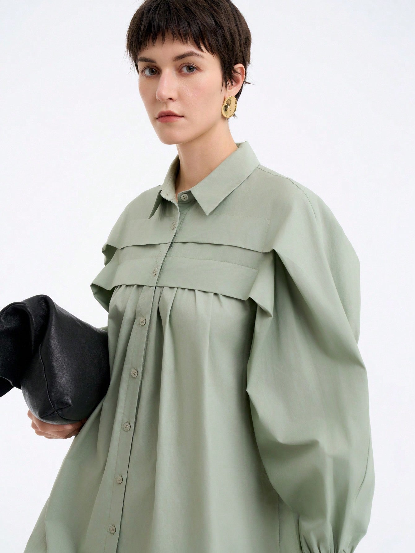 Clasi Women's Solid Color Puff Sleeve Cotton Classic Collar Button Front Pleated Short Sleeve Casual