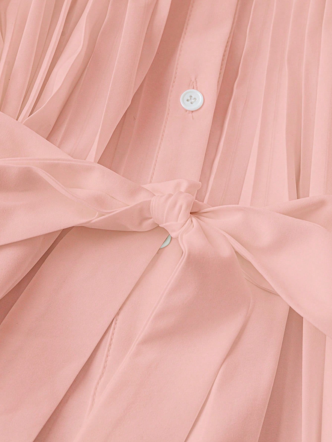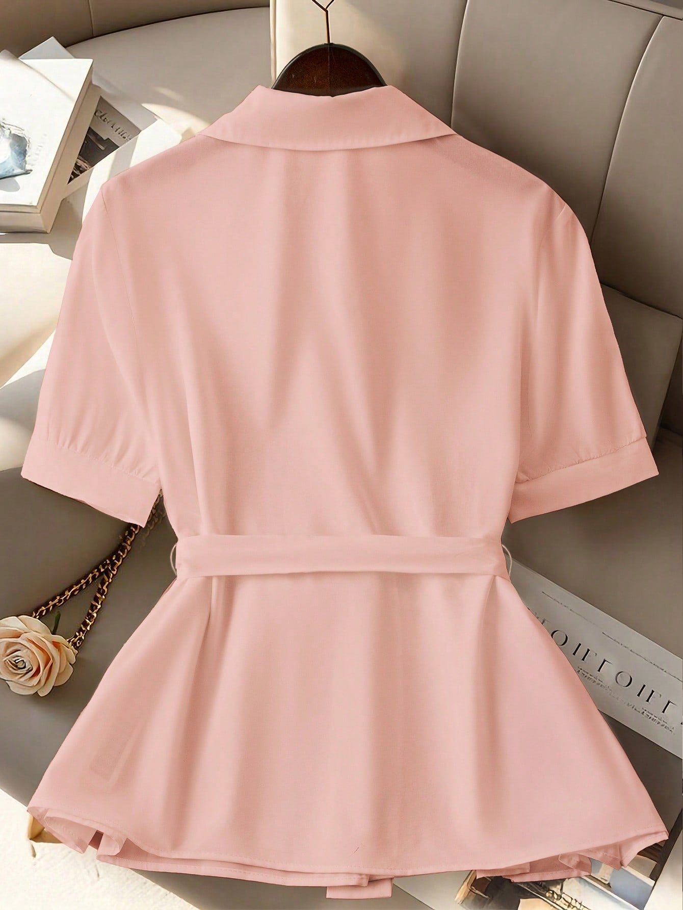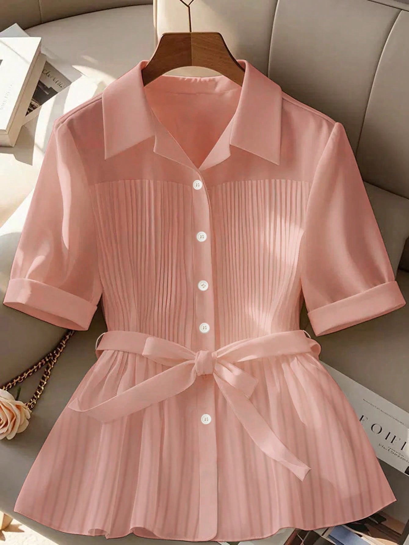 Clasi Women's Solid Color Short Sleeve Single-Breasted Pleated Casual Shirt