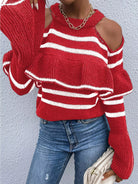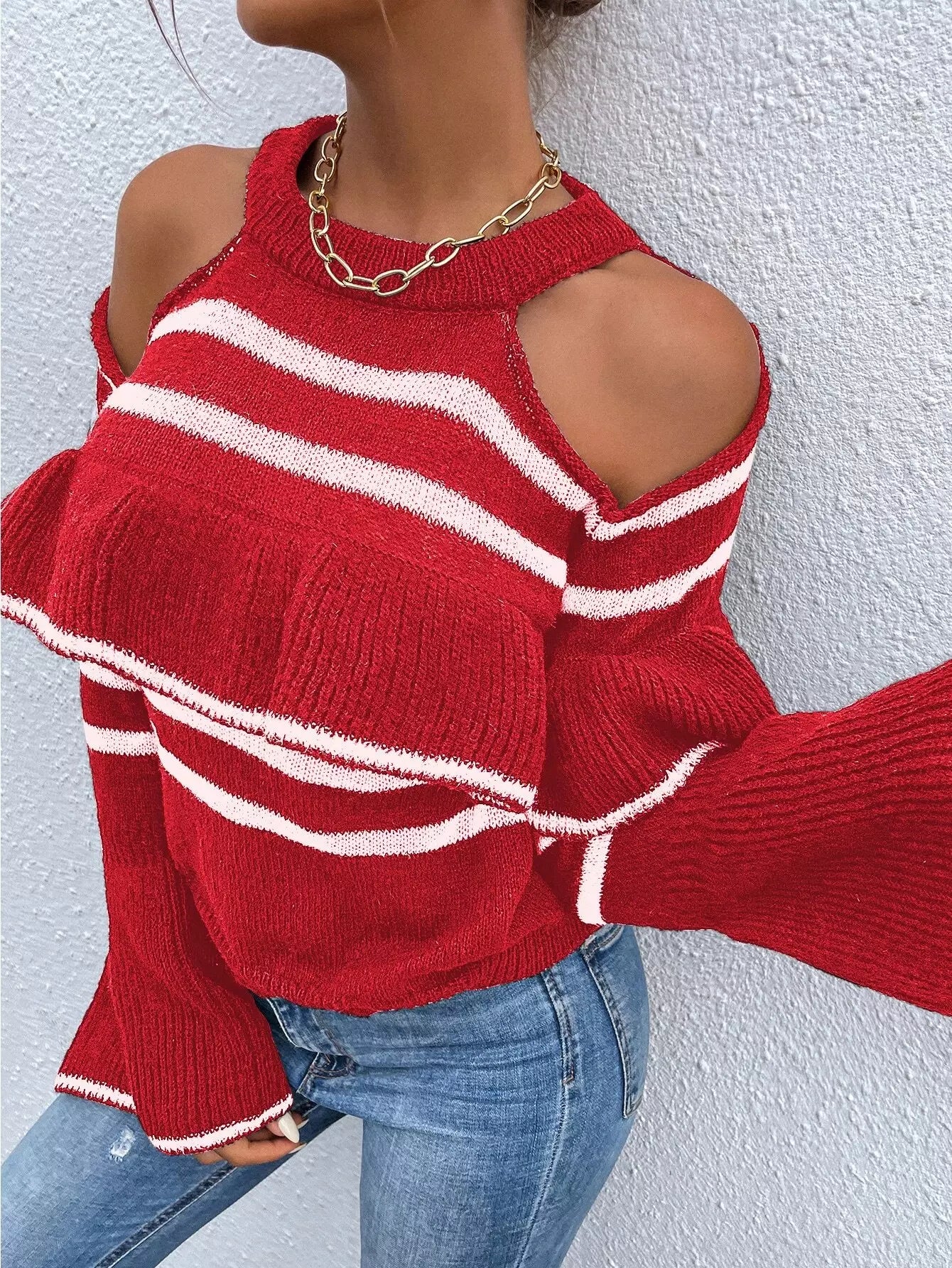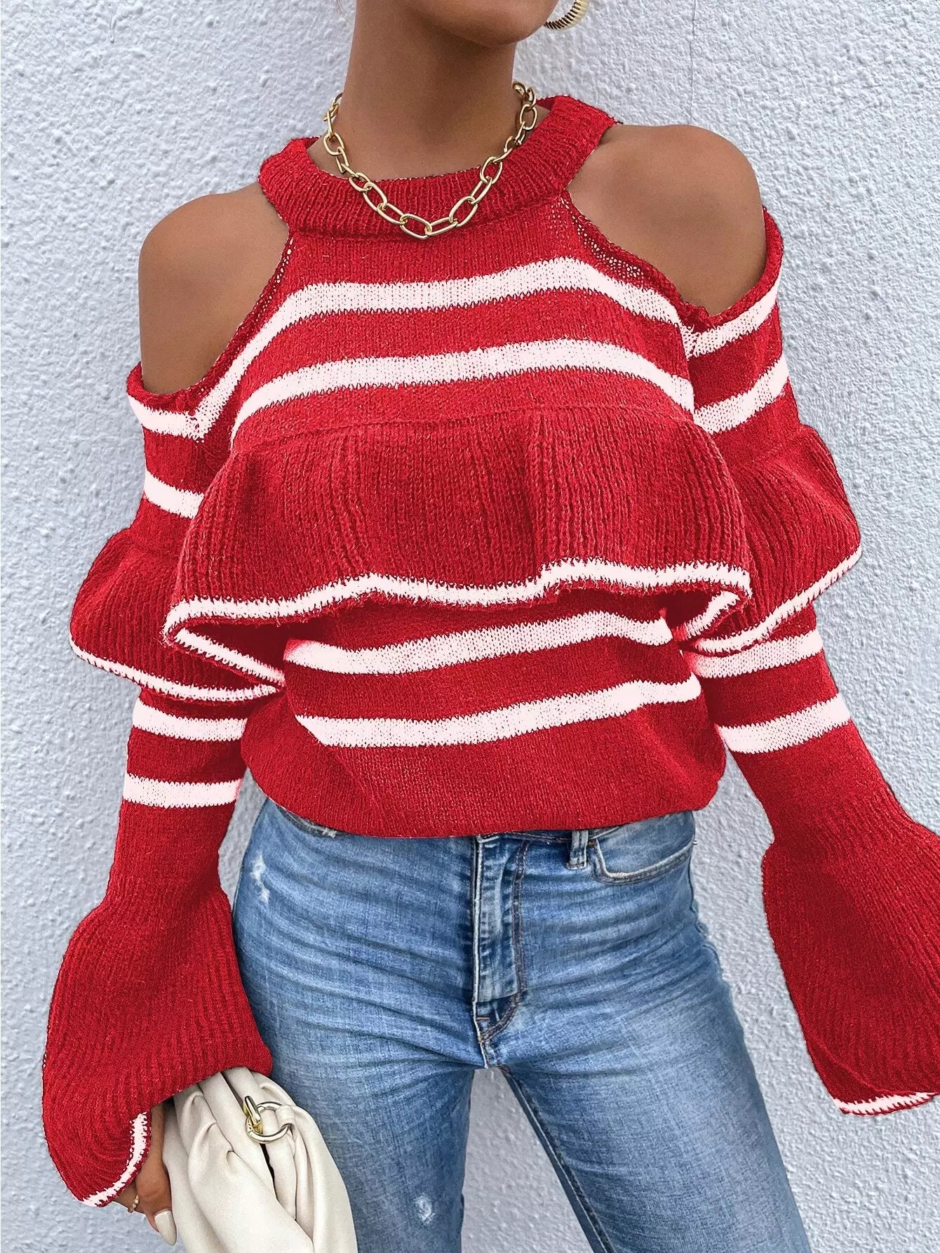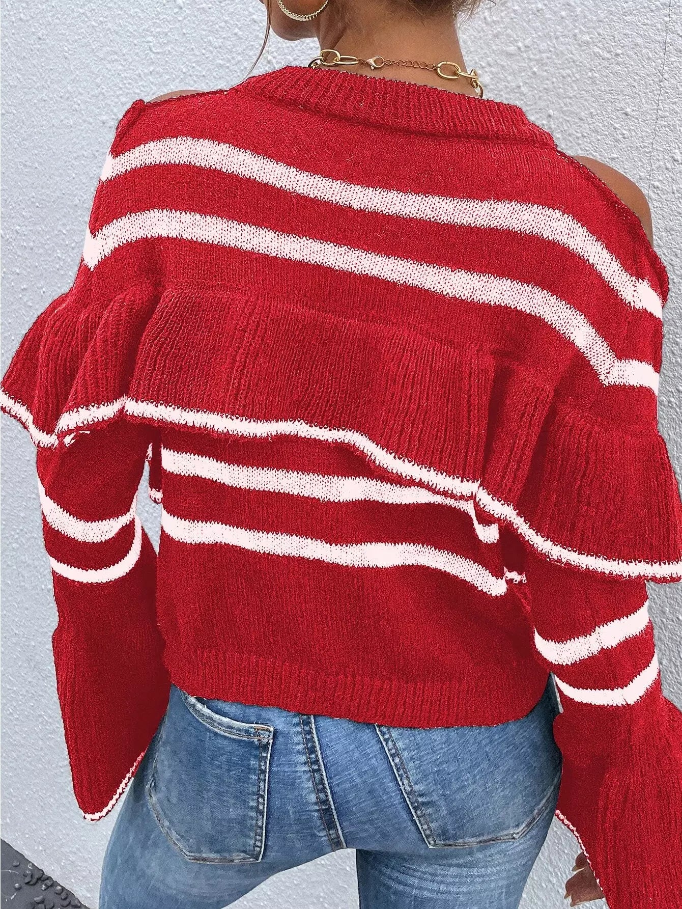 Cold Shoulder Ruffle Trim Striped Pattern Sweater