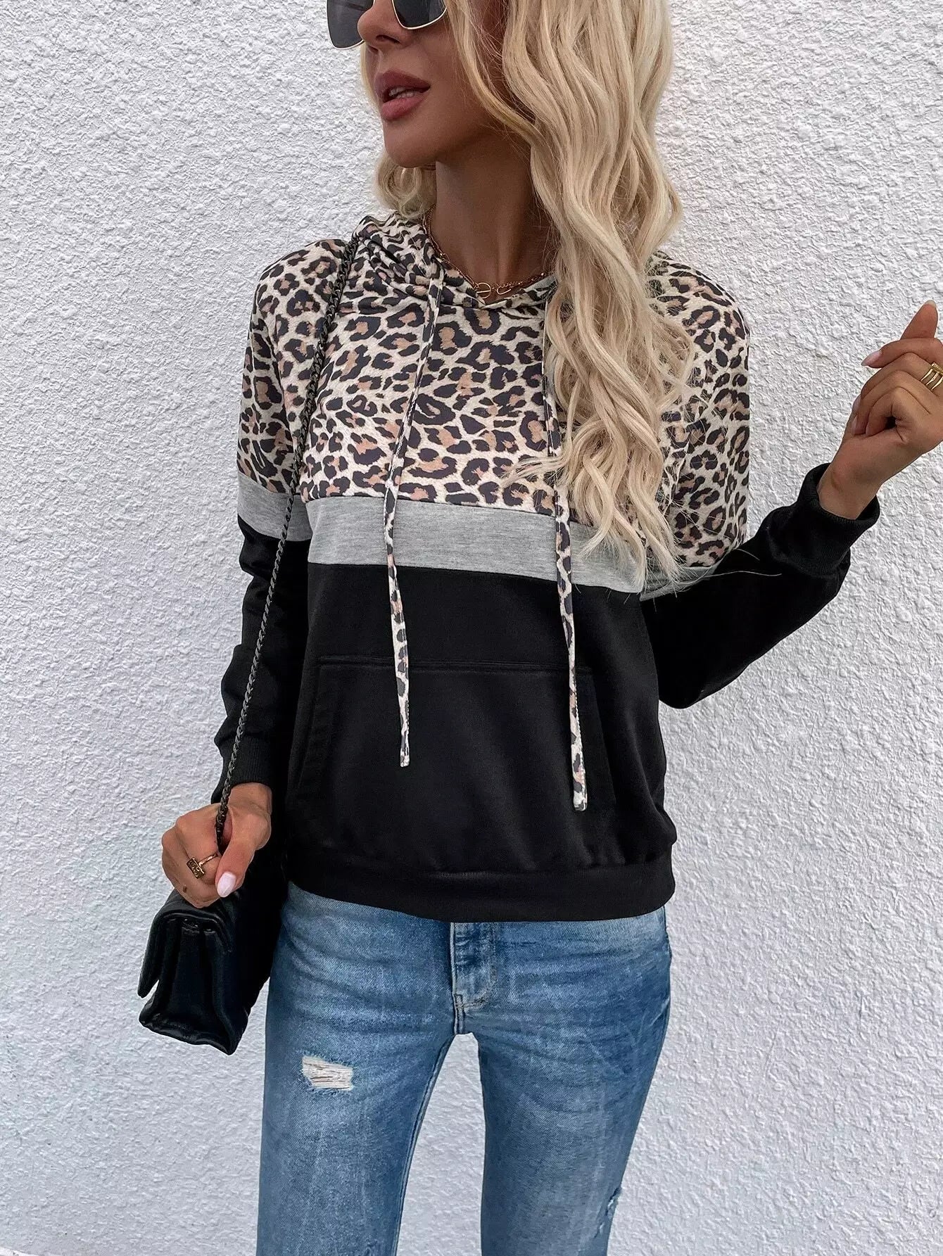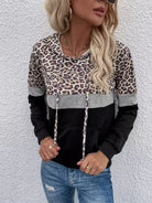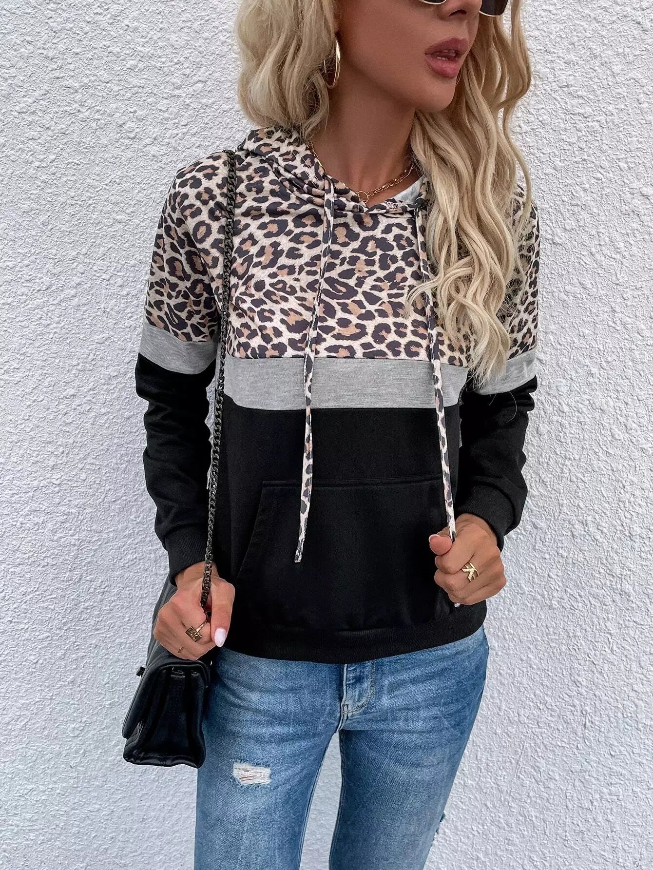 Colorblock Leopard Print Kangaroo Pocket Drawstring Hoodie