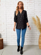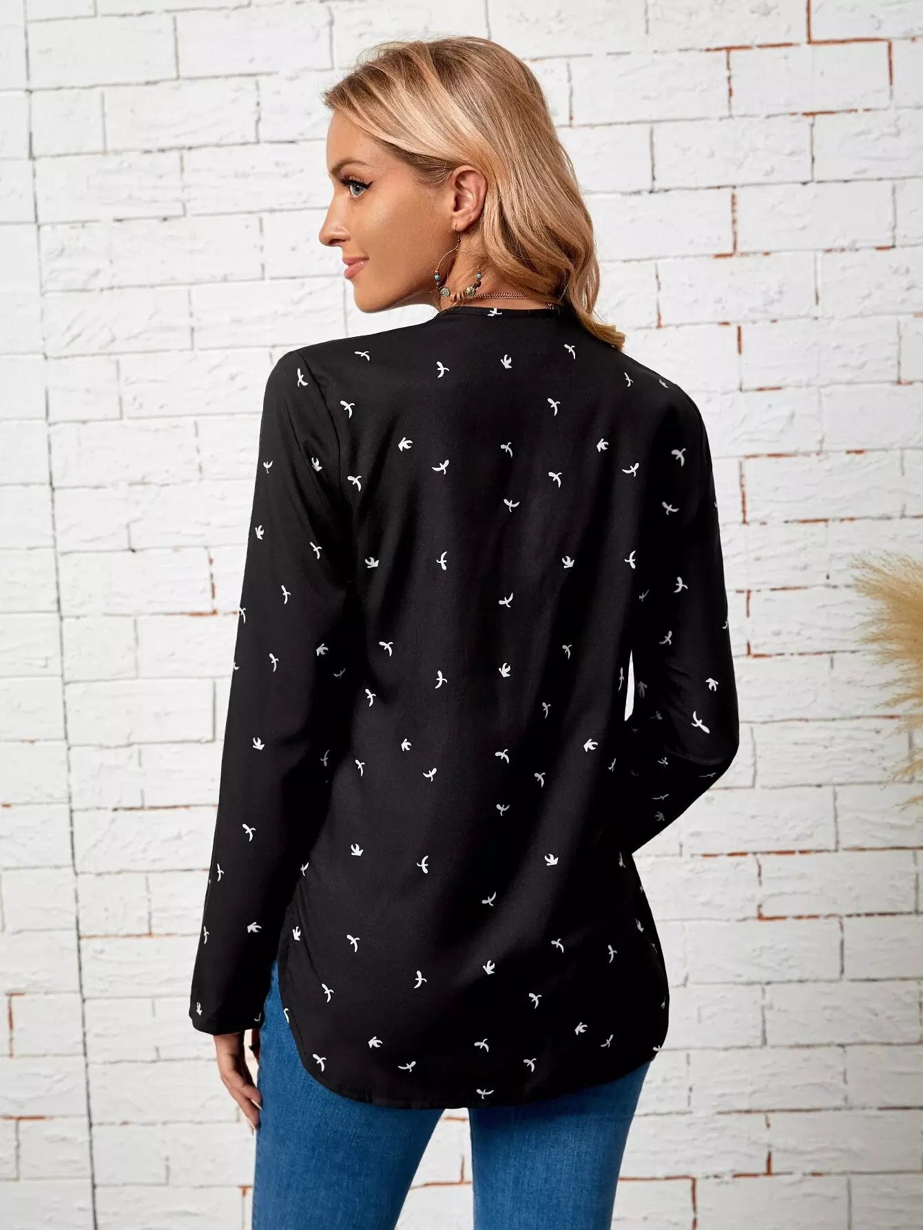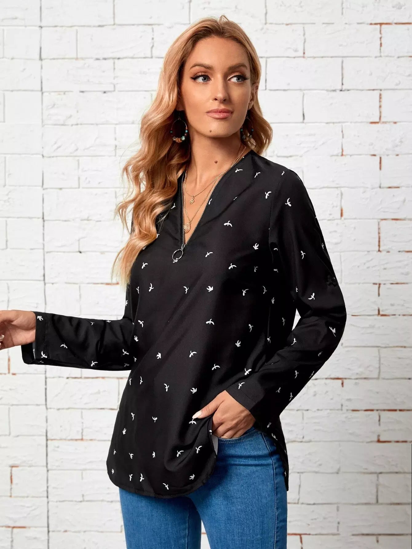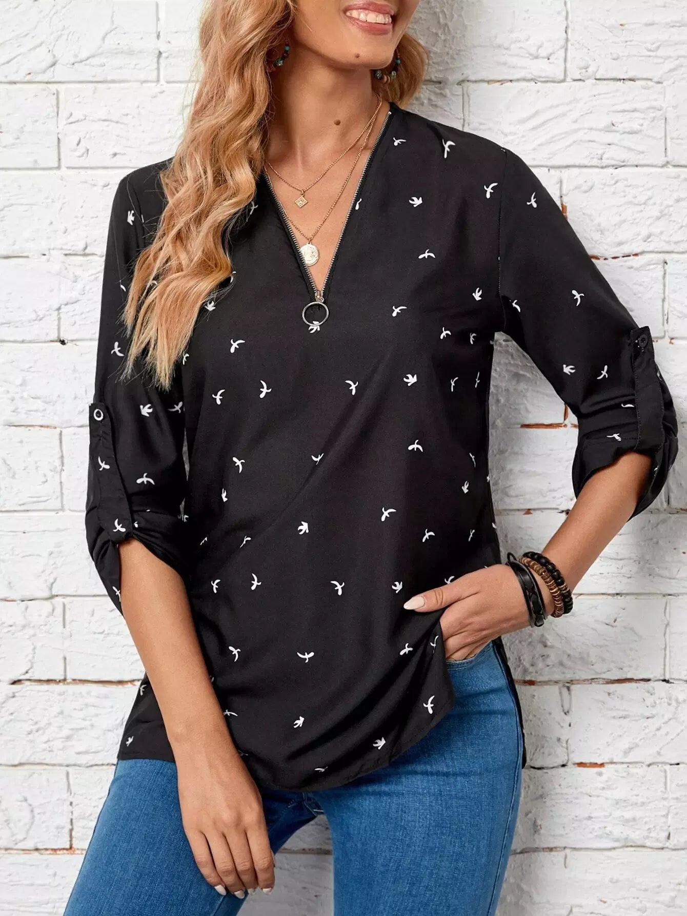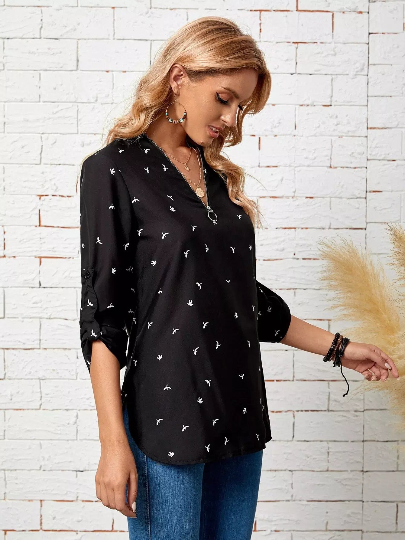 Confetti Bird Print Roll Tab Sleeve Quarter O-ring Zipper Blouse