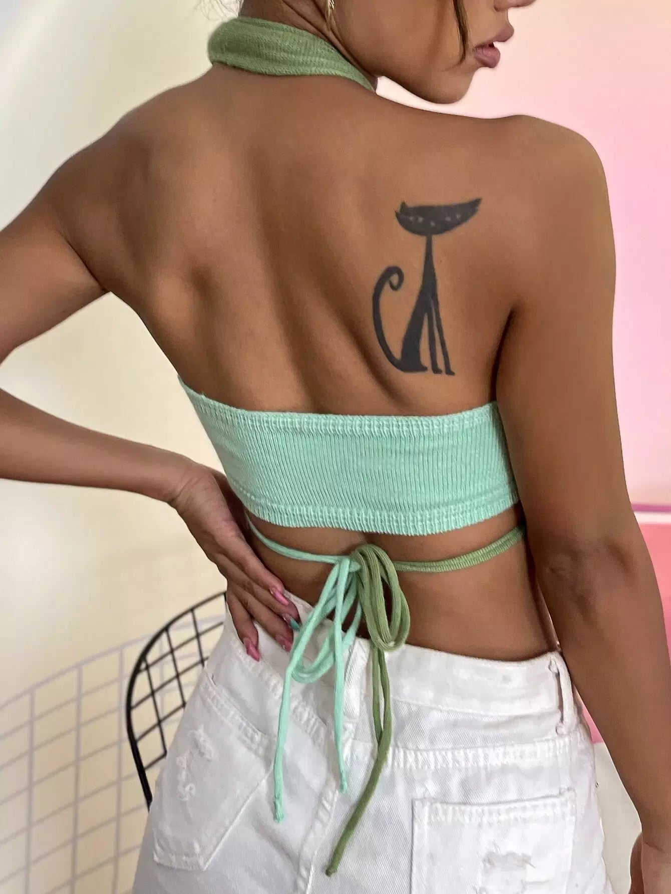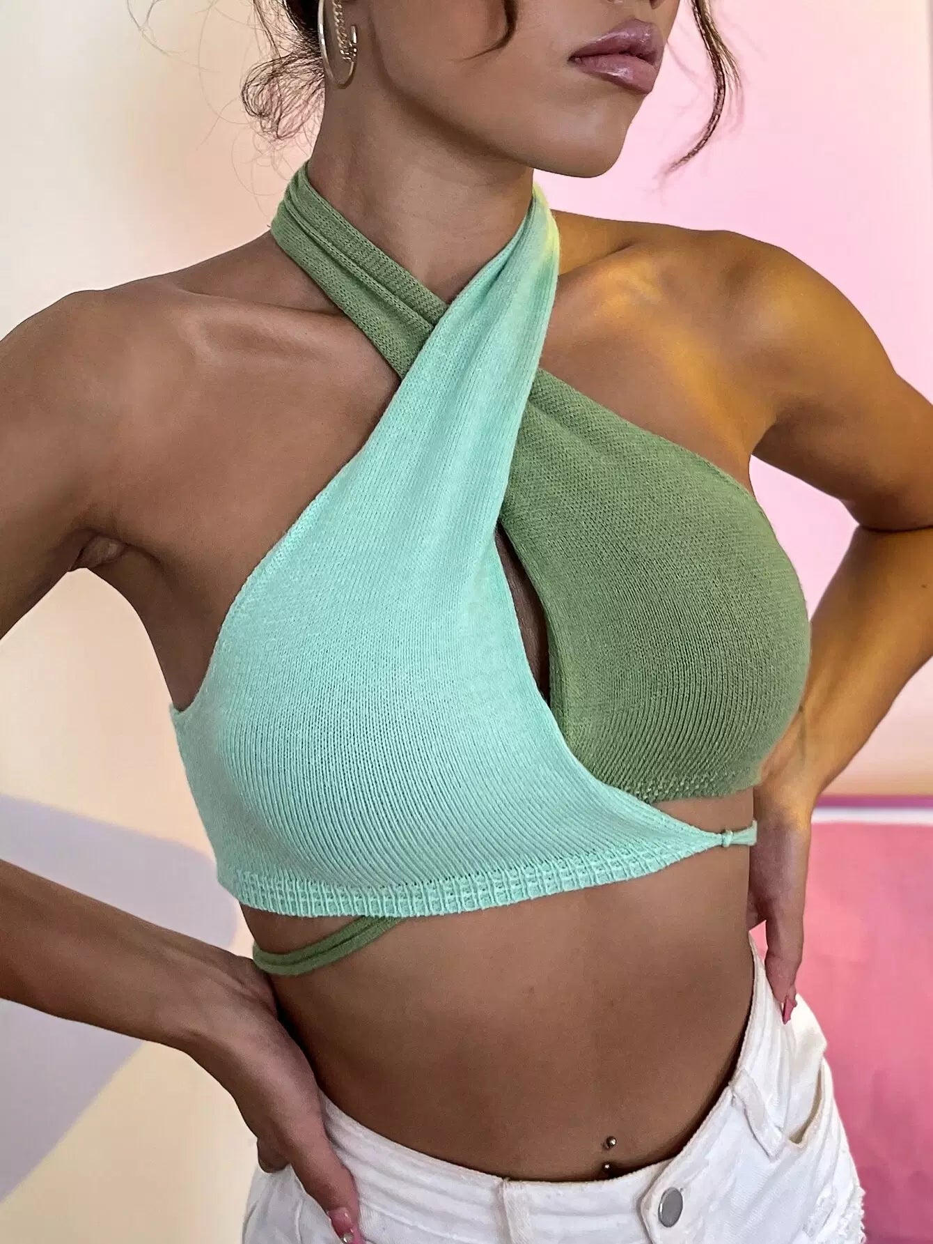 Crisscross Tie Backless Colorblock Knit Halter Top