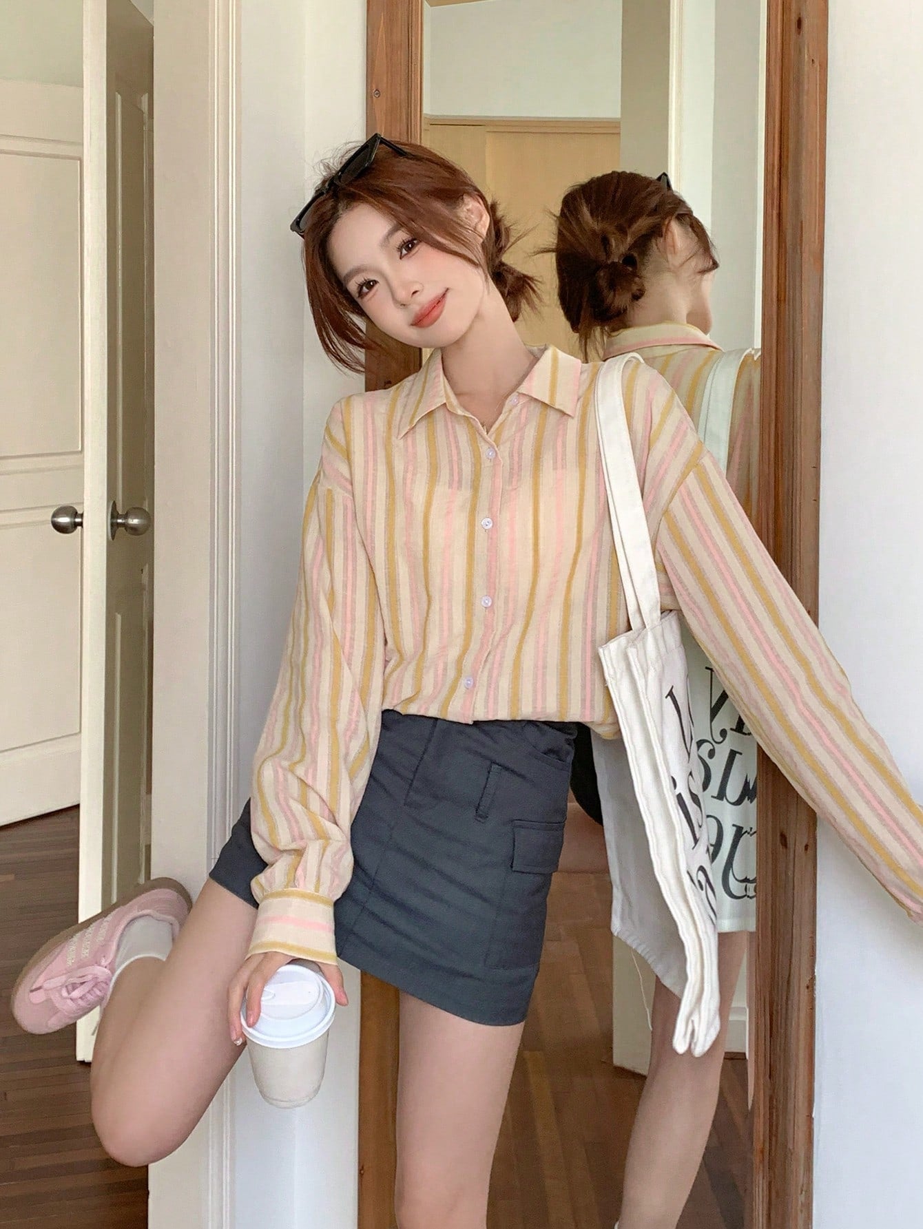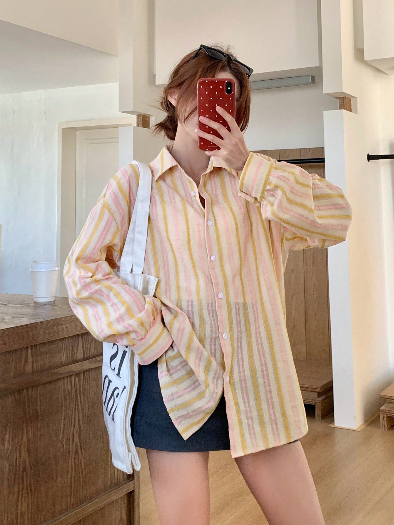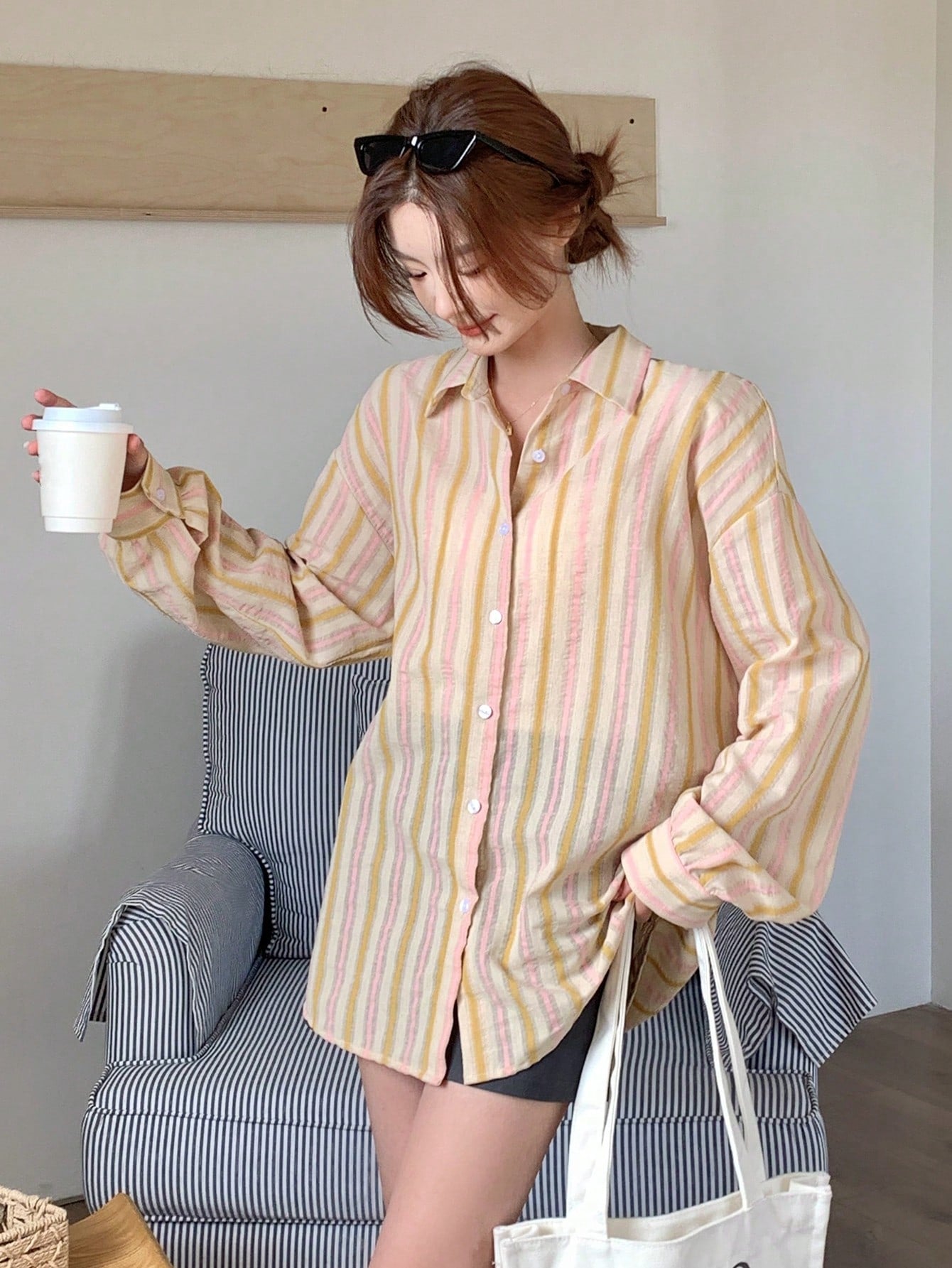 women DAZY Contrast-Color Striped Loose Fit Long Sleeve Lapel Collar Women's Shirt