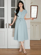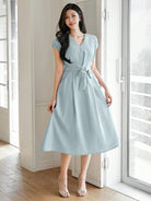 women DAZY Solid Color V-Neck Belted Mid-Length Dress For Office Wear Sundress