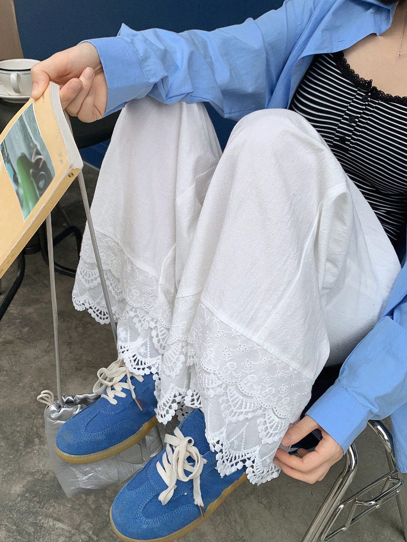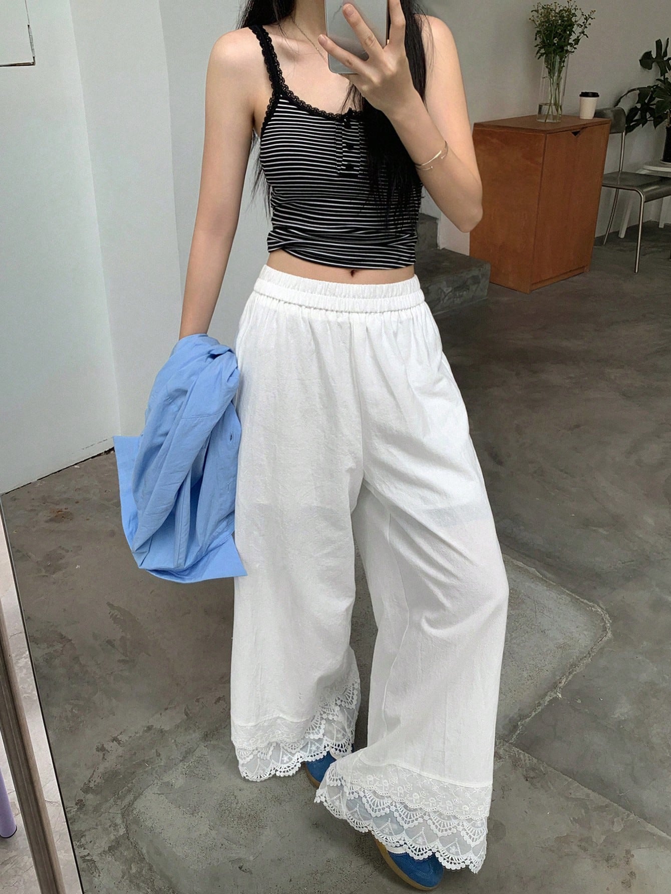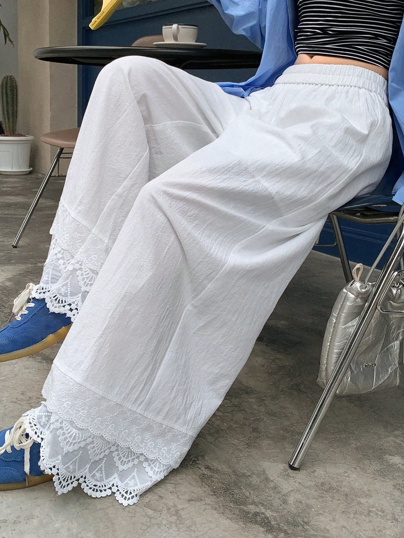 DAZY Women Solid Color Patchwork Lace Trim Loose Straight Leg Ankle Length Pants