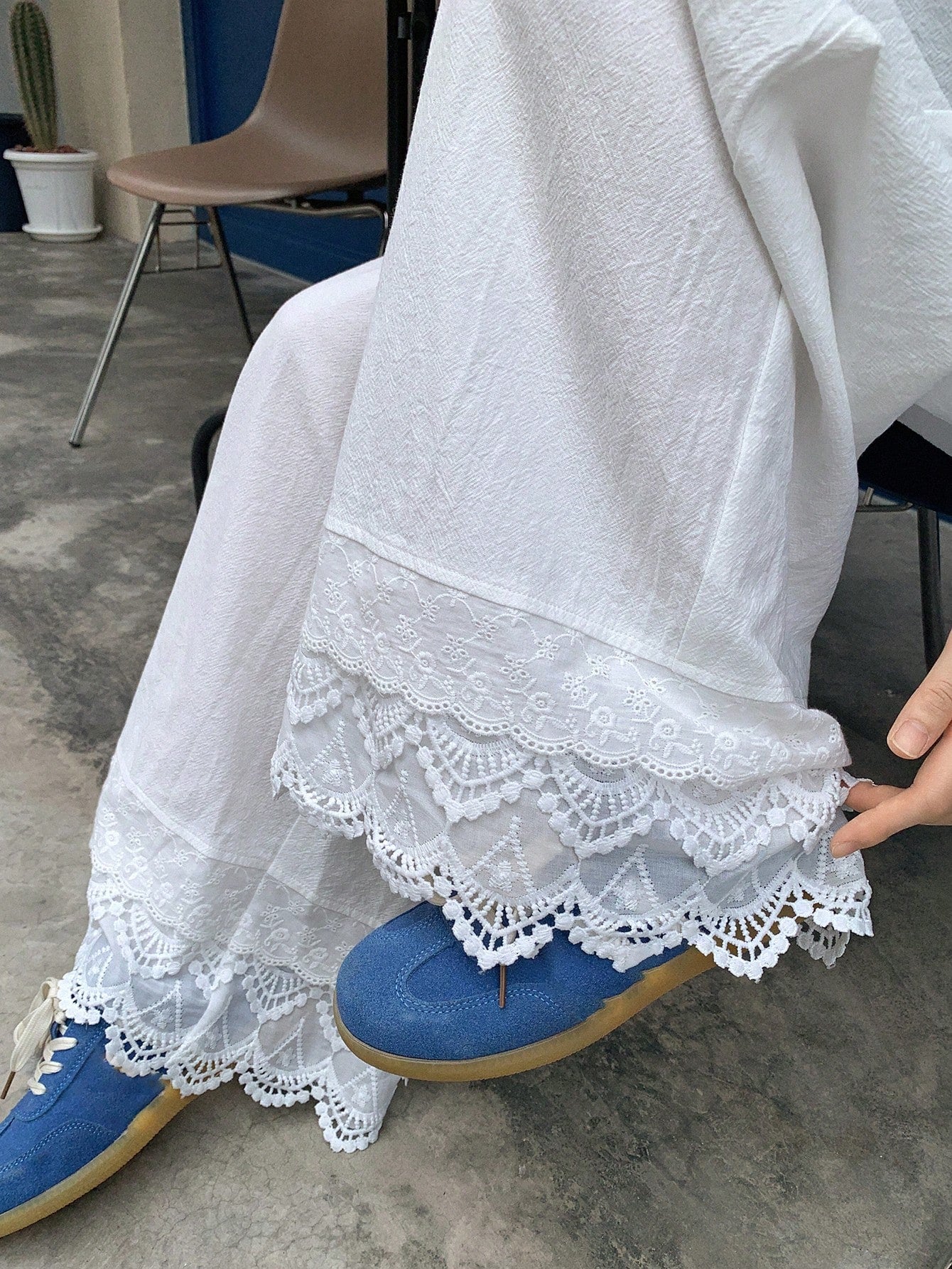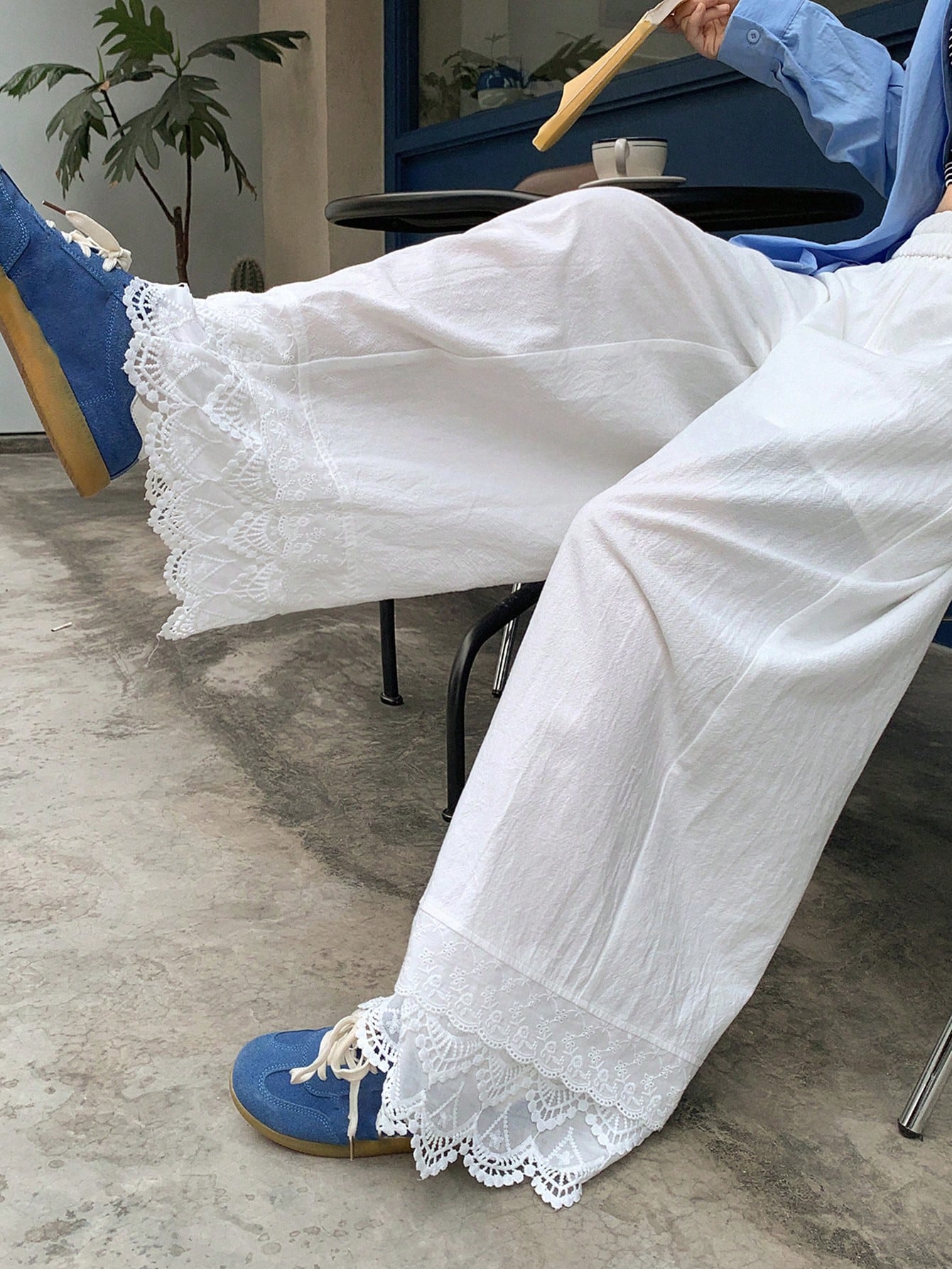 women DAZY Women Solid Color Patchwork Lace Trim Loose Straight Leg Ankle Length Pants