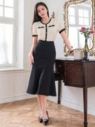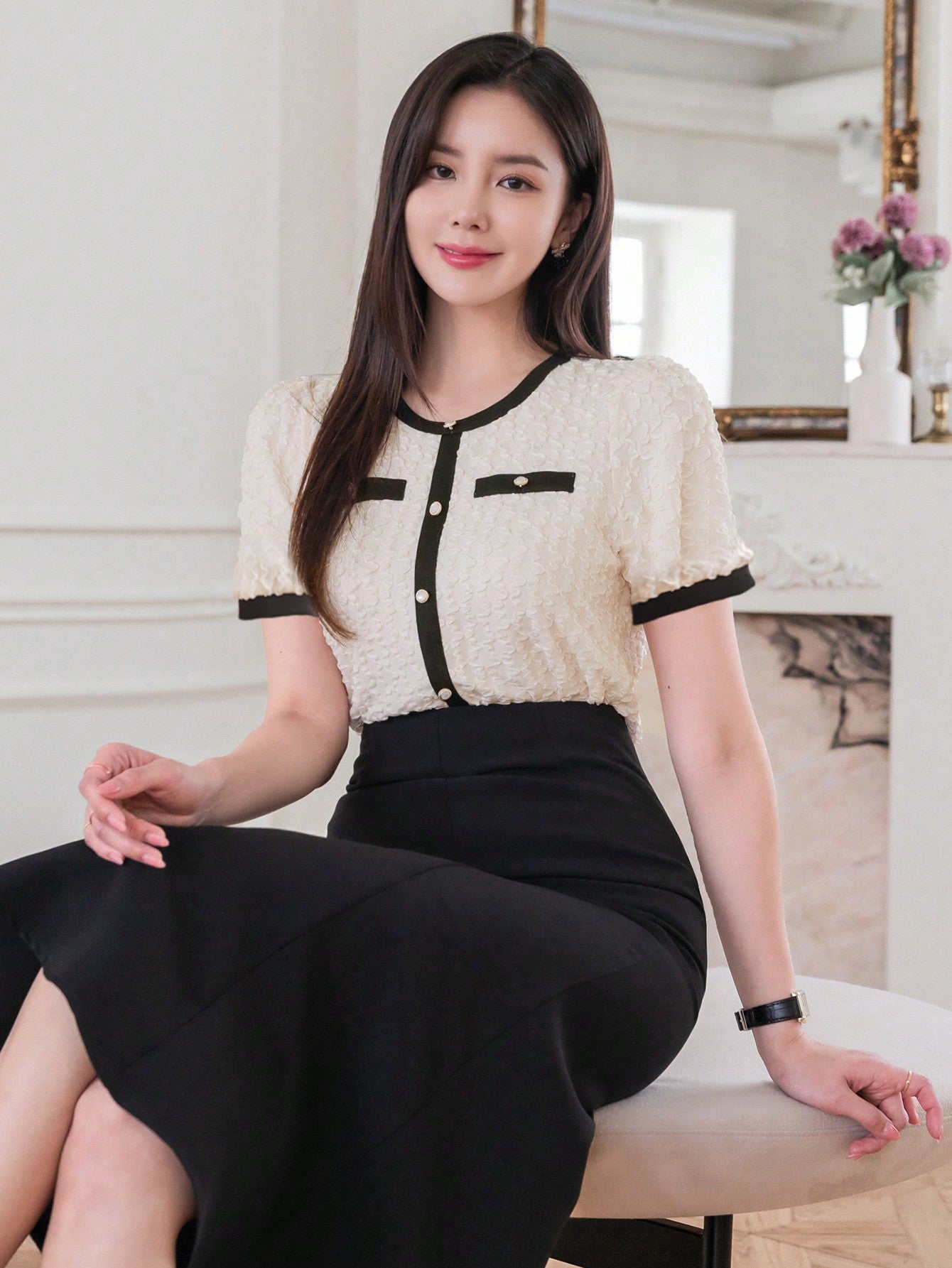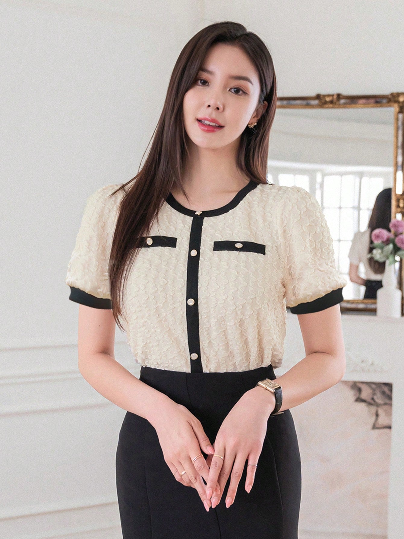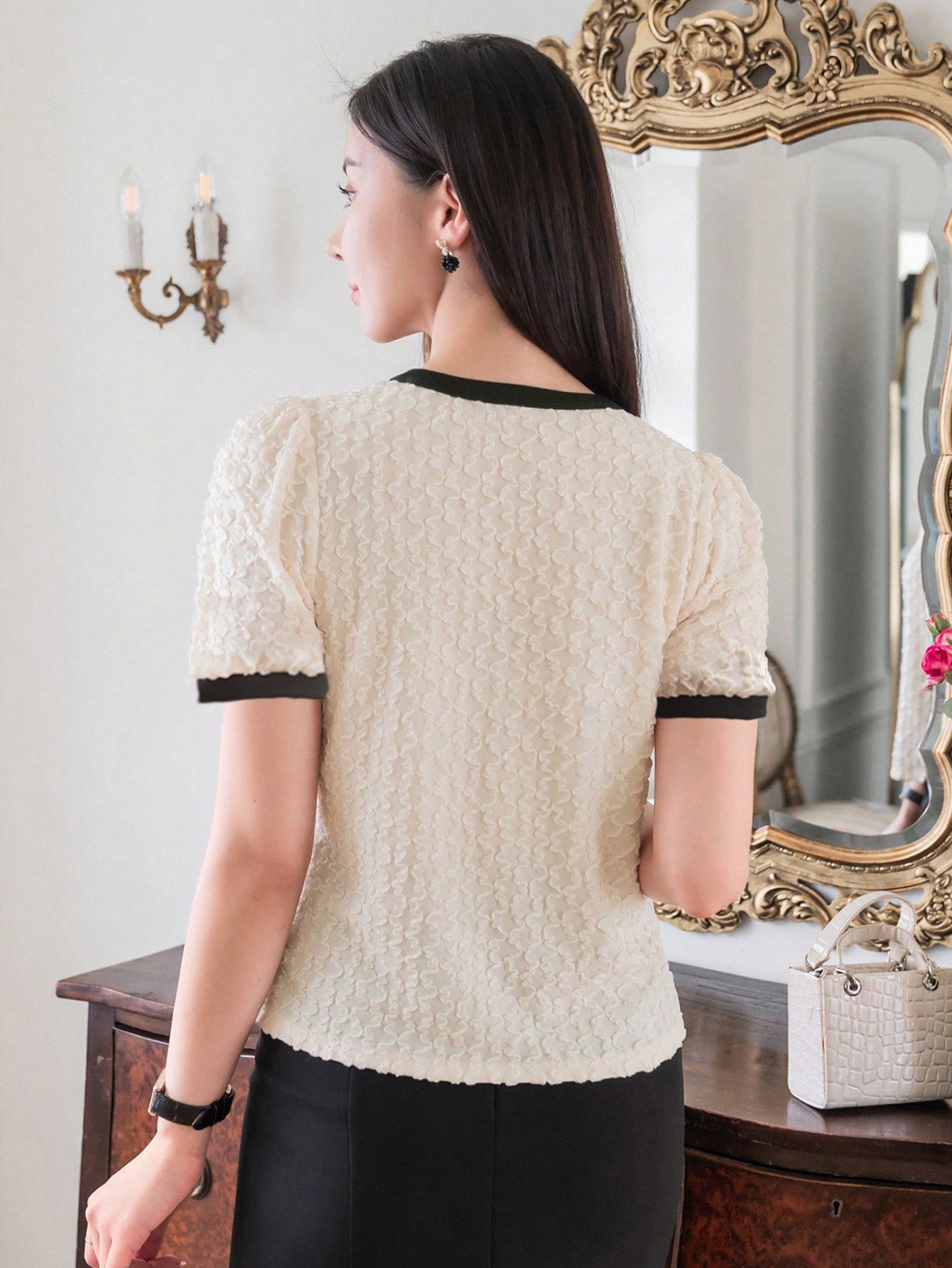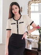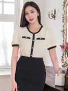 DAZY Women Summer Round Neck Color Block Short Puff Sleeve Elegant T-Shirt