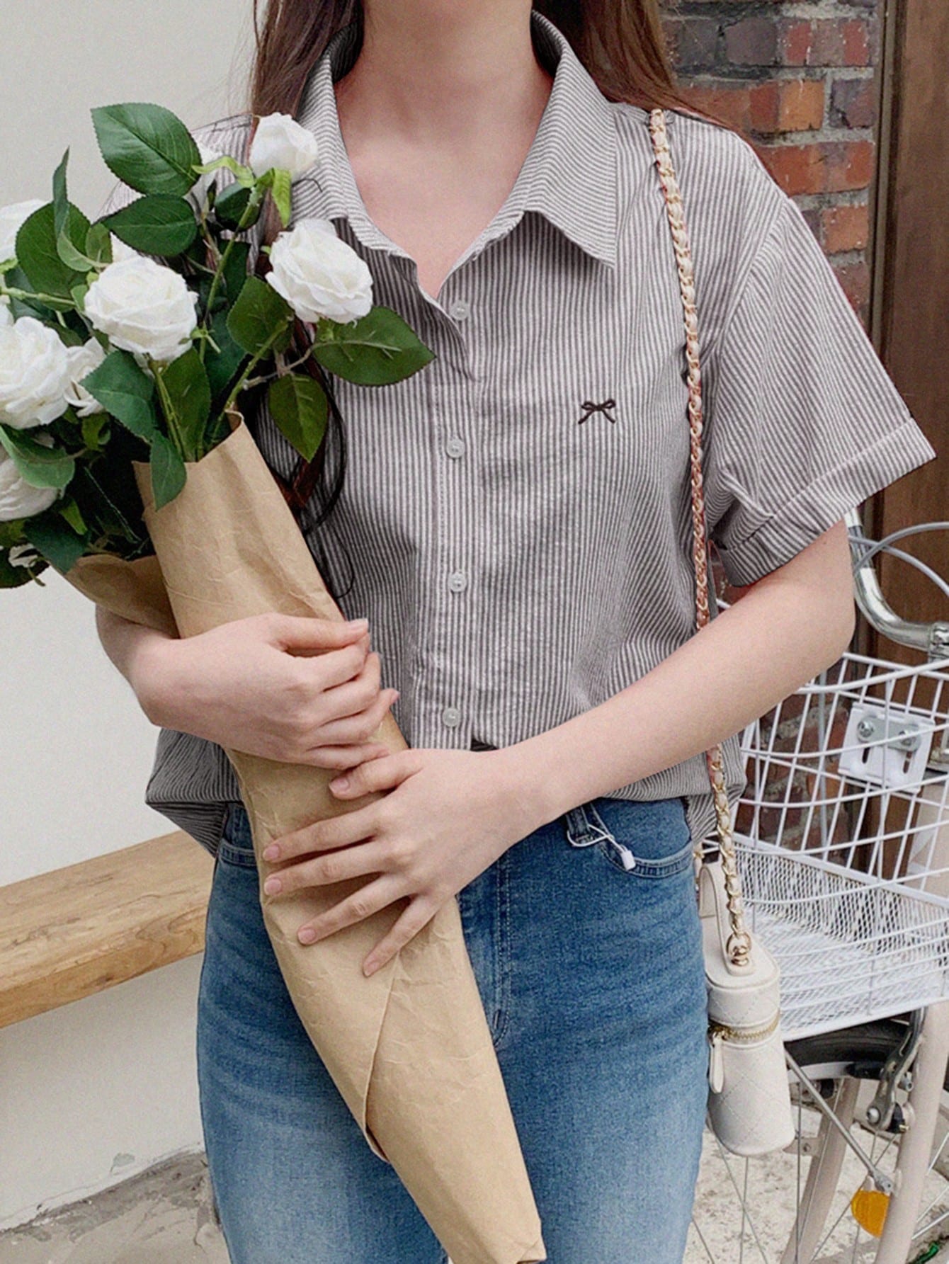 DAZY Women's Bow Embroidered Turndown Collar Loose Short Sleeve Blouse, Spring/Summer