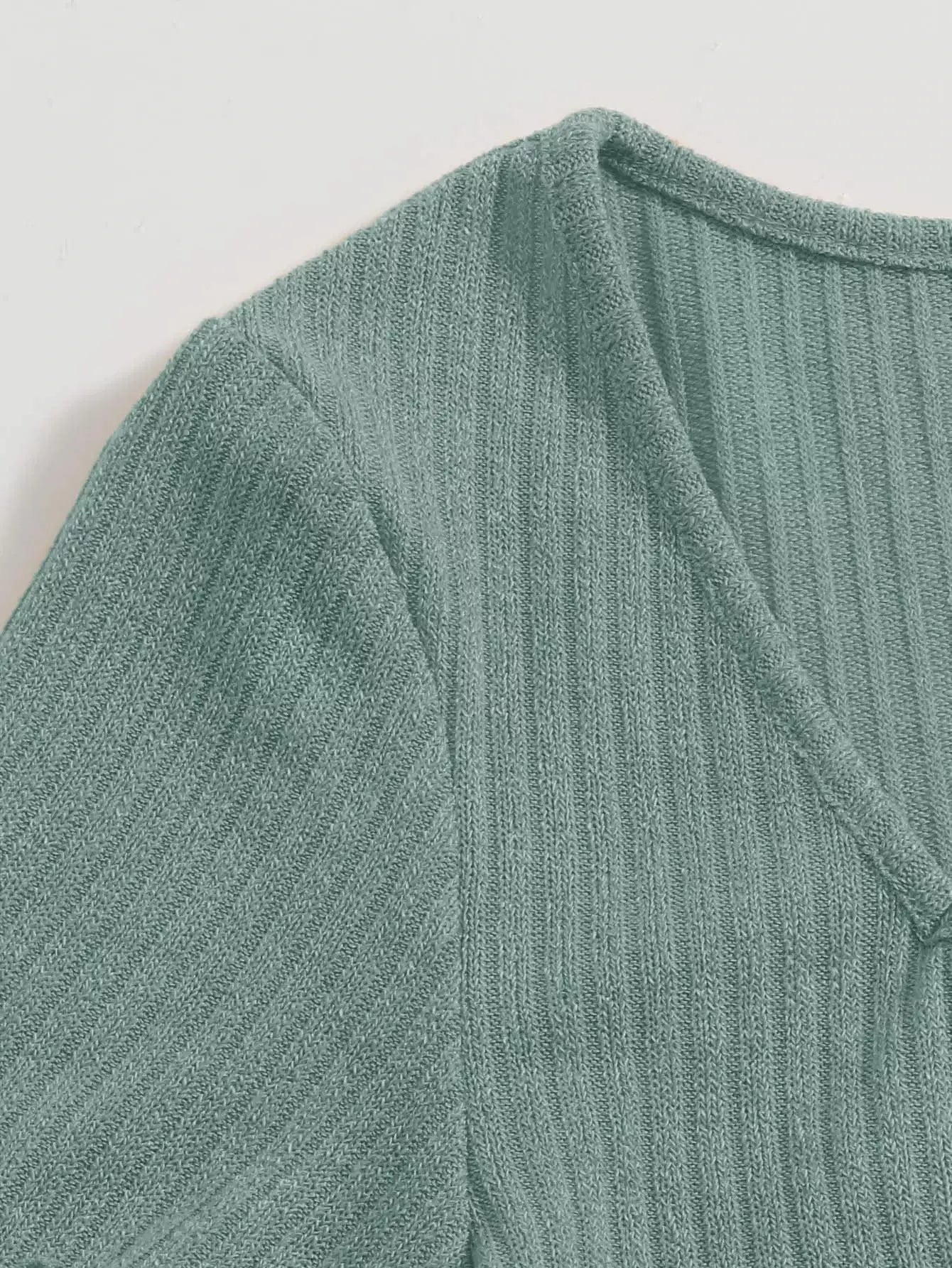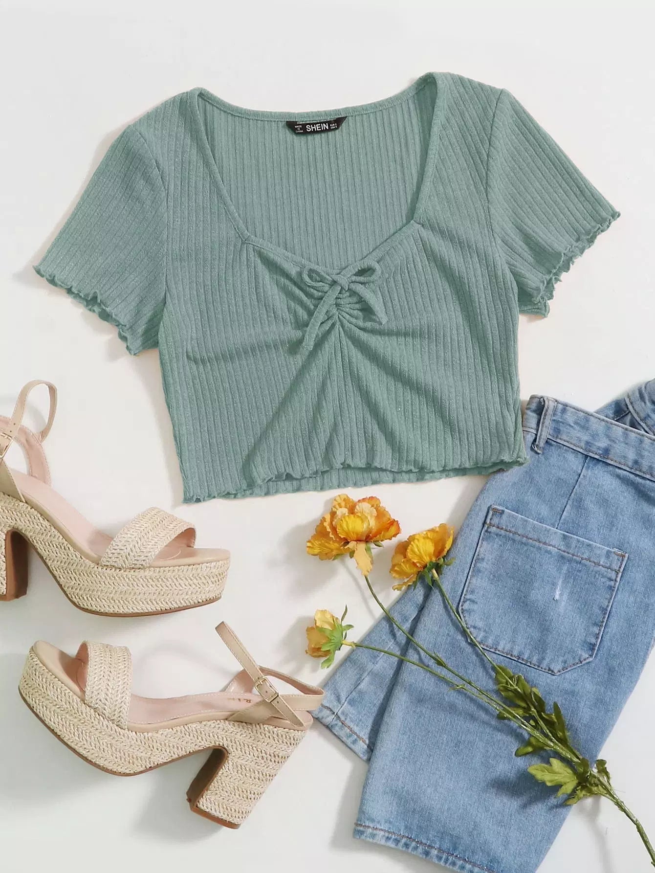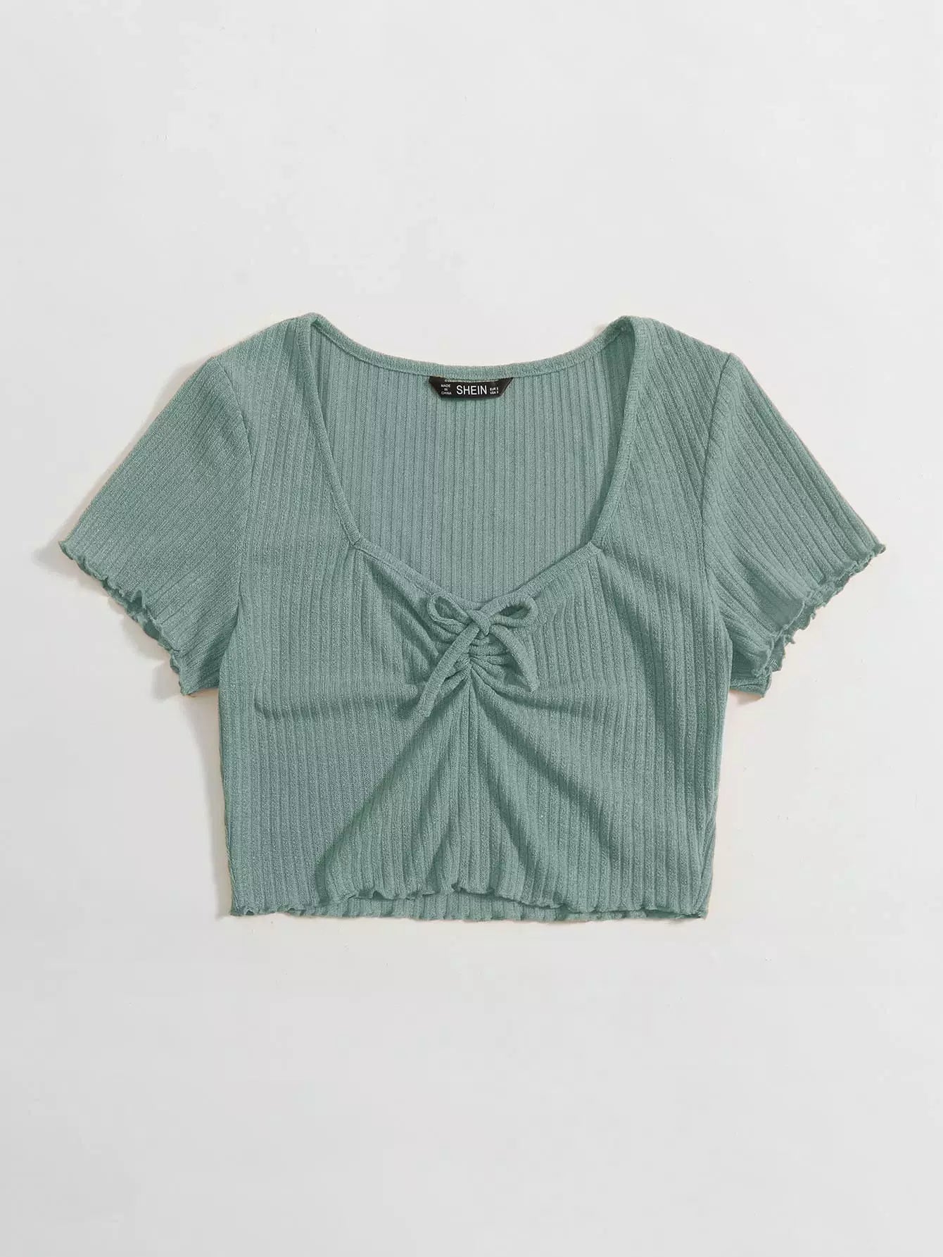 Drawstring Front Lettuce Edge Rib-knit Tee