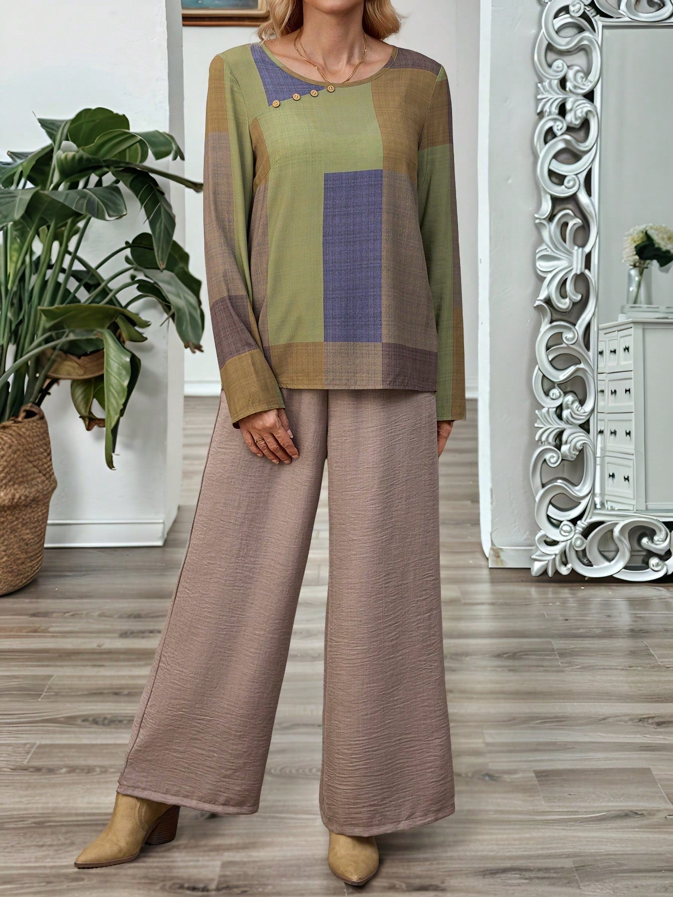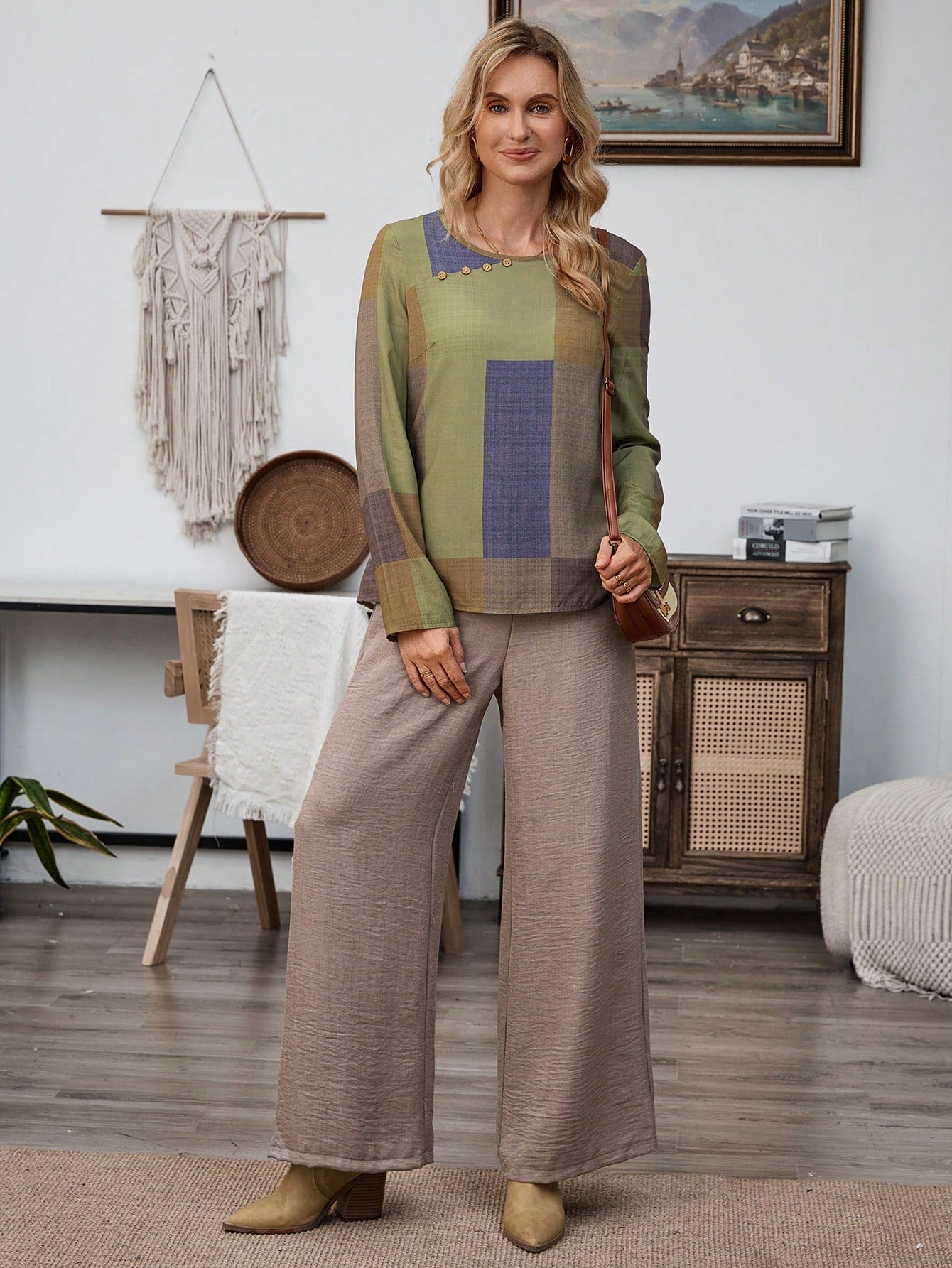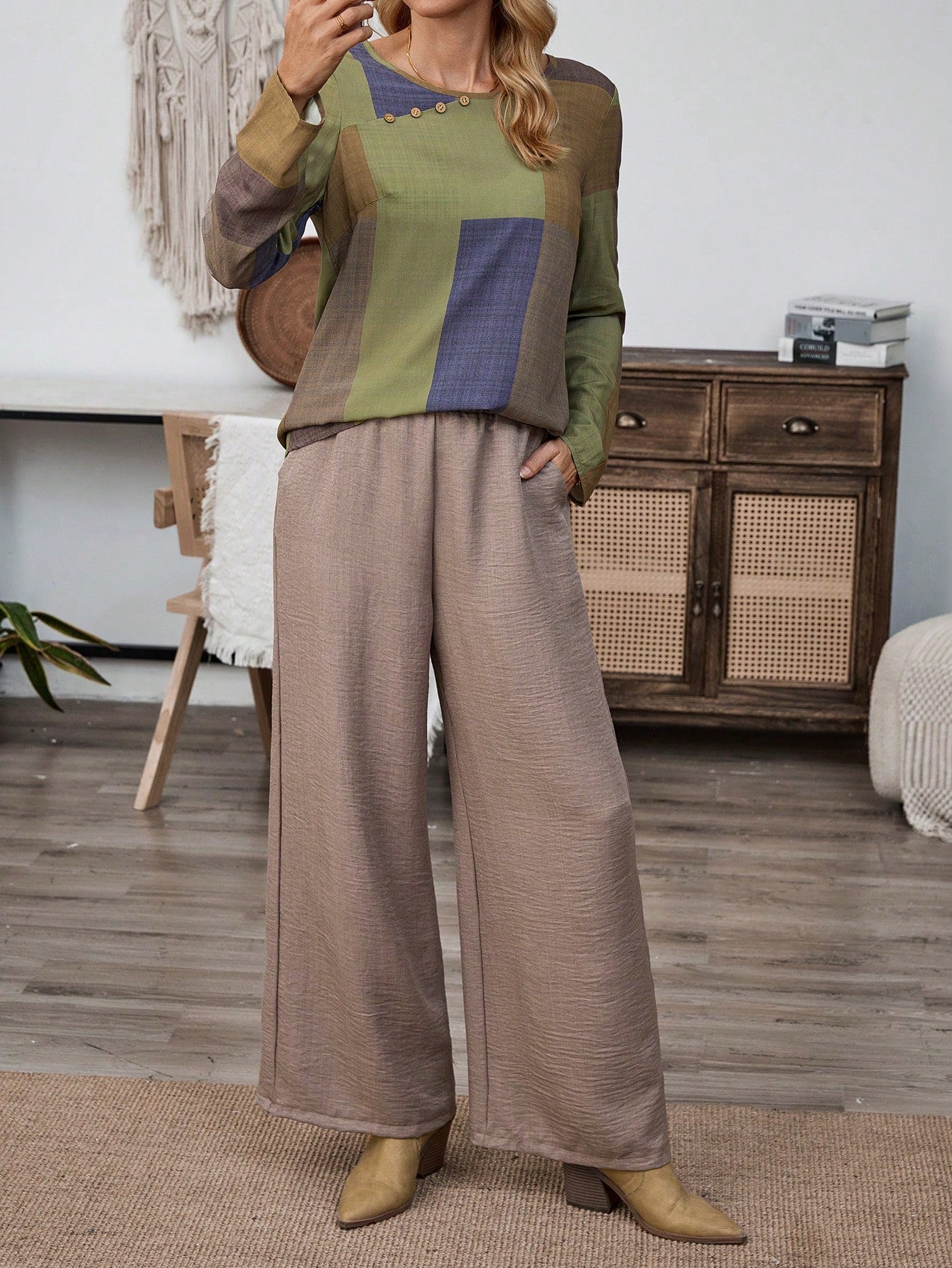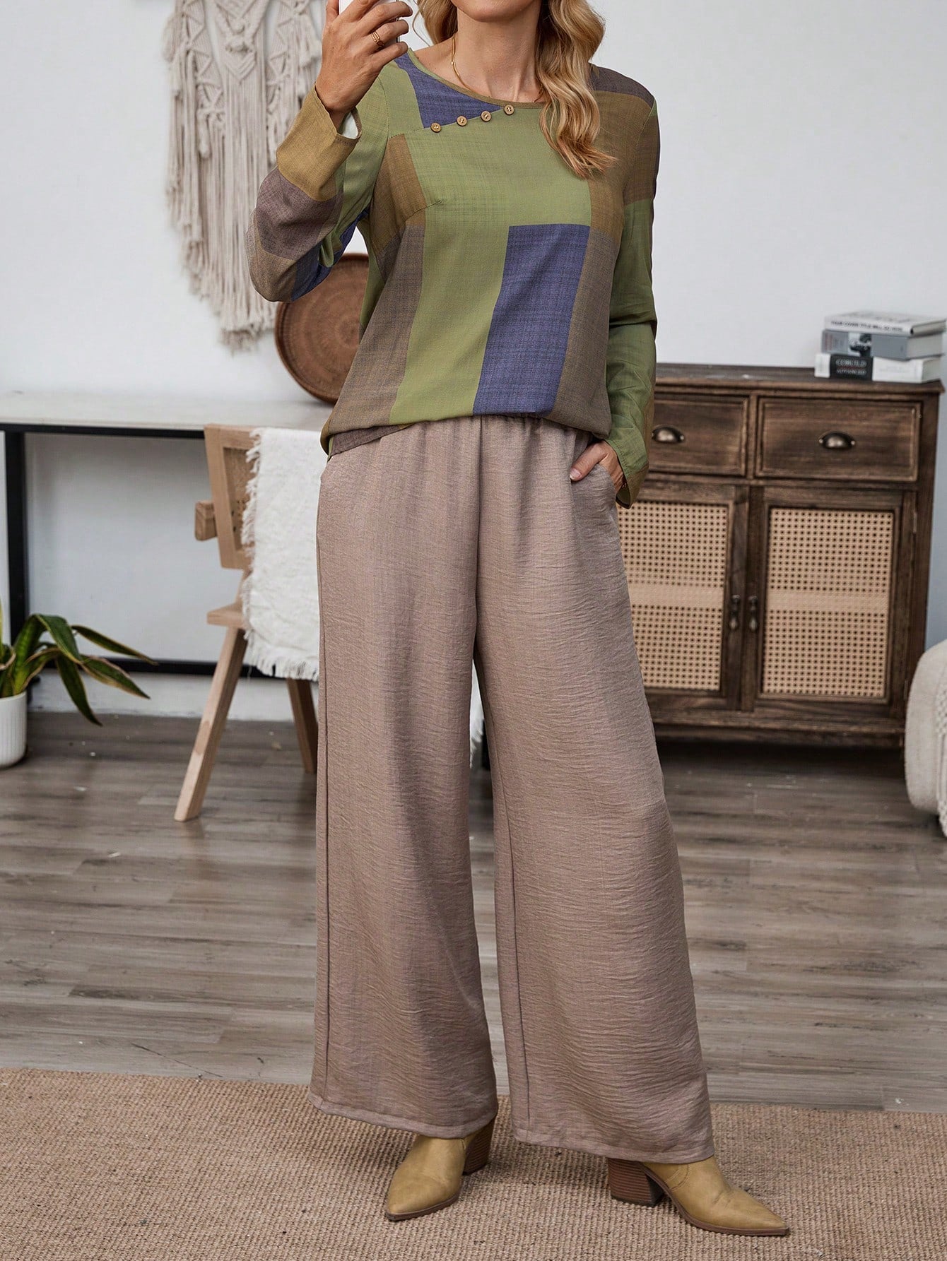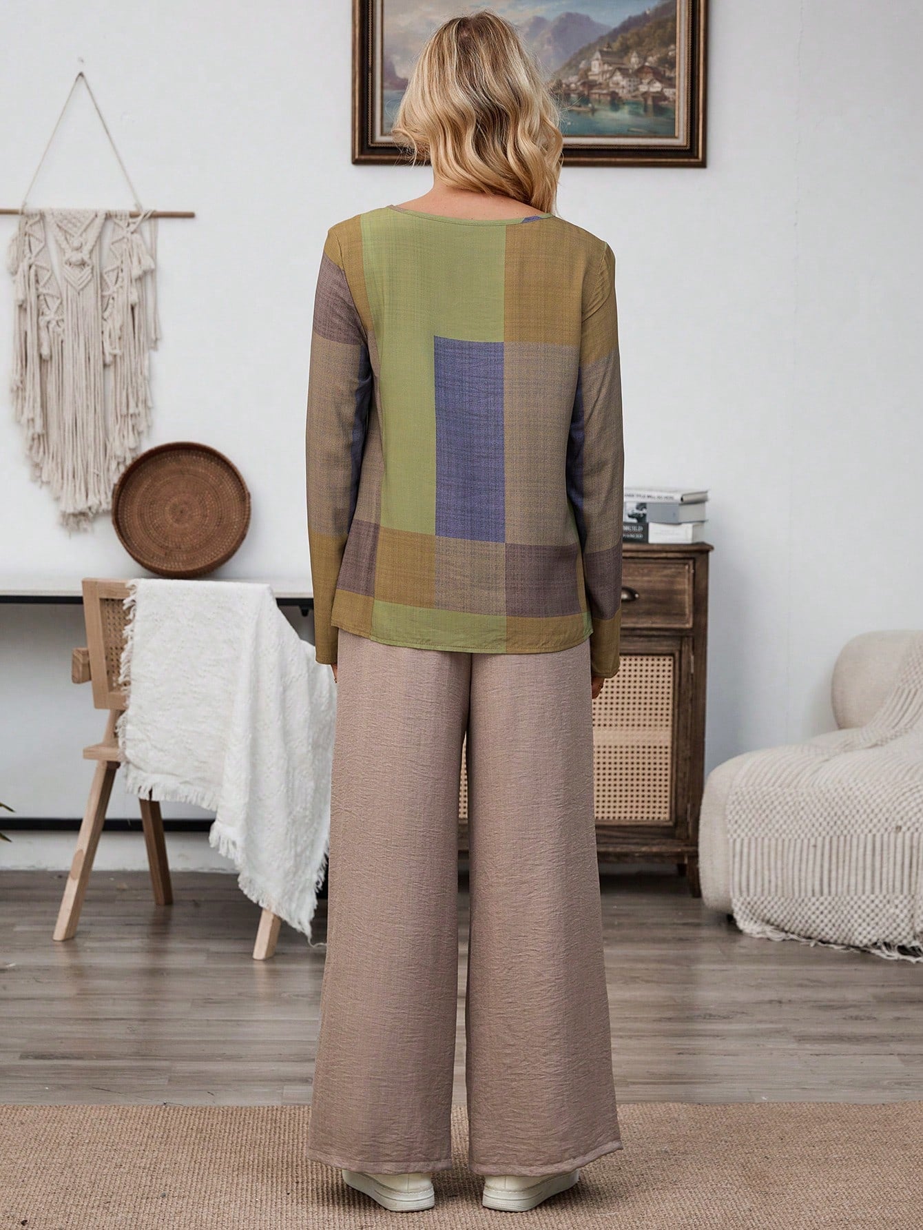 EMERY ROSE 2pcs Casual Women Color Block Patchwork Long Sleeve Top And Long Pants Set, Autumn