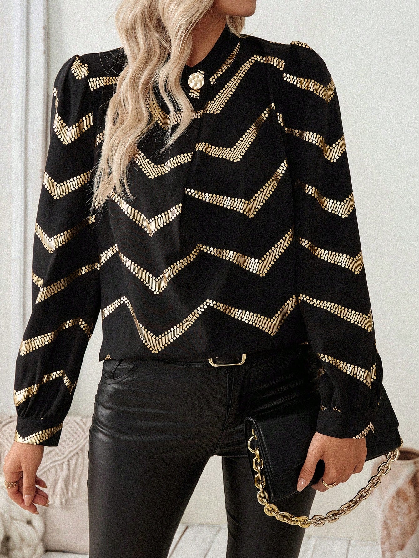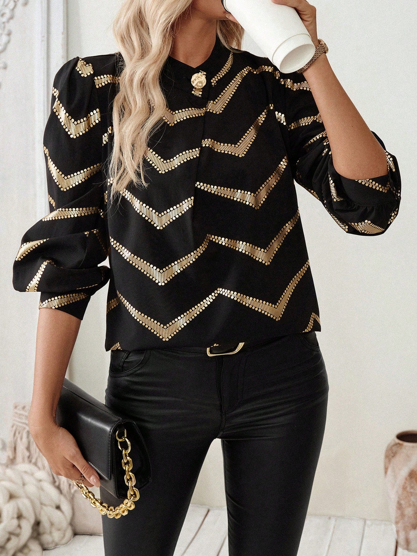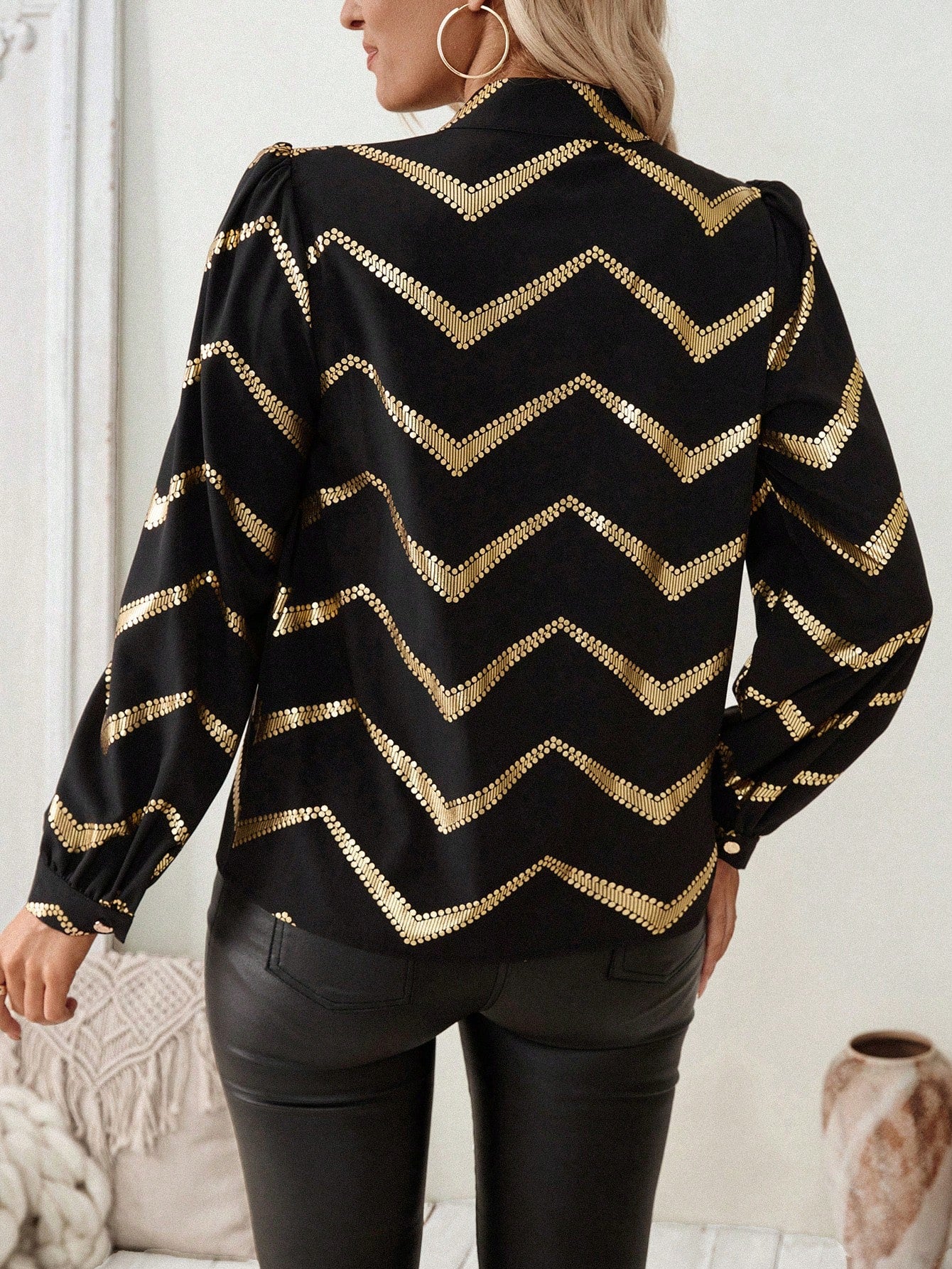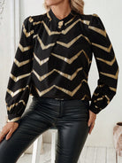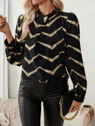 women EMERY ROSE Women's Elegant Collar Inlay Design Metal Button Foil Print Long Sleeve Shirt