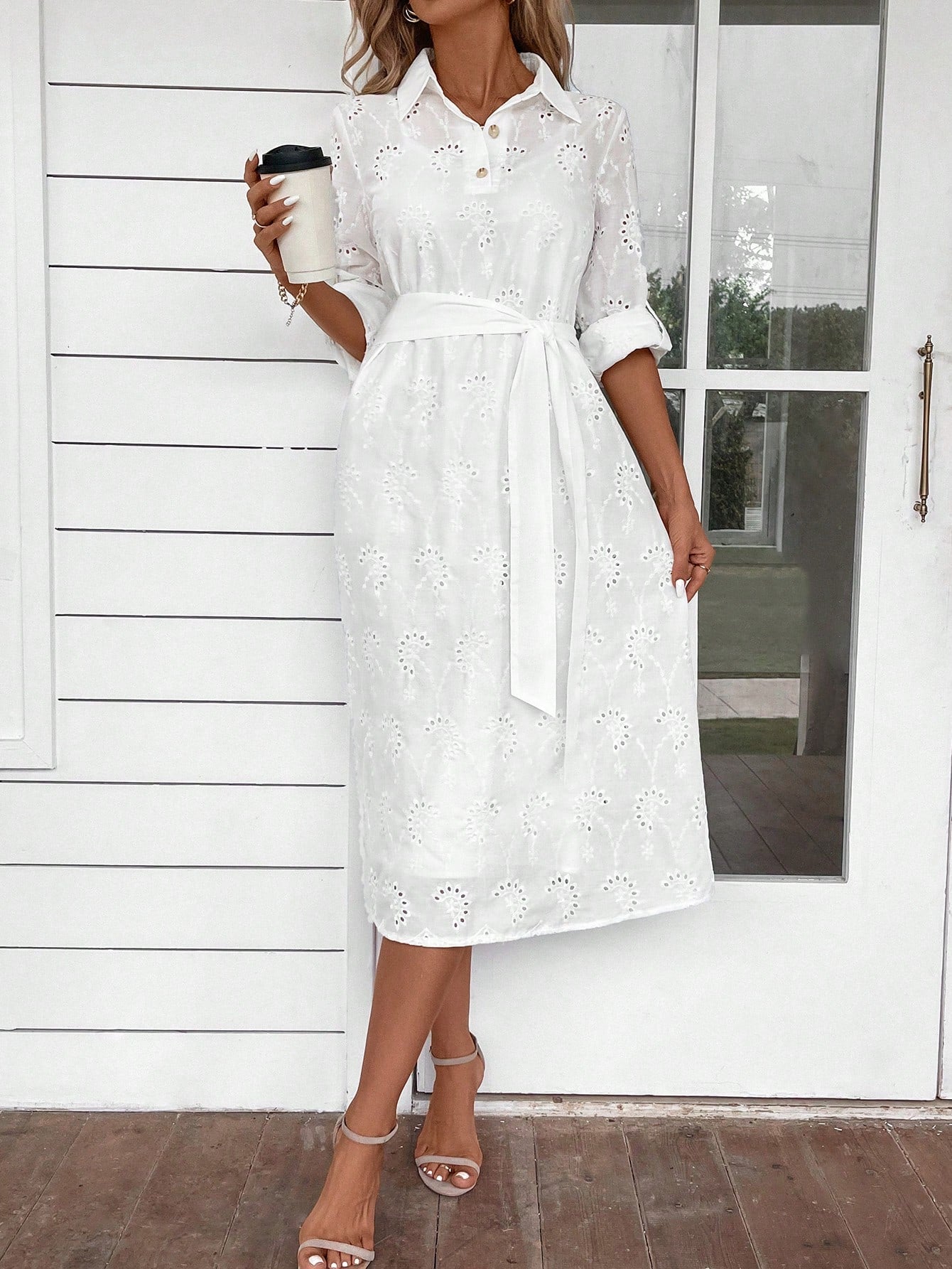EMERY ROSE Women's Solid Color Roll Tab Sleeve Chiffon Dress Without Belt