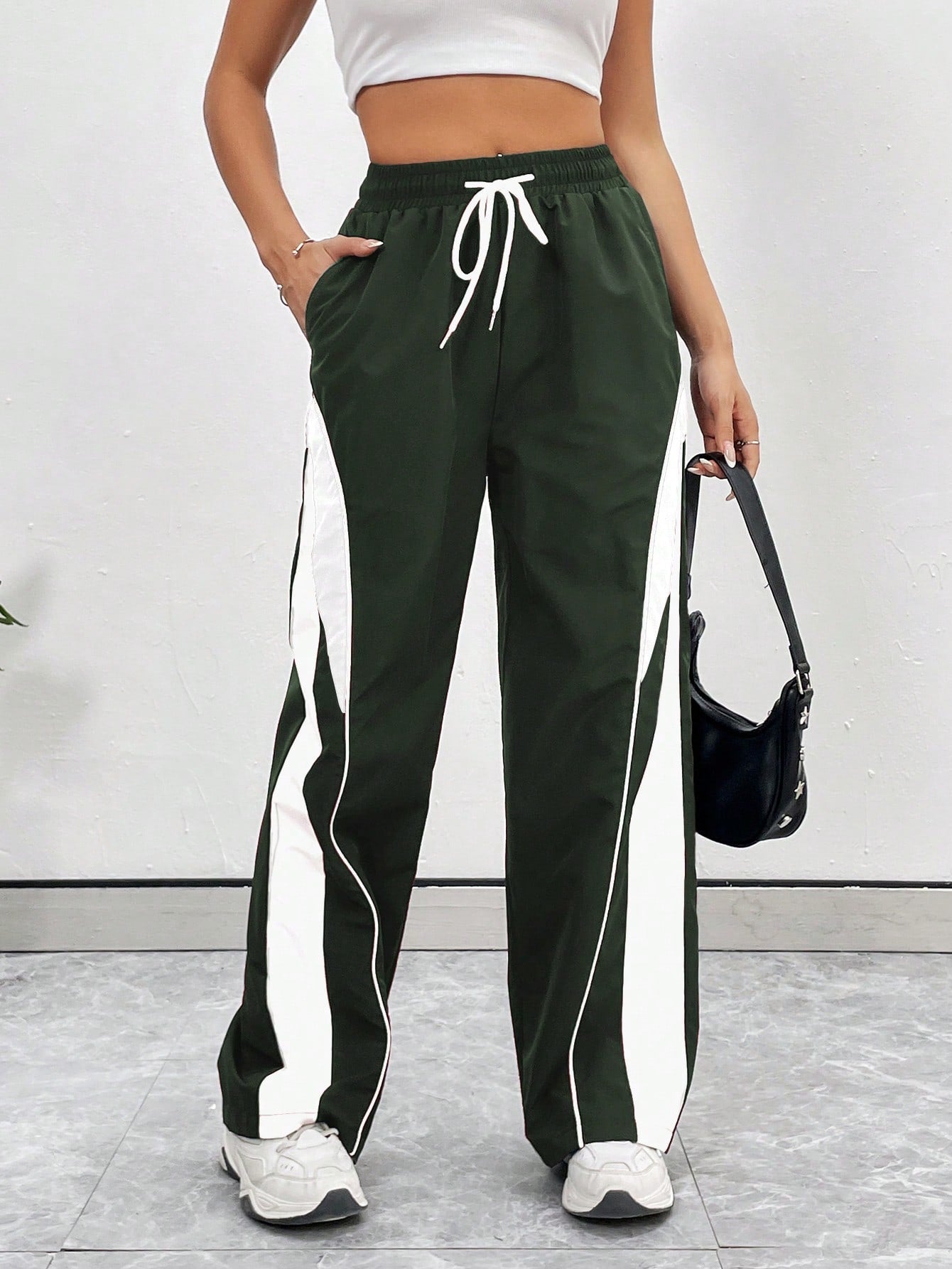 Flirla Contrast Color Pocket Drawstring Waist Casual Sports Pants, Spring/Summer, Campus Style