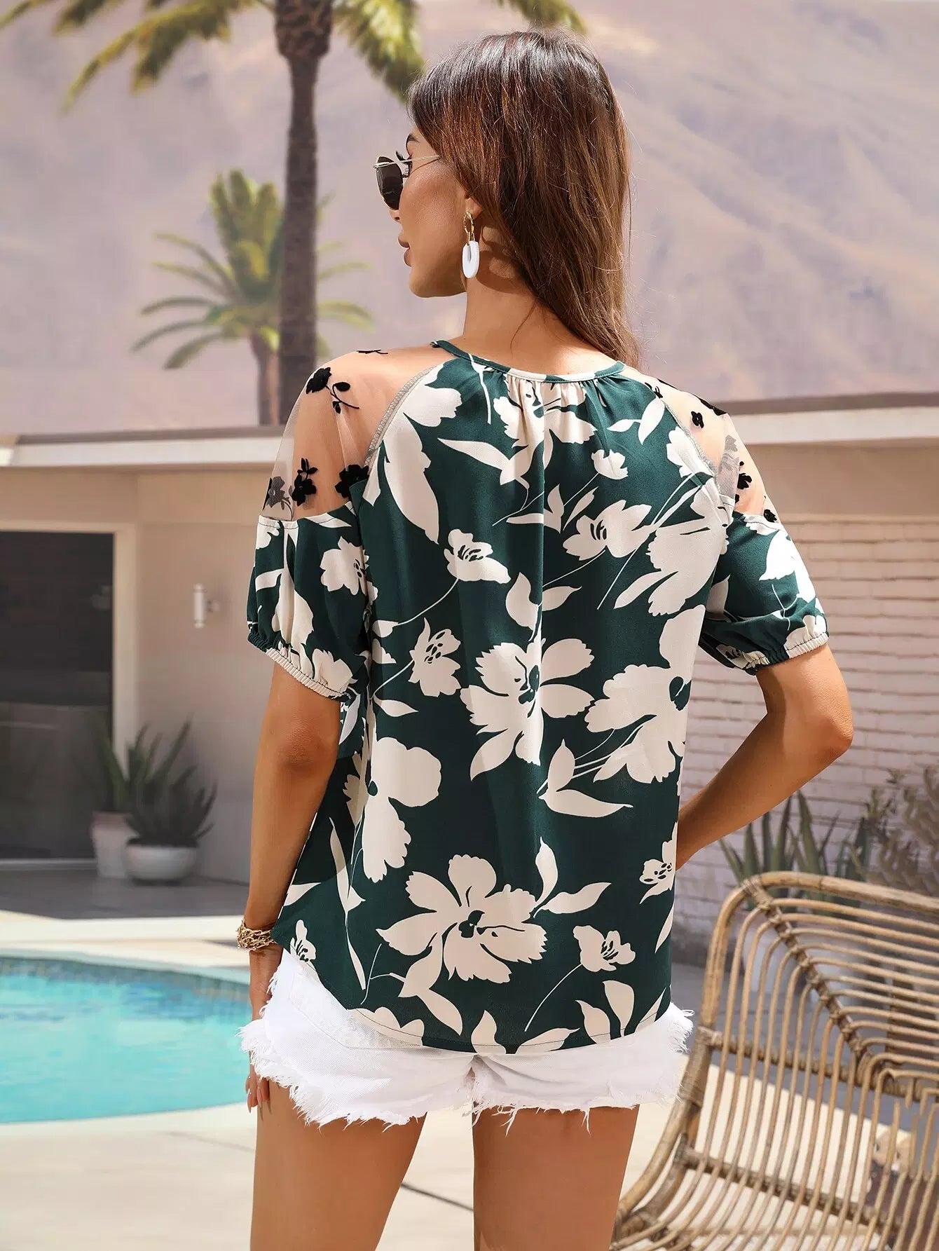 Floral Print Contrast Mesh Tie Neck Raglan Sleeve Blouse